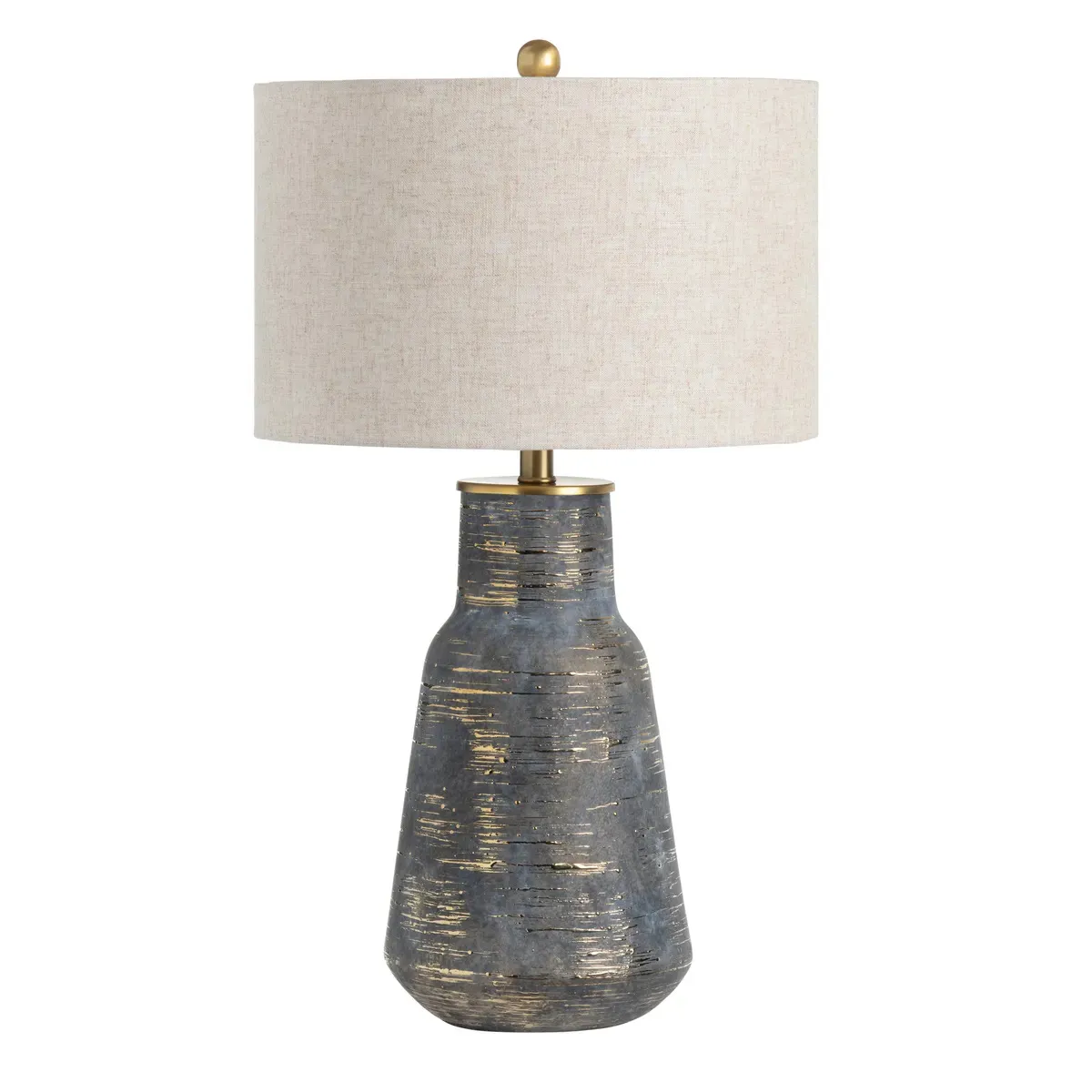 Crestview Collection's Trinity Table Lamp features a stunning vase-shaped ceramic with a matte charcoal finish, beautifully accented with gold stria highlights that add a touch of luxury. The natural linen shade emits a soft glow.