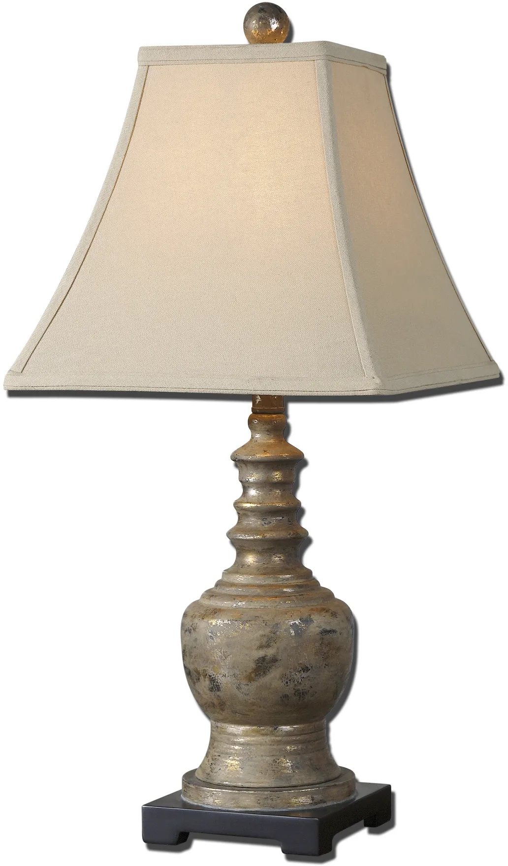 Metal base finished in a heavily antiqued taupe gray wash with golden champagne undertones and black distressing. The square bell shade is a beige linen fabric.