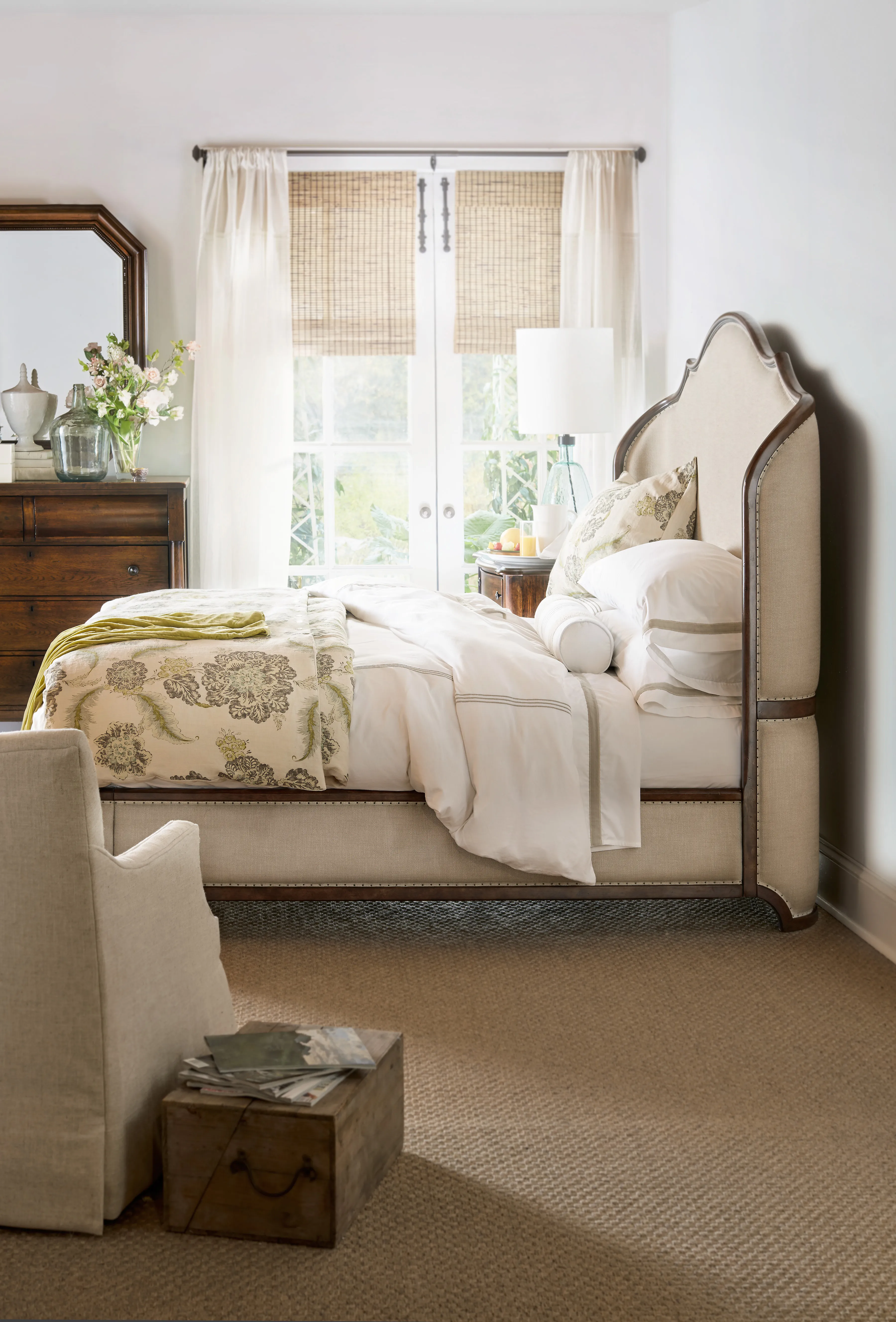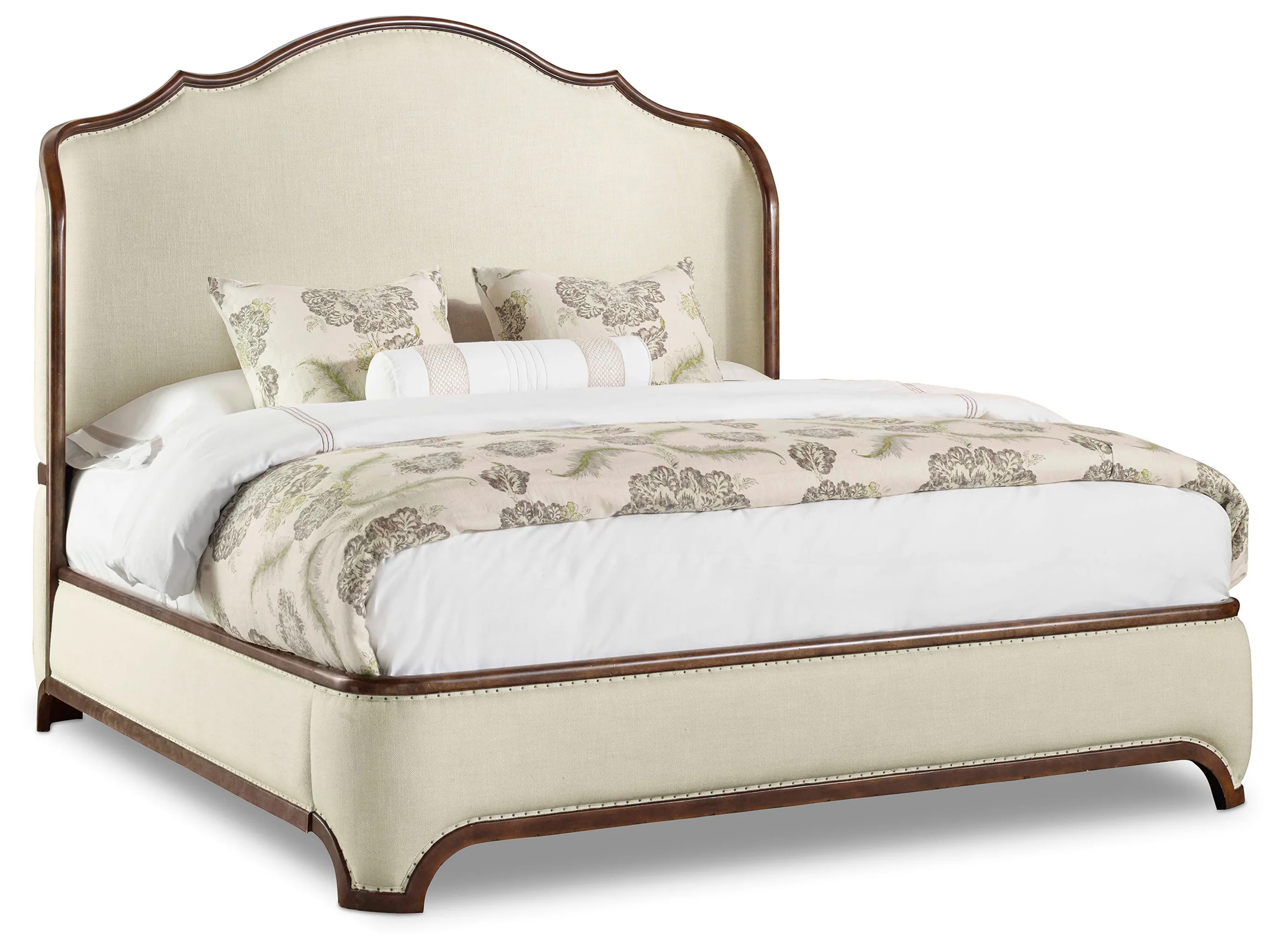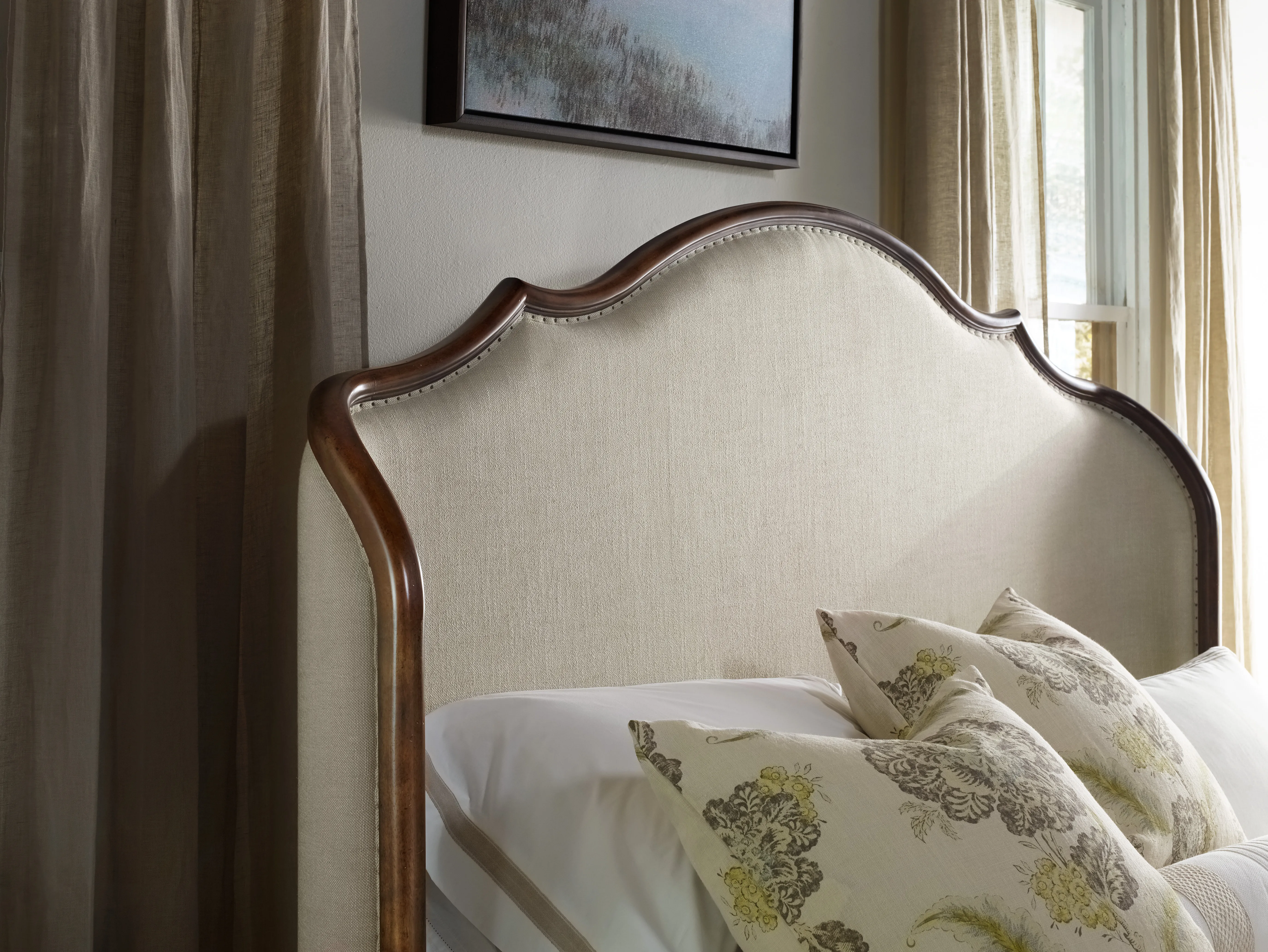 Exuding a larger-than-life ambience, the romantic Archivist King Upholstered Shelter Bed has shaped wood and upholstery tack trim around the upholstered headboard, rails and footboard. A statement piece of tasteful style, the graceful Archivist bed silhouette features a soft casual pecan-colored finish with a rustic character that contrasts beautifully with the Aubergine Linen cream-colored upholstery fabric.