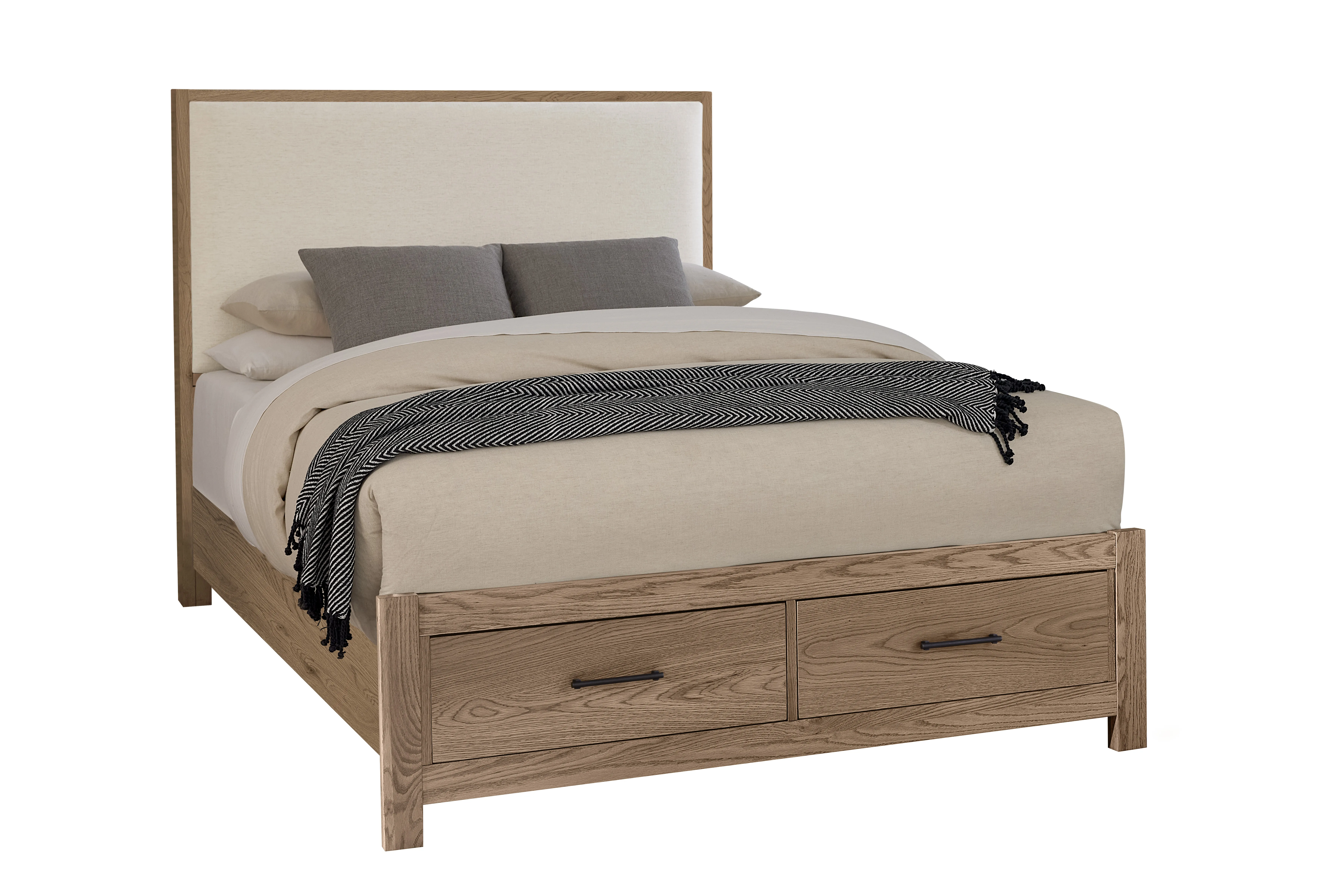 Wood Trim Upholstered Storage Bed offers a tailored; contemporary appeal. Features an upholstered headboard with oak wood trim covered in Ivory Cream Performance fabric. It is easily cleanable; stain-resistant; and durable enough to withstand the wear and tear of everyday life.