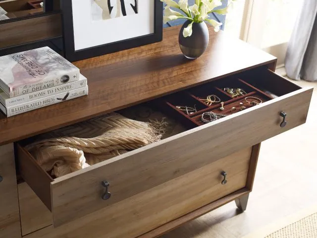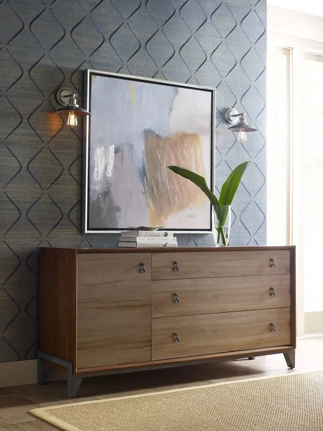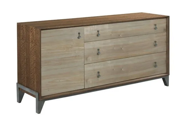Nouveau dresser with walnut framed panels and ambrosia maple drawer fronts with metal base adds to the appeal of this great storage piece with drawers and door storage.