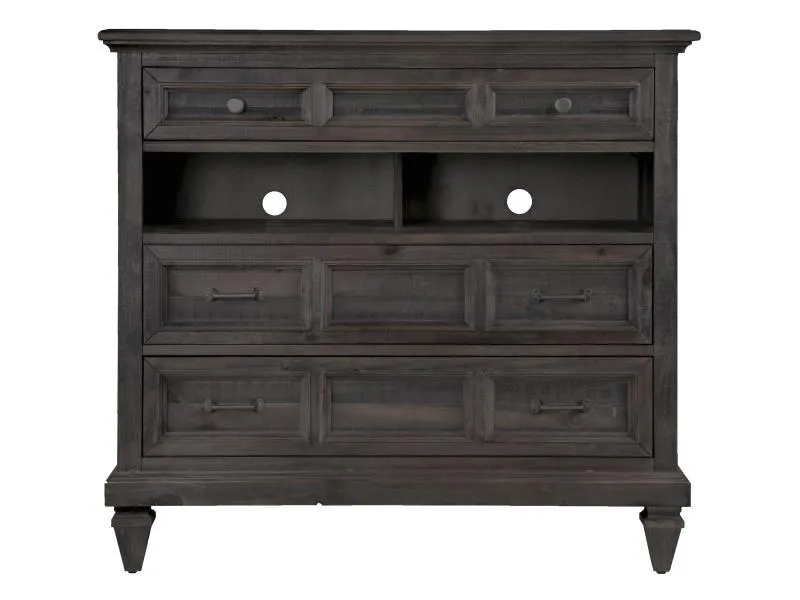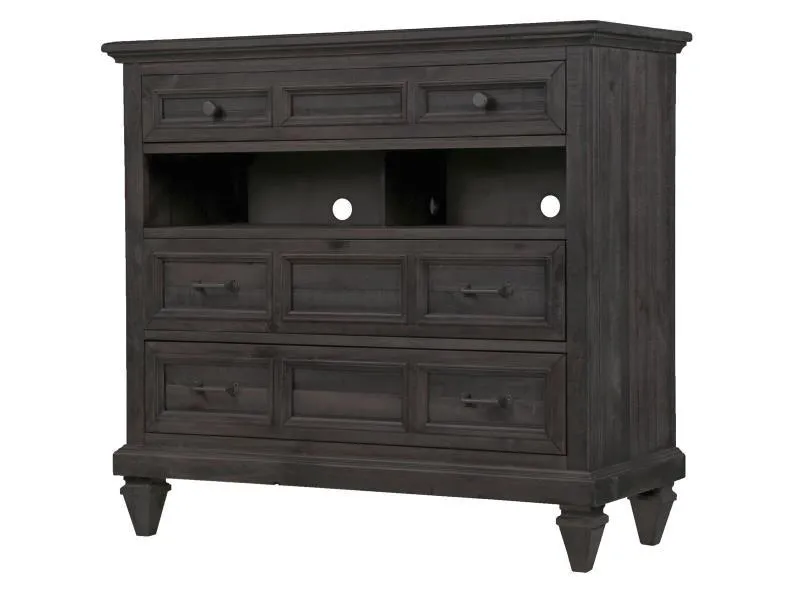 Inspired by the Inns and Wineries in the Napa Valley, the Calistoga Bedroom Collection exudes the ambience of region. Its distressed charcoal finish and brushed pewter hardware mix effortlessly with graceful curves and soft details to create a look that is bold yet refreshing. Touch lighting on all night stands, side mounted ball bearing glides, dust proofed, English and French dove tailed drawer construction, and top drawers with felt lined bottoms are standard Magnussen Home features. Relax, unwind, and pretend that your biggest decision of the day is whether to try red or white. Finish: Weathered Charcoal