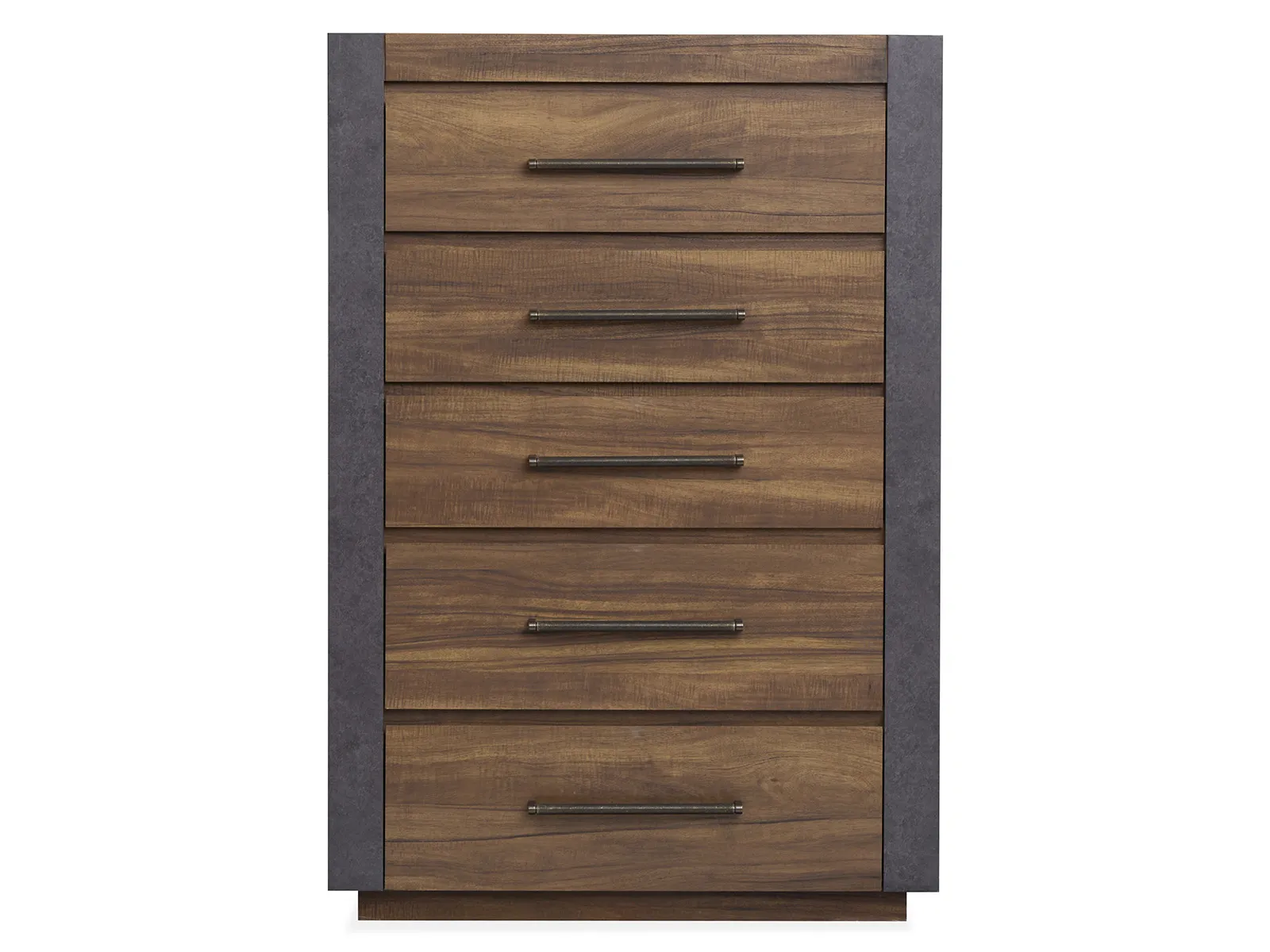 The Jensen Collection embodies the raw and edgy appeal of modern industrial style and featuring a Tavern Brown finish paired with Verona Bronze hardware for a rugged and utilitarian look. The casegoods showcase the perfect balance of wood and aged metal laminate and creating a striking mixed-media effect with bold and masculine lines. Set-back rails on the case fronts enhance the industrial aesthetic and adding depth and visual interest. Perfect for those seeking a bold and industrial-inspired retreat and the Jensen Collection will bring a dynamic and modern edge to your bedroom.