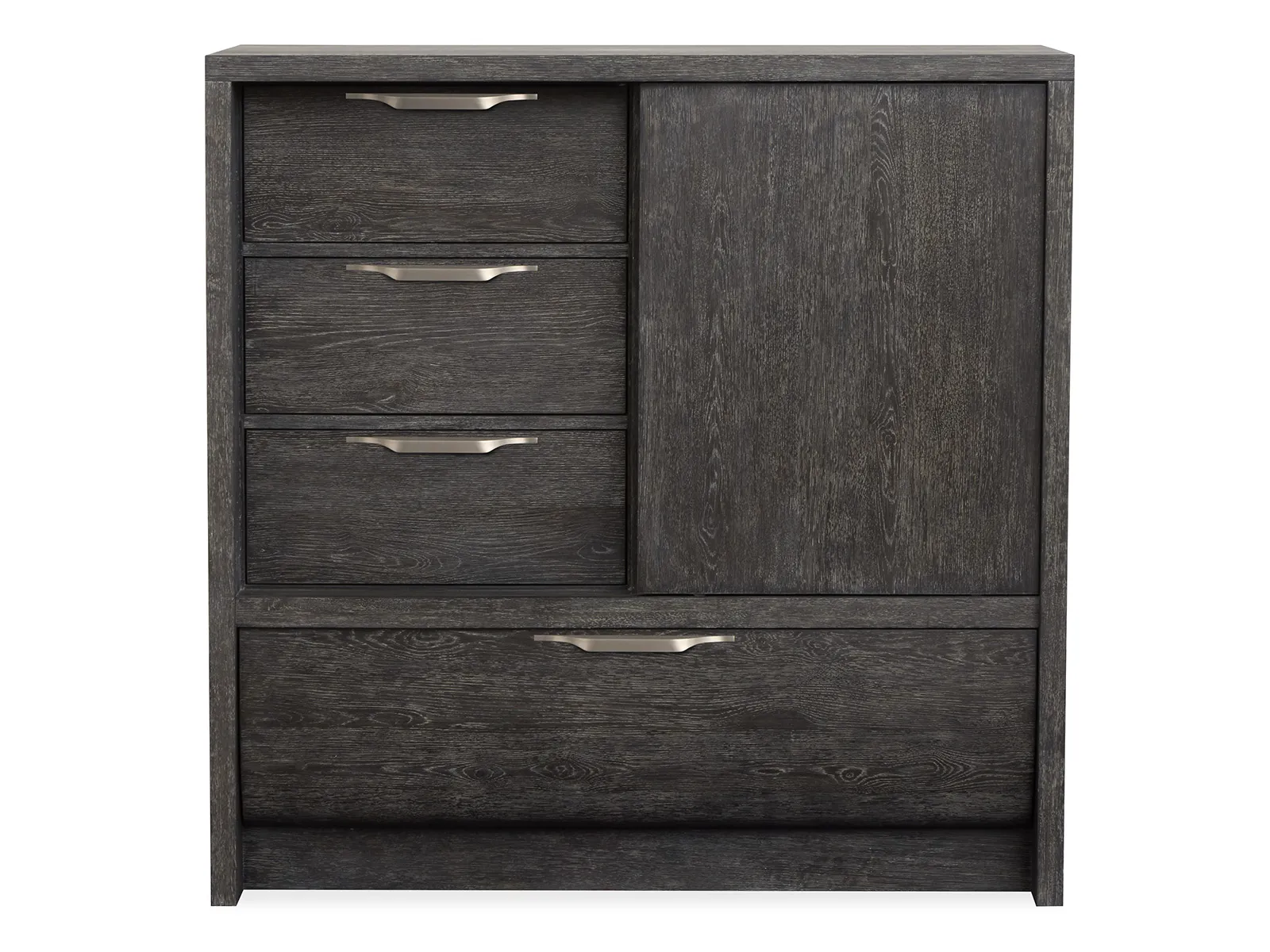 Introducing Kinsley and a striking centerpiece for any modern contemporary home. This collection features sleek and clean lines and practical functionality that blend seamlessly with its stylish design. The Black Heron finish and complemented by Oslo Pewter fabric and Satin Nickel hardware and adds a touch of elegance and sophistication. Its contemporary style makes it an ideal fit for minimalist and chic interiors and enhancing the overall aesthetic of your living space. Crafted from random flip and slip flakey oak veneer hardwood solids and the Kinsley promises both durability and refined beauty.