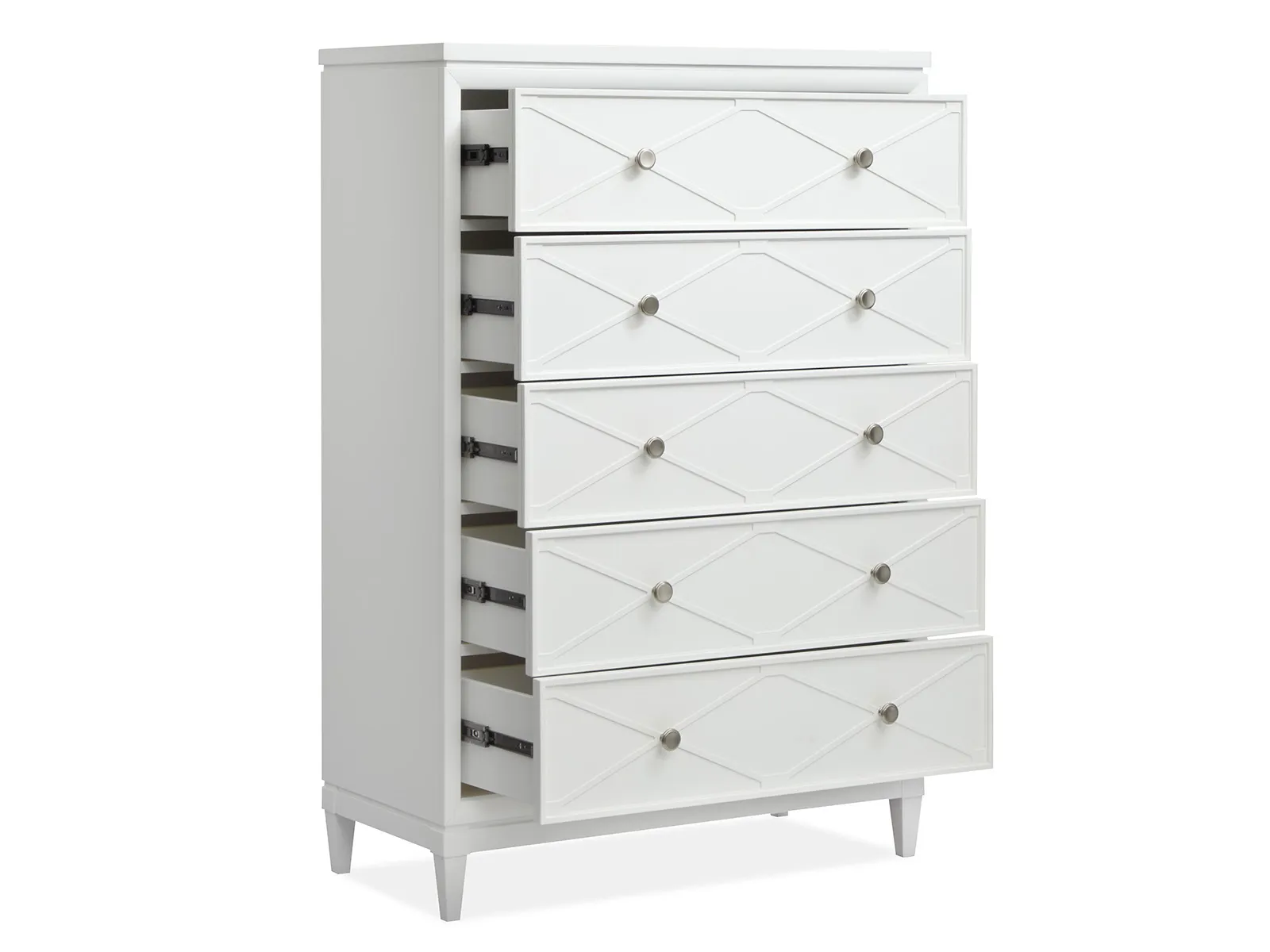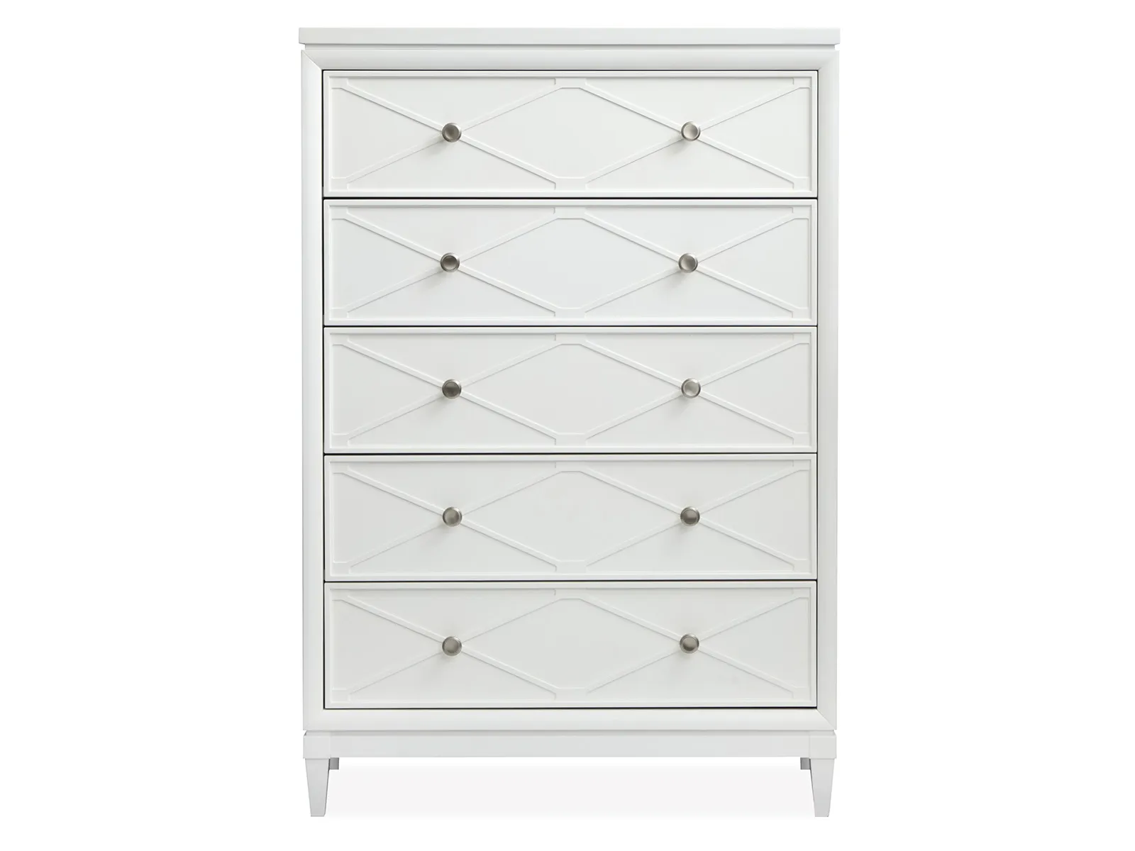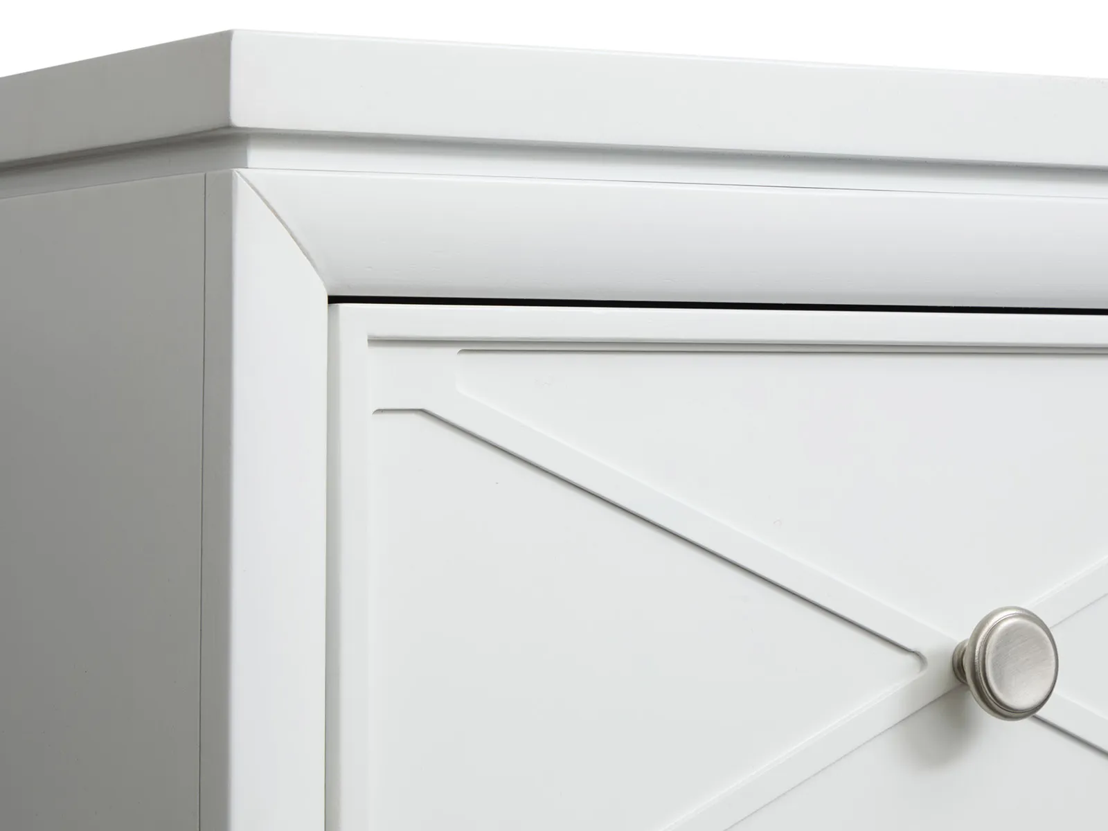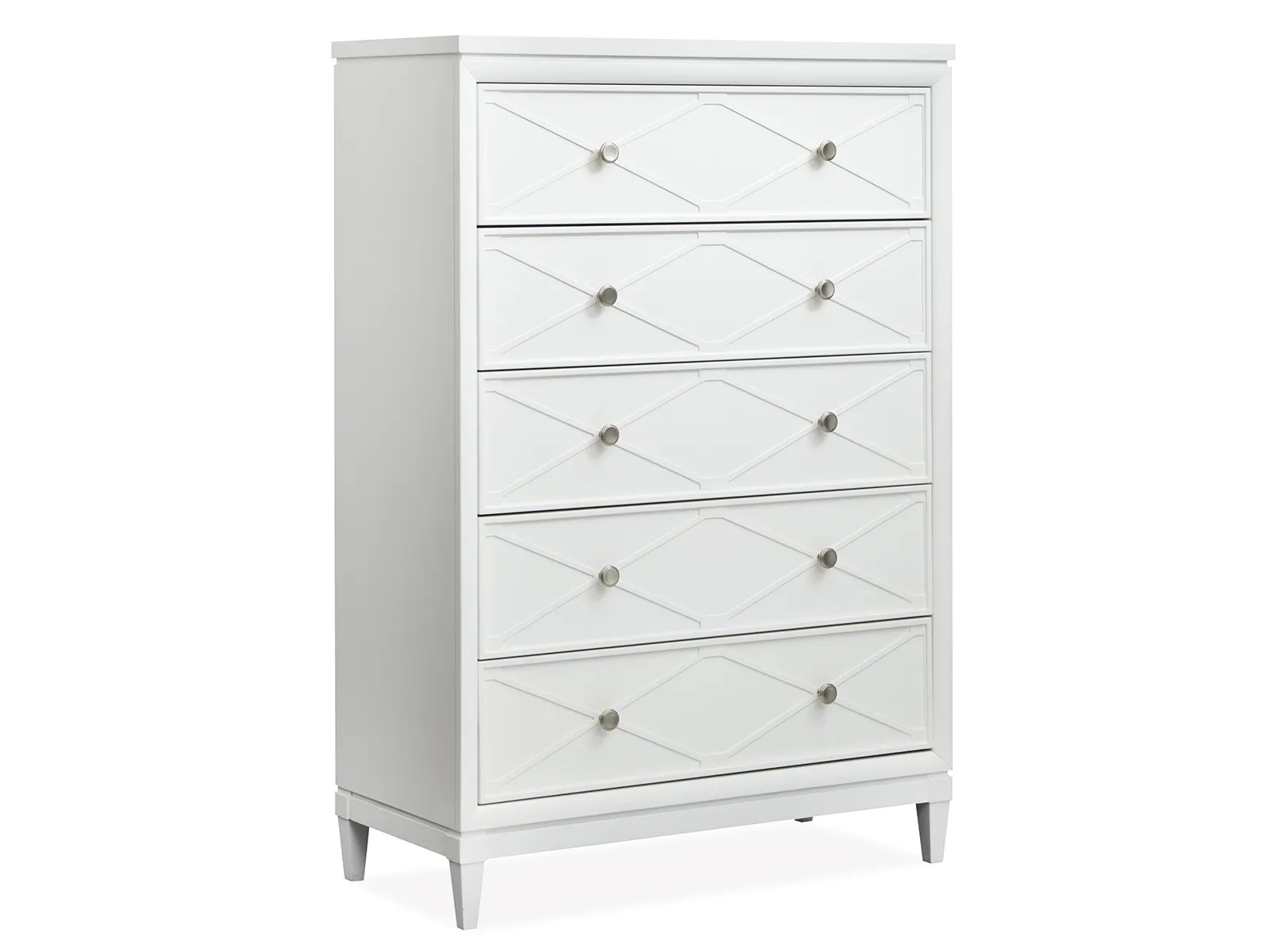 The Springhouse Collection is a refreshing take on cottage and coastal and and modern farmhouse design and featuring a clean Whisper White finish and refined Satin Nickel hardware. Its casegoods are thoughtfully crafted with decorative X molding details that add visual charm and while the small-scale nightstands are perfectly sized for second bedrooms or cozy spaces. The upholstered bed options provide a soft and inviting centerpiece and complementing the feminine touch of the delicate knobs. This collection offers a light and airy aesthetic that effortlessly enhances your bedroom and creating a serene and stylish retreat for your home.