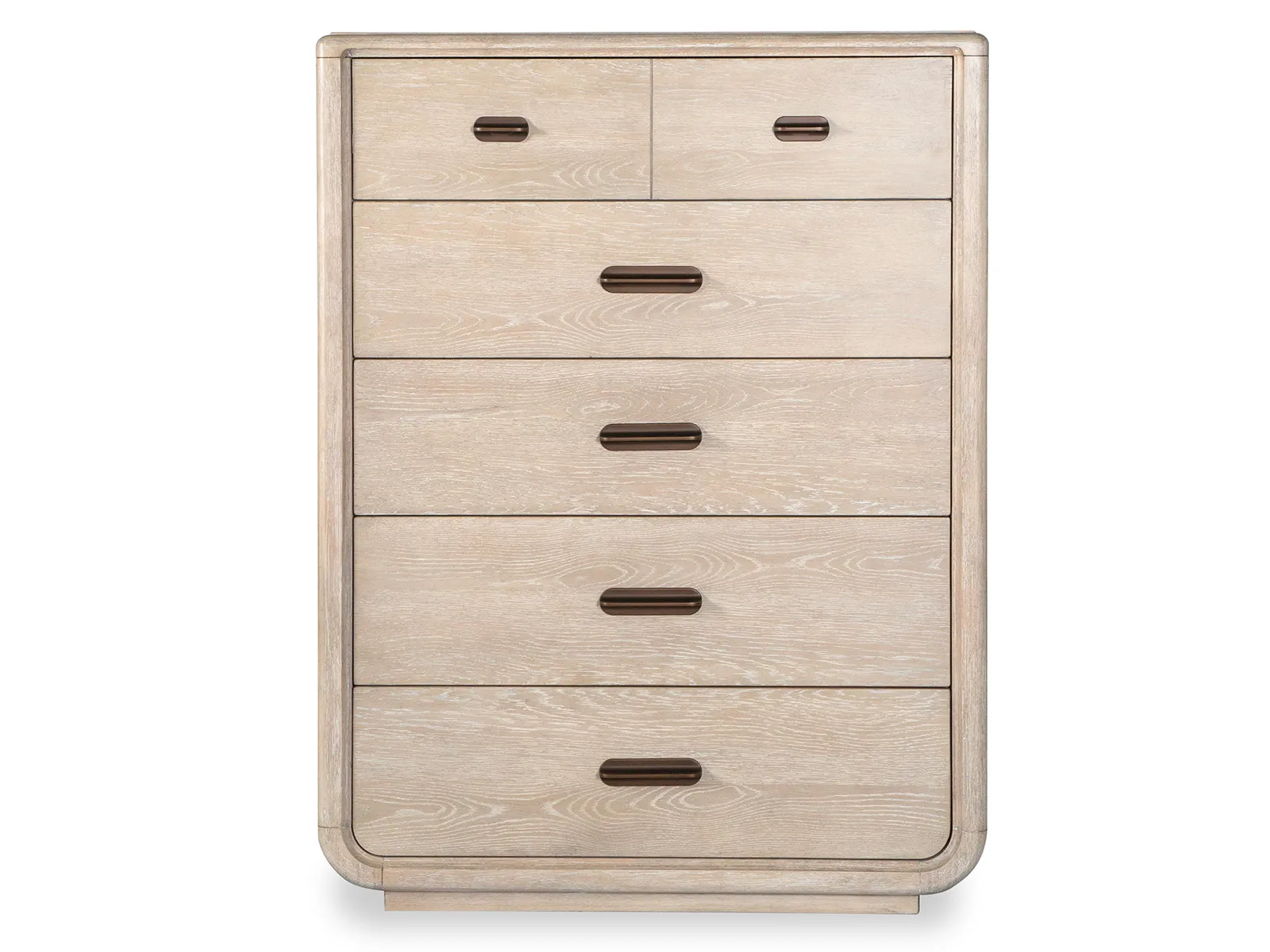 Design your ultimate bedroom retreat with the fresh and easygoing character of the Sunset Cove bedroom collection. Simplified shapes and rounded forms and softly curving corners define the character of these captivating designs. Each piece is expertly crafted of Cathedral White Oak veneer with hardwood solids and finished in a light and natural shade of Sanibel Brown accented with Dark Bronze hardware. Start with one of its statement-making beds to create a focal point and then choose your favorite storage pieces. With understated elegance and the group offers smart storage options distinguished by features such as paper cord-wrapped decorative accents and open and closed storage and and metal accents. An honest and straightforward expression of good design and Sunset Cove is hard to surpass.