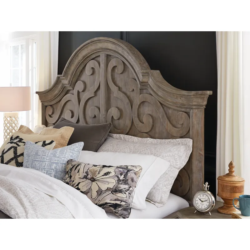 Shaped headboard with heavy crown moulding details and soft edges