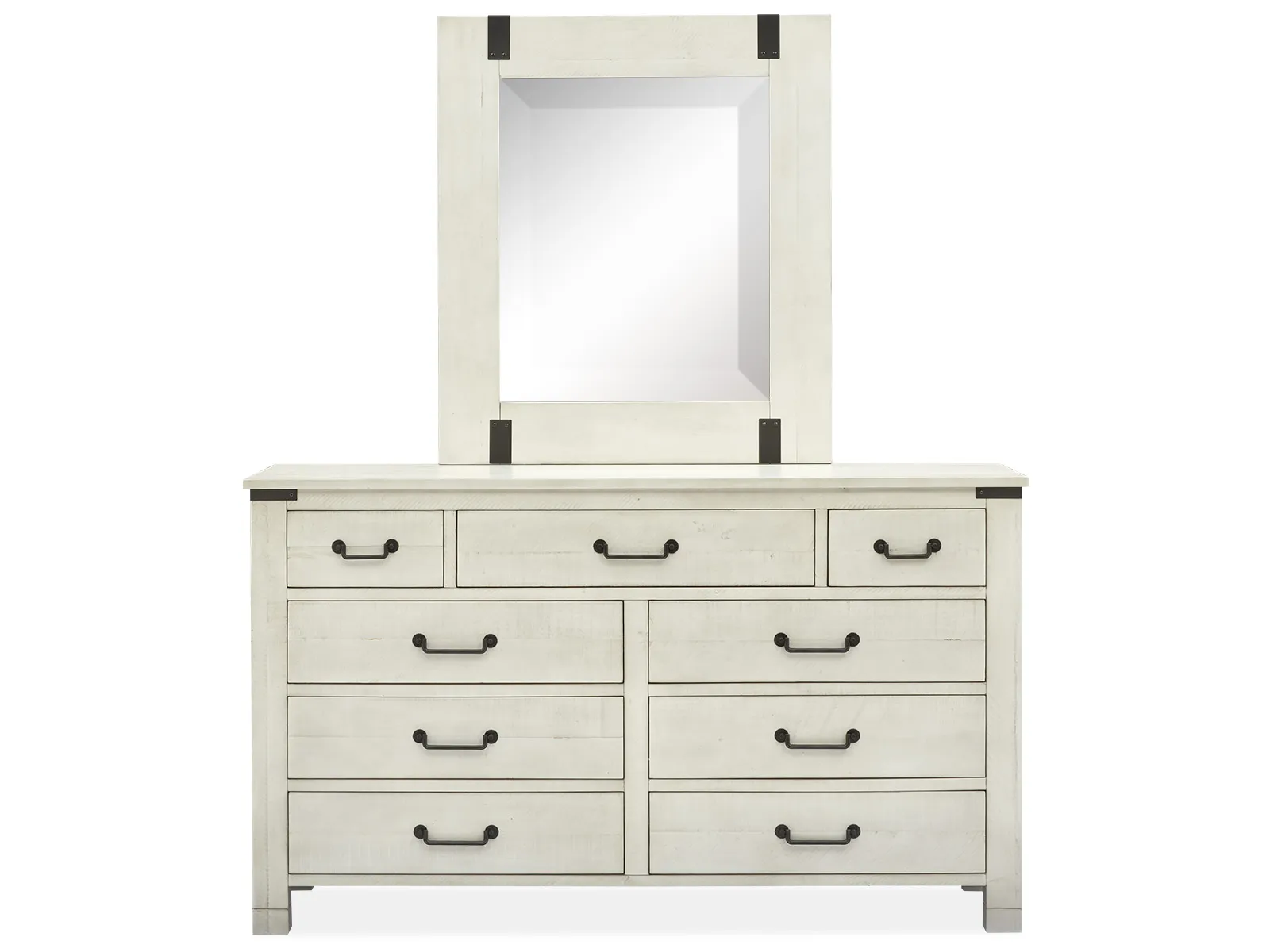 Is the perfect marriage of rustic charm and industrial edge and the sophisticated Chesters Mill Bedroom Collection would work in a loft in the mountains and in a home in the suburbs. The bright Alabaster finish on each frame — constructed of pine solids — is complemented by Aged Iron hardware for a look that’s modern and refined. Nine bed options are available in this collection and including three sizes of a knockout poster bed with an open canopy and as well as three sizes of a panel bed with optional storage underneath. The panel beds feature handcrafted metal detailing and providing additional handsome detail. Casegood pieces and including chests and nightstands and a dresser and a mirror and echo the industrial design with fresh forms highlighted with large bale pulls. A highlight is the unique Door Chest with sliding door and reminiscent of an old warehouse or barn and which is complete with two shelves and six drawers and wire management capabilities. The nightstand options — one open with two drawers and a pull-out shelf on the top and and one closed with three drawers — both feature on/off touch lighting control and wire management. This collection is also available in a warm Rustic Pine as well as a Weathered Charcoal finish and providing even more design options. Choose Chesters Mill for a modern and light industrial look and watch your space be transformed.
