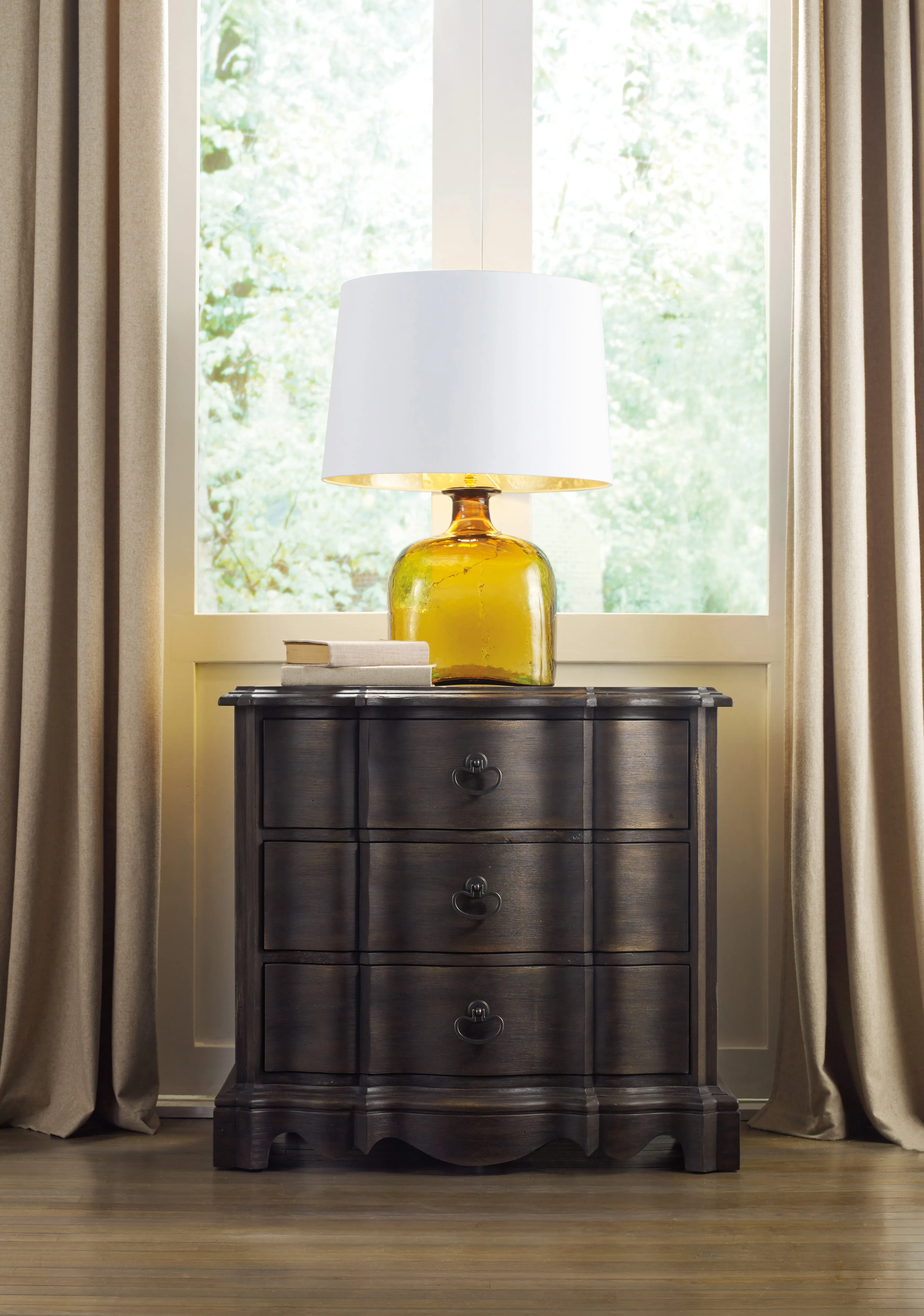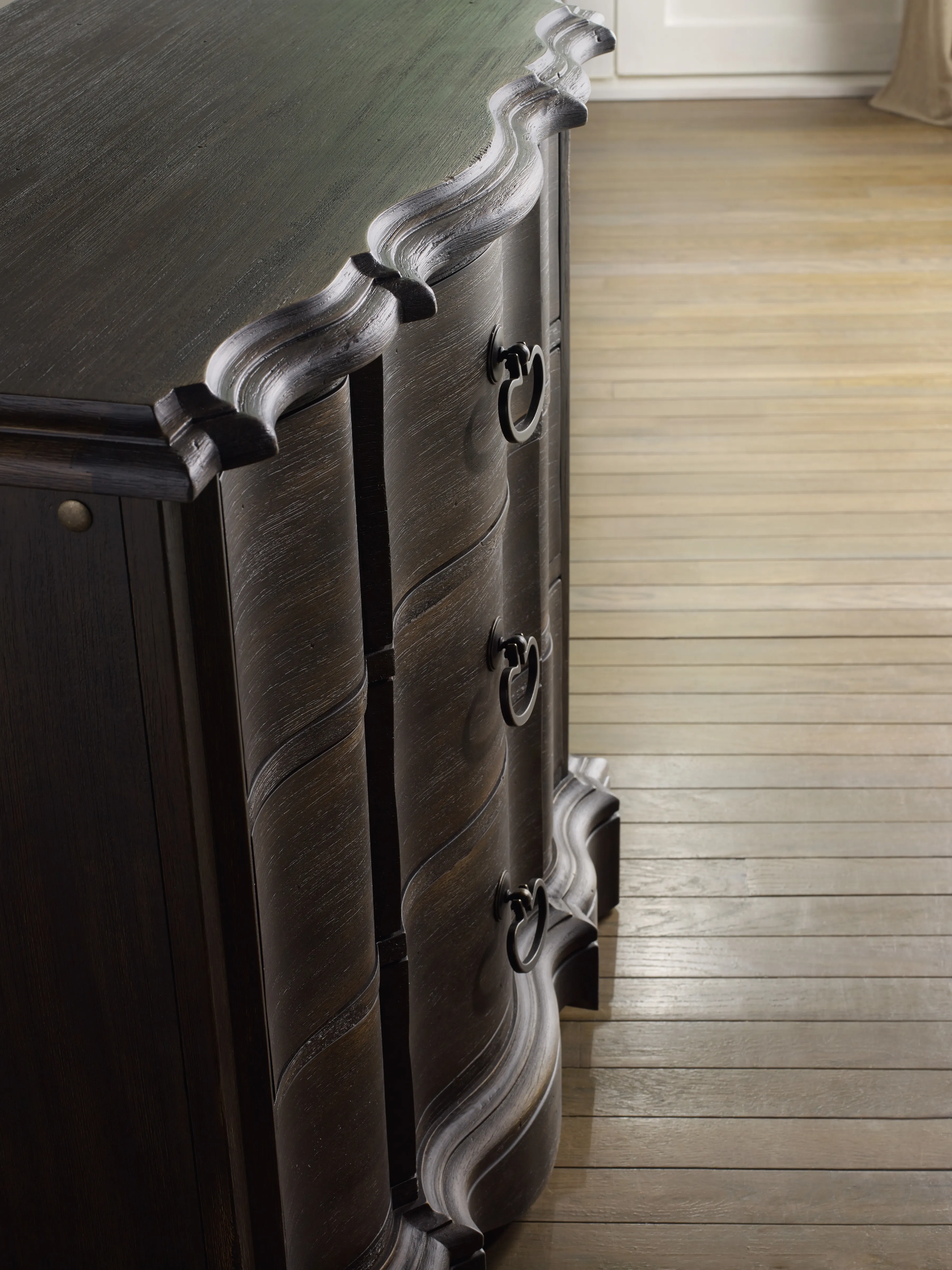 Graceful architectural elements of Italian, French and Belgian origin come together on the shaped silhouette of the Corsica 3-drawer nightstand with a scalloped base and ring-shaped burnished bronze hardware. The timeless nightstand is made casual by the wire-brushed, artisan espresso finish with a reclaimed character on exotic beautiful Acacia wood, known for its tactile hand, knots and organic color variations. The top drawer is felt-lined, and the bottom drawer is cedar-lined. A touch light that illuminates from the bottom of the nightstand offers ambience.