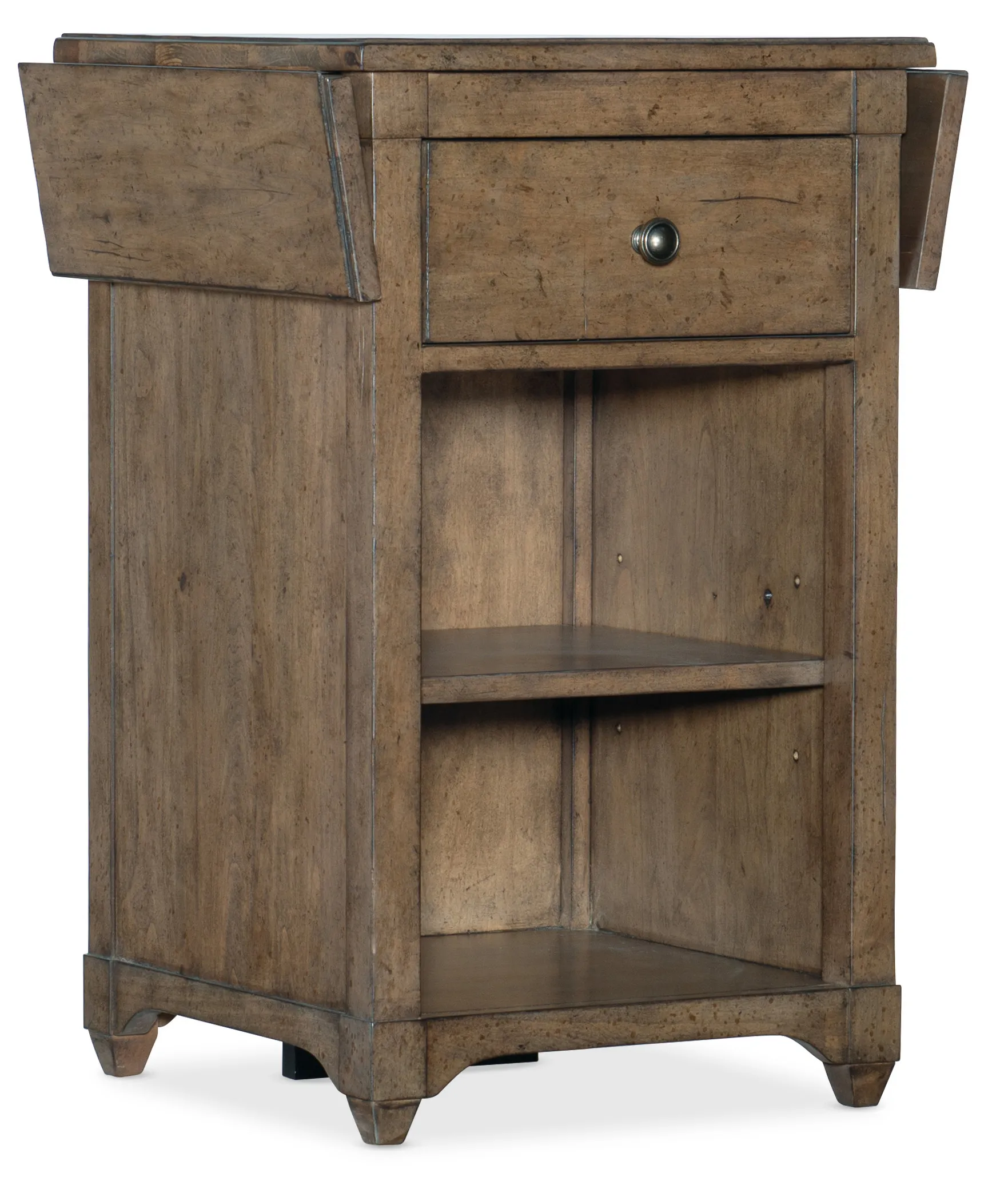 The Montebello Telephone Table exudes casual charm, with a fold-out expanding top and finished in Carob Brown, a traditional nutmeg-colored finish that is hand-planed and softened to create a naturally aged look. Constructed of Solid Alder and Poplar, the versatile table can be used for chairside, bedside or even in a hallway or kitchen. Features one drawer with self-closing undermount drawer guides and one adjustable shelf.