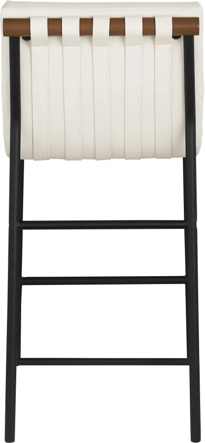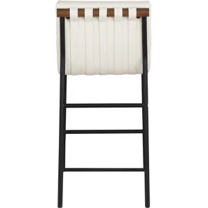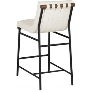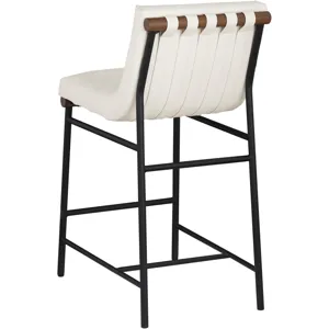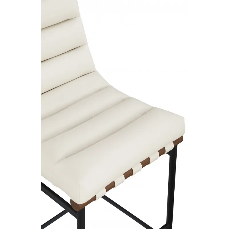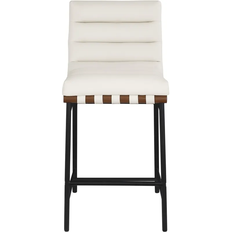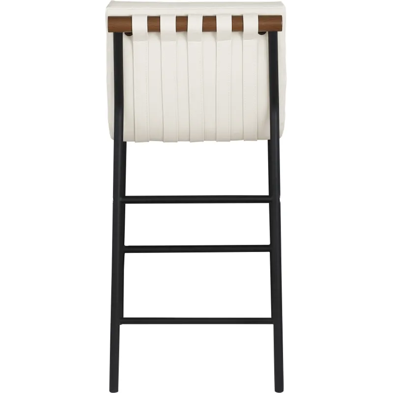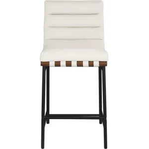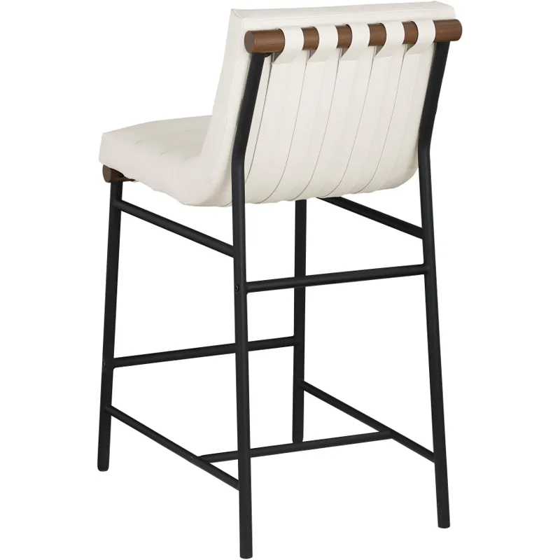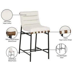 Whether at the home bar or the kitchen counter, this Burke cream vegan leather counter stool keeps guests comfortable while noshing on pancakes or sipping frosty beverages. Upholstered in soft cream vegan leather with cream vegan leather straps, this handsome counter stool makes guests want to stay till closing time. This counter-height stool has a matte black metal frame for sturdy support and a walnut wood veneer metal dowel for an added touch of stylishness. The vegan leather seat is easy to clean and maintain, so the stool keeps its beautiful look longer.