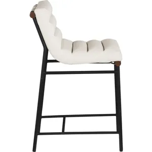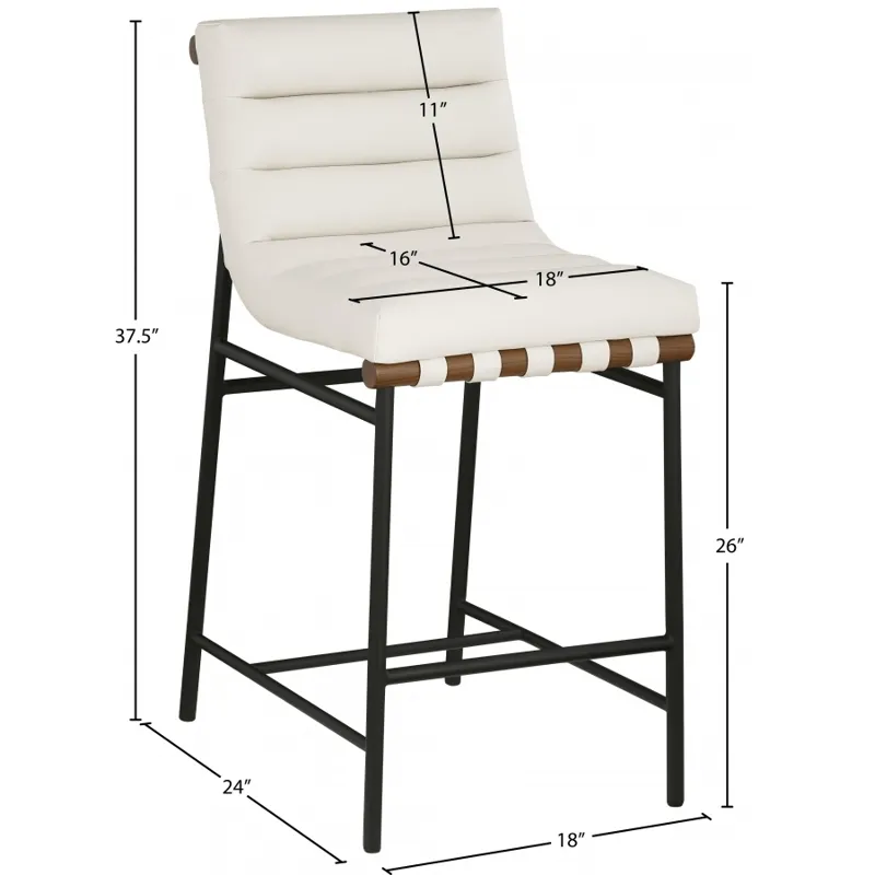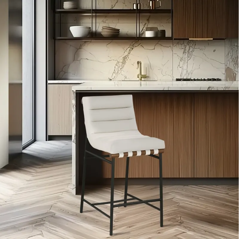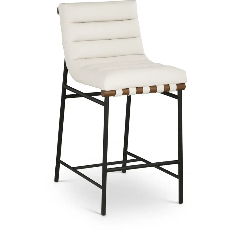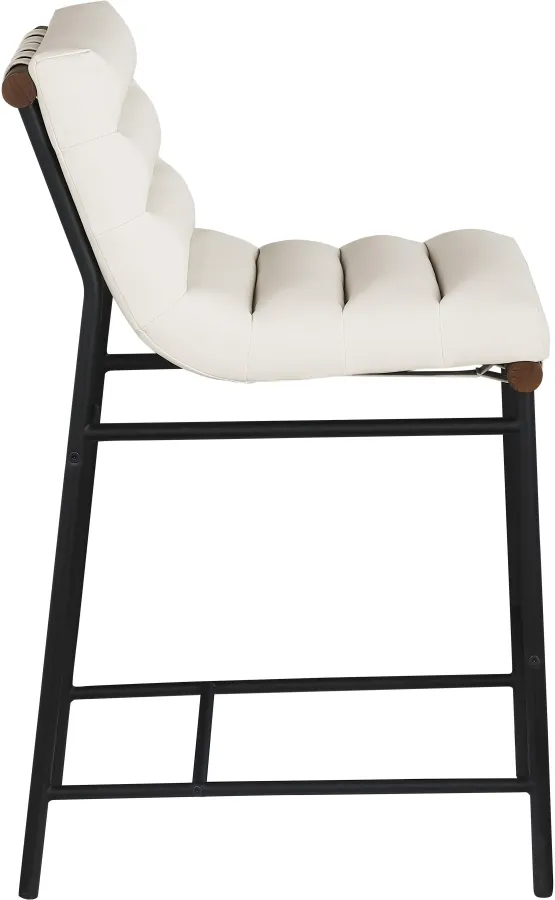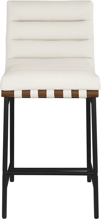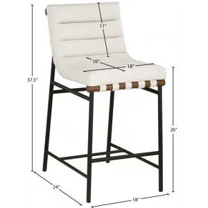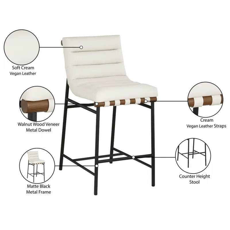 Whether at the home bar or the kitchen counter, this Burke cream vegan leather counter stool keeps guests comfortable while noshing on pancakes or sipping frosty beverages. Upholstered in soft cream vegan leather with cream vegan leather straps, this handsome counter stool makes guests want to stay till closing time. This counter-height stool has a matte black metal frame for sturdy support and a walnut wood veneer metal dowel for an added touch of stylishness. The vegan leather seat is easy to clean and maintain, so the stool keeps its beautiful look longer.