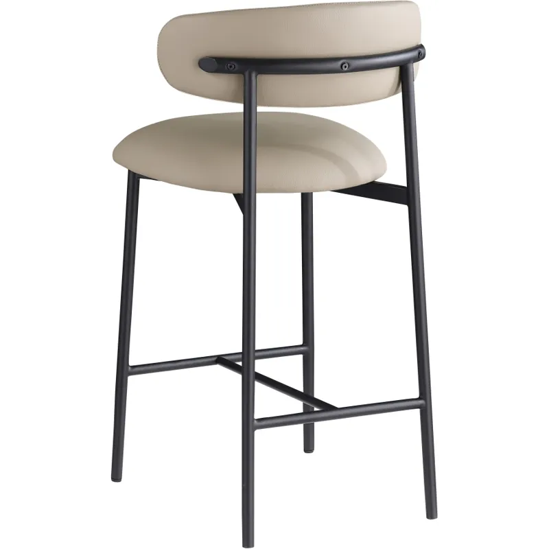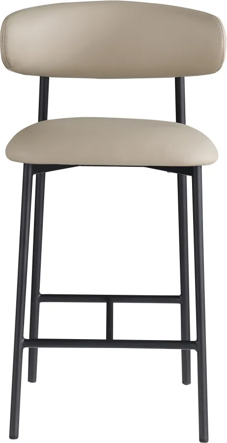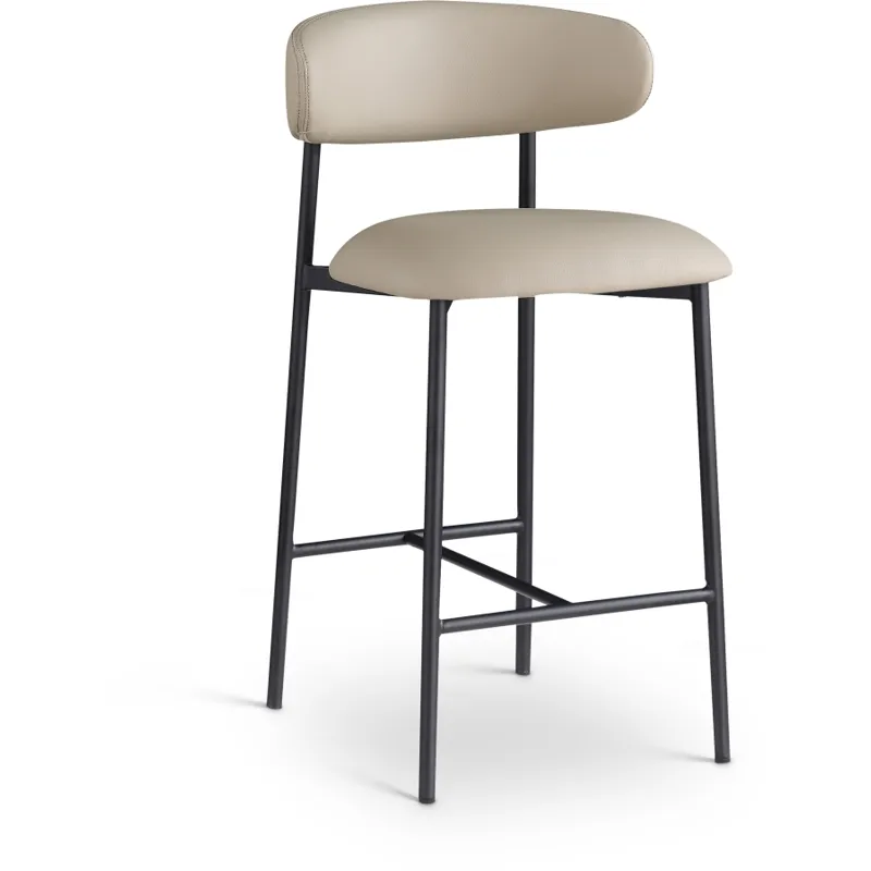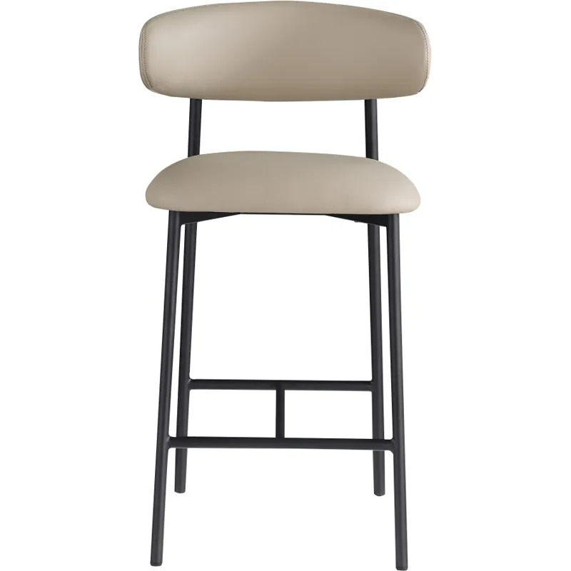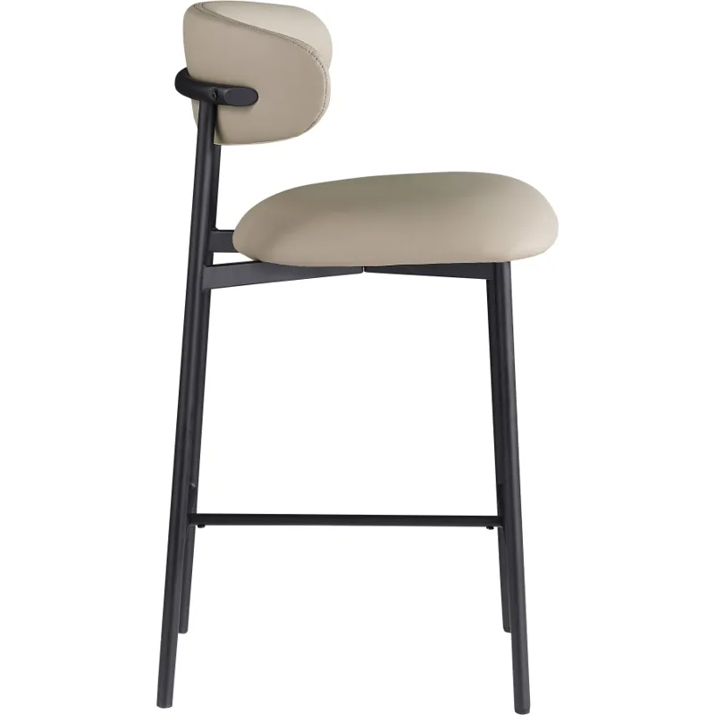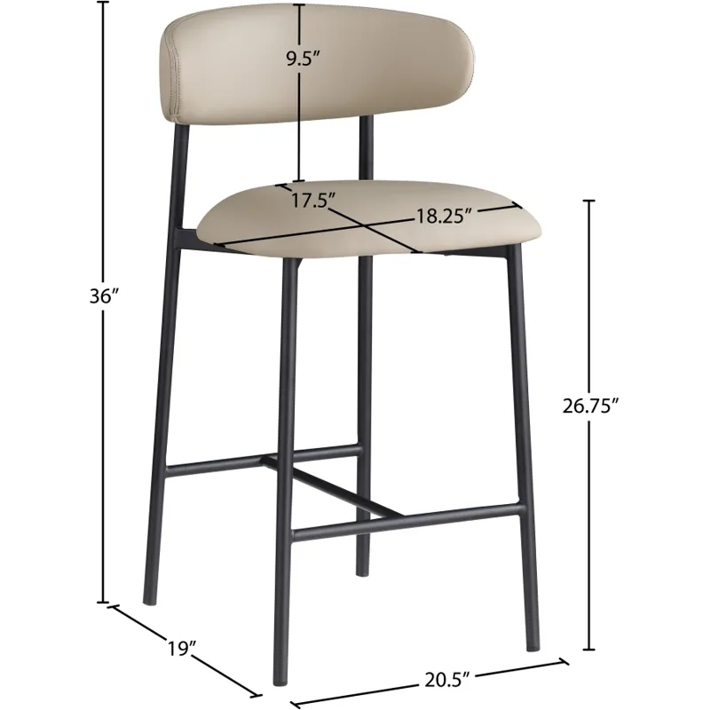 Grace, comfort, and elegance collide in the design of this Lupita taupe vegan leather counter stool. Upholstered in soft taupe vegan leather and supported by a matte black metal frame, it radiates luxury and modern sophistication. Perfect for kitchen islands or home bars, its counter height and contemporary design ensure both style and comfort. Elevate your space with this statement piece that harmonizes versatility and aesthetic appeal, promising to be a stunning addition to the space of your choice.