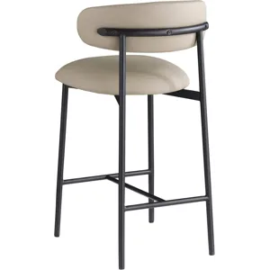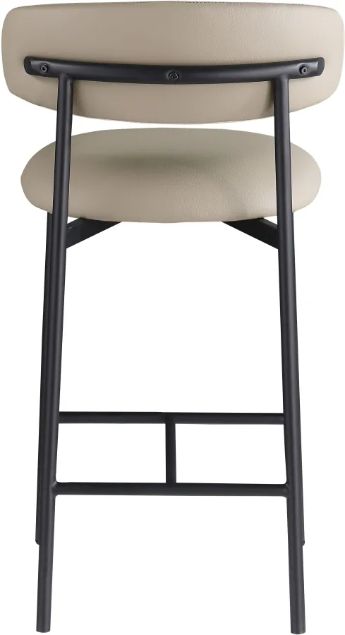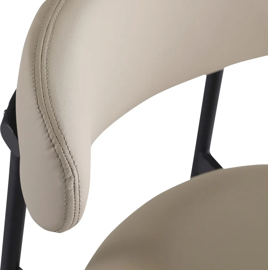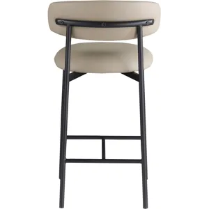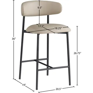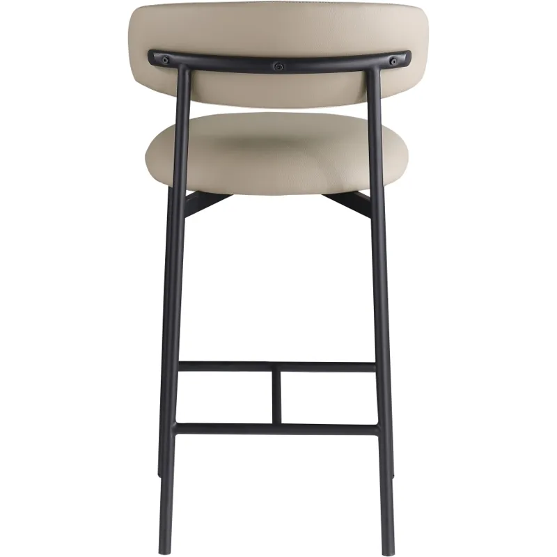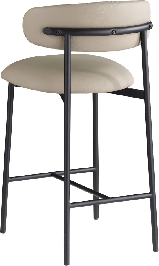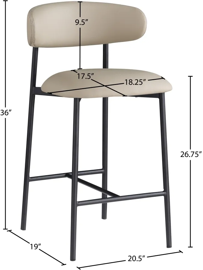 Grace, comfort, and elegance collide in the design of this Lupita taupe vegan leather counter stool. Upholstered in soft taupe vegan leather and supported by a matte black metal frame, it radiates luxury and modern sophistication. Perfect for kitchen islands or home bars, its counter height and contemporary design ensure both style and comfort. Elevate your space with this statement piece that harmonizes versatility and aesthetic appeal, promising to be a stunning addition to the space of your choice.