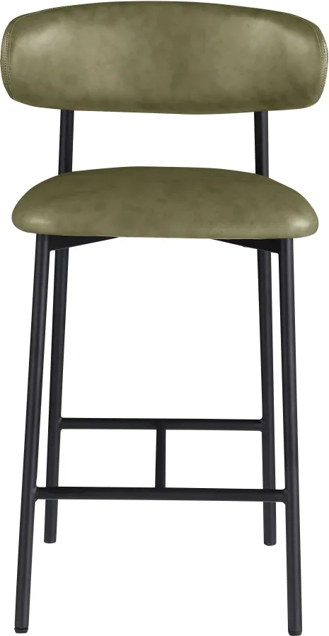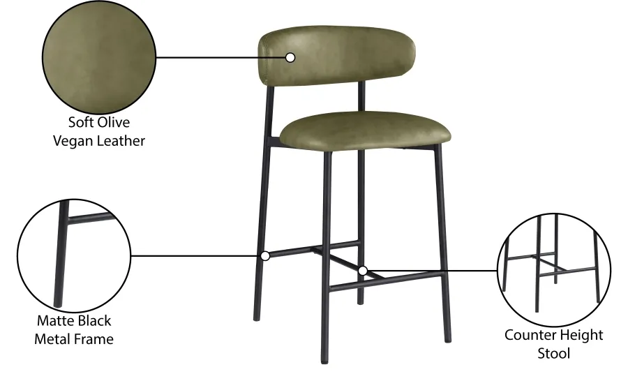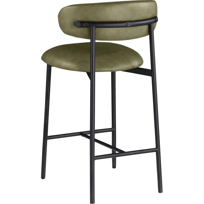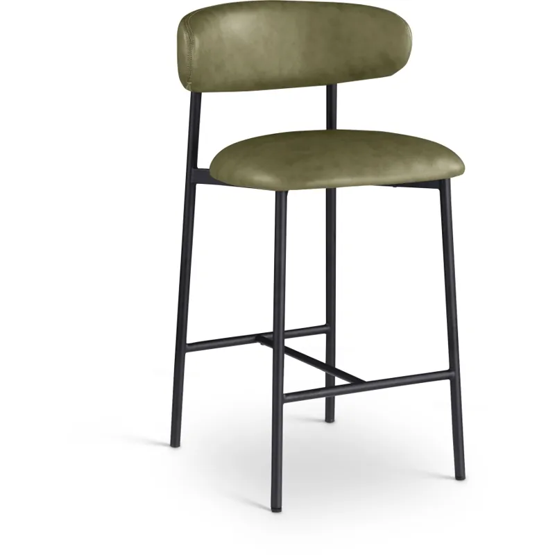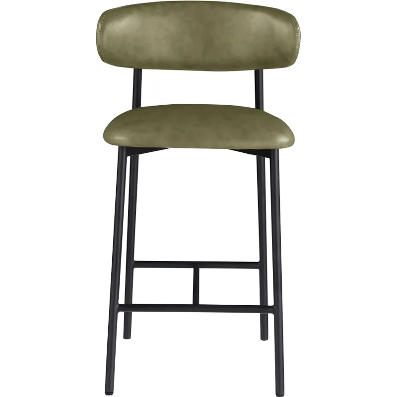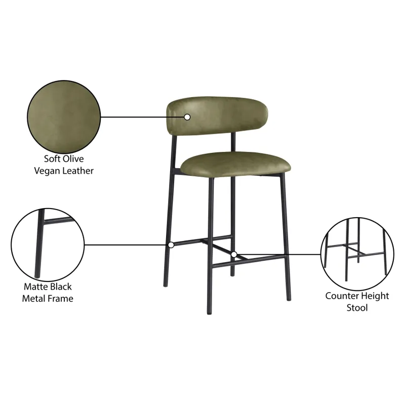 Grace, comfort, and elegance collide in the design of this Lupita olive vegan leather counter stool. Upholstered in soft olive vegan leather and supported by a matte black metal frame, it radiates luxury and modern sophistication. Perfect for kitchen islands or home bars, its counter height and contemporary design ensure both style and comfort. Elevate your space with this statement piece that harmonizes versatility and aesthetic appeal, promising to be a stunning addition to the space of your choice.