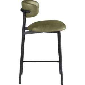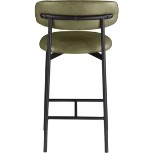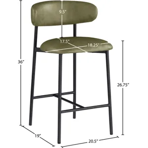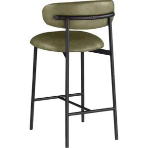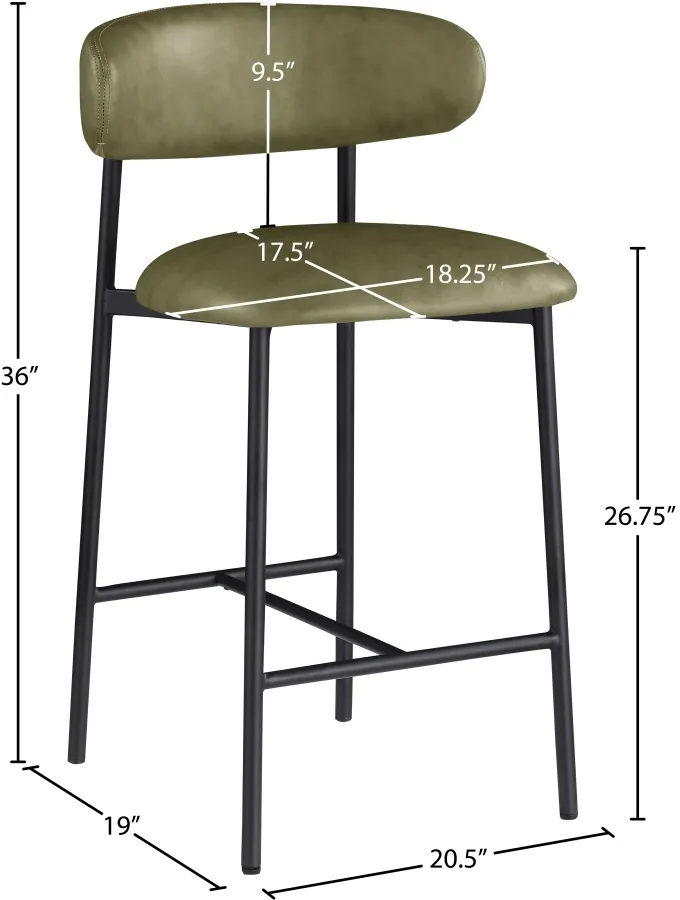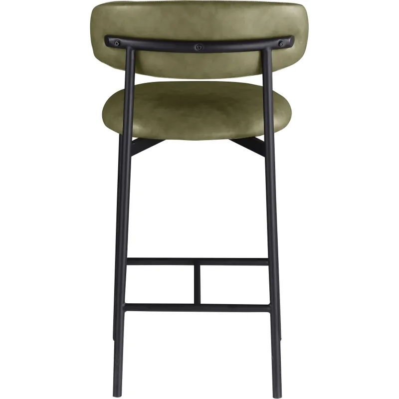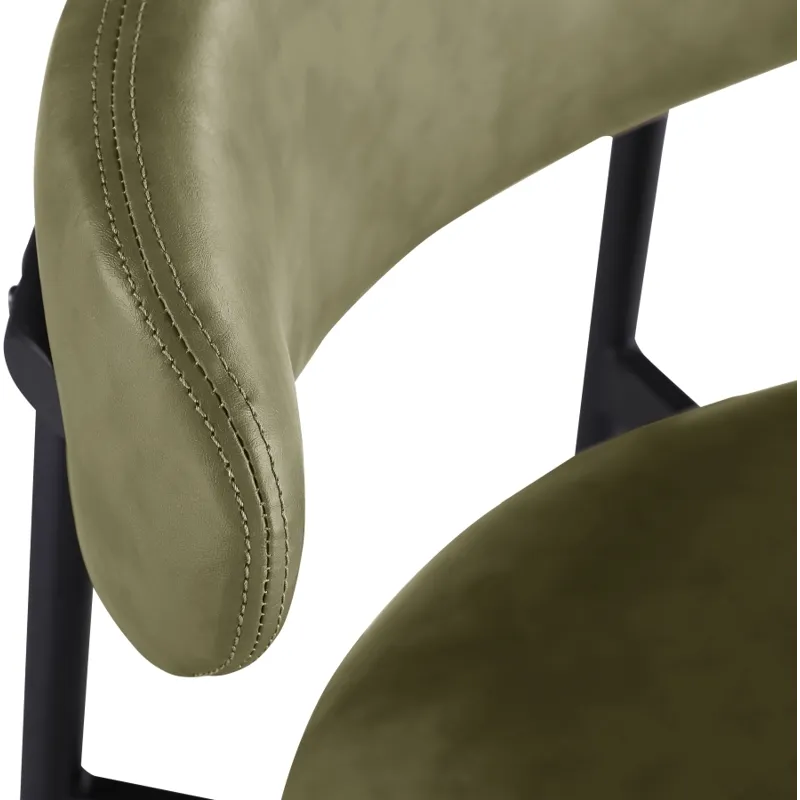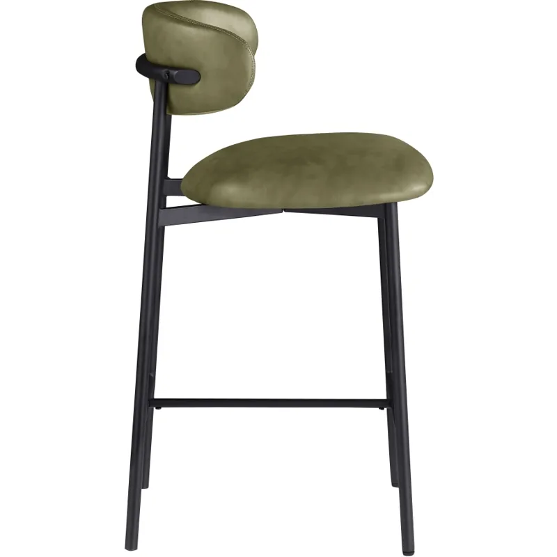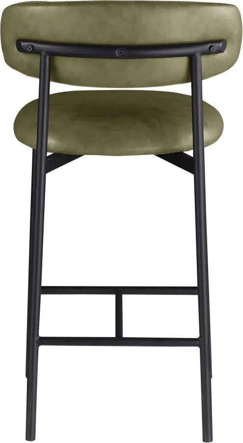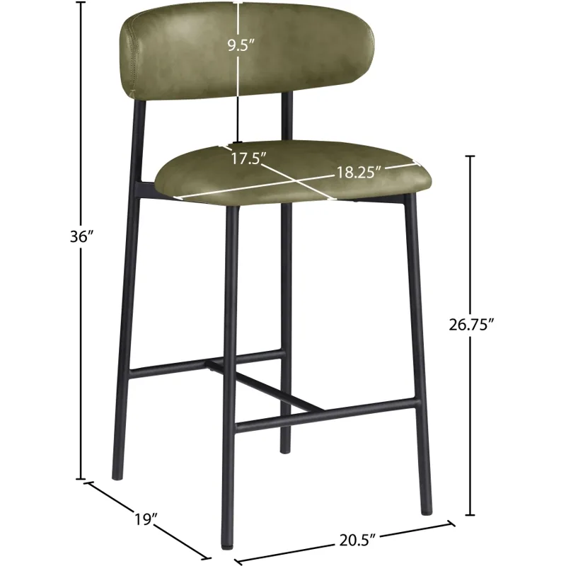 Grace, comfort, and elegance collide in the design of this Lupita olive vegan leather counter stool. Upholstered in soft olive vegan leather and supported by a matte black metal frame, it radiates luxury and modern sophistication. Perfect for kitchen islands or home bars, its counter height and contemporary design ensure both style and comfort. Elevate your space with this statement piece that harmonizes versatility and aesthetic appeal, promising to be a stunning addition to the space of your choice.