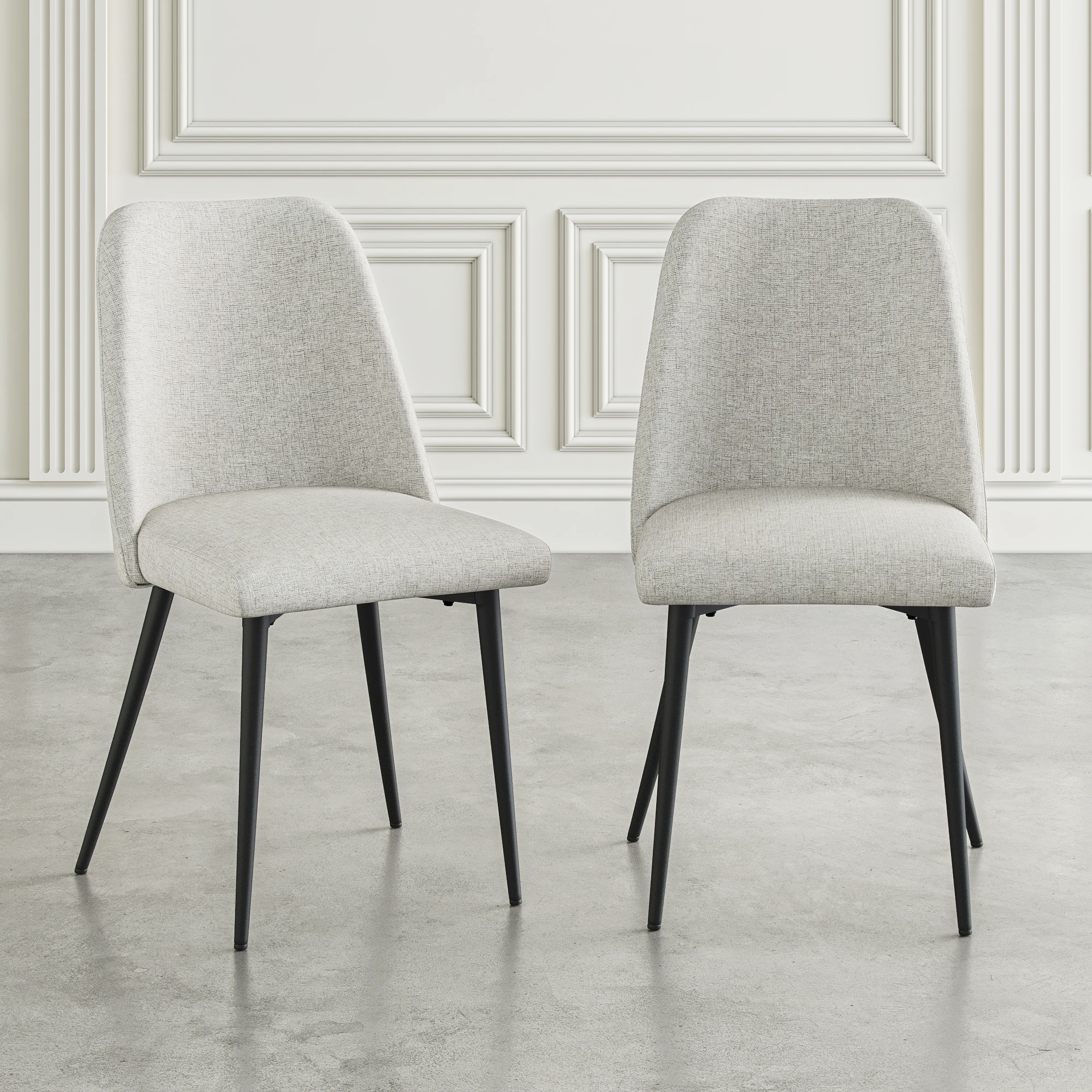 • -Set of Two Dining Chairs -Mid-Century Modern Design -Heathered Fabric Upholstery Adds Visual Contrast -Tapered Metal Legs - - -
