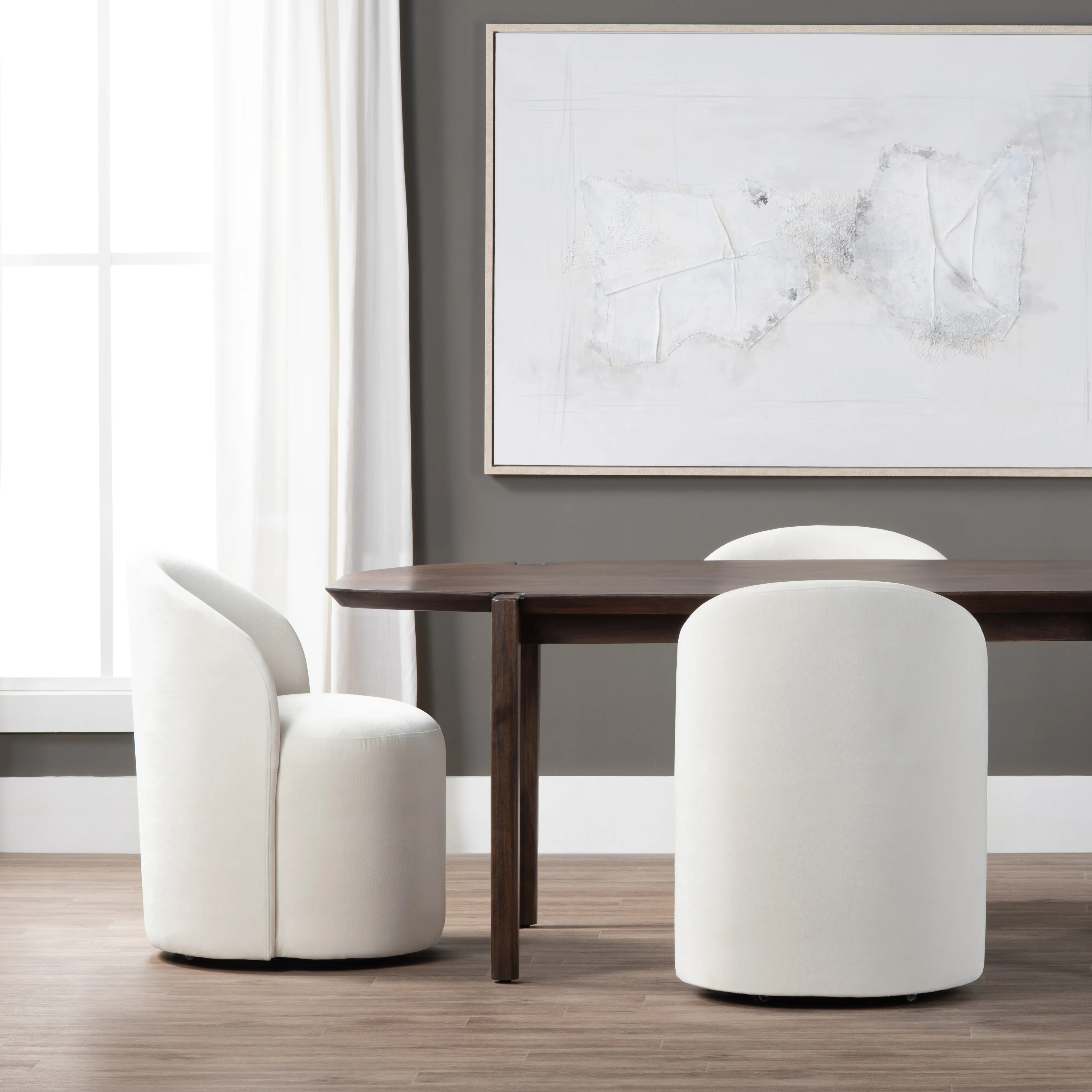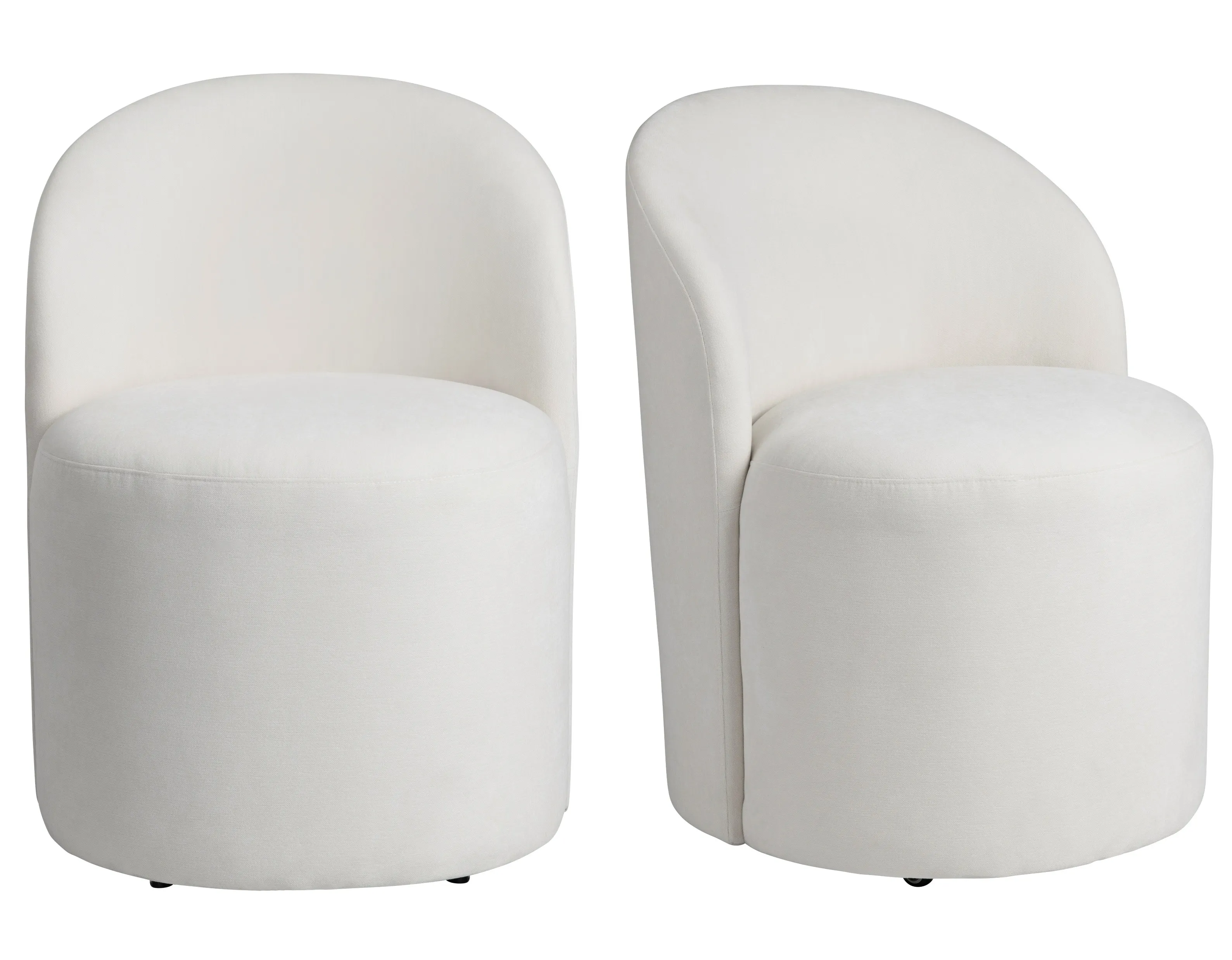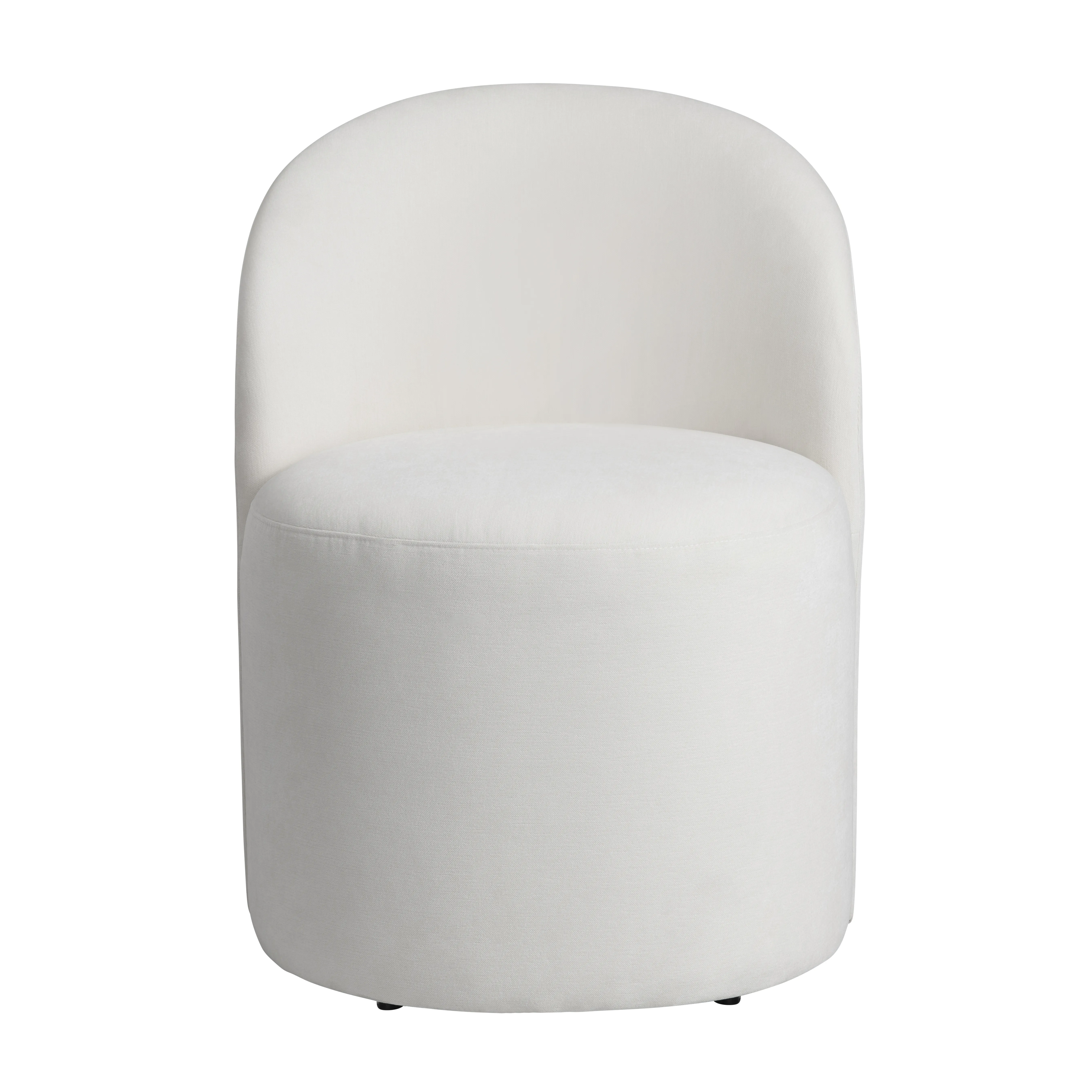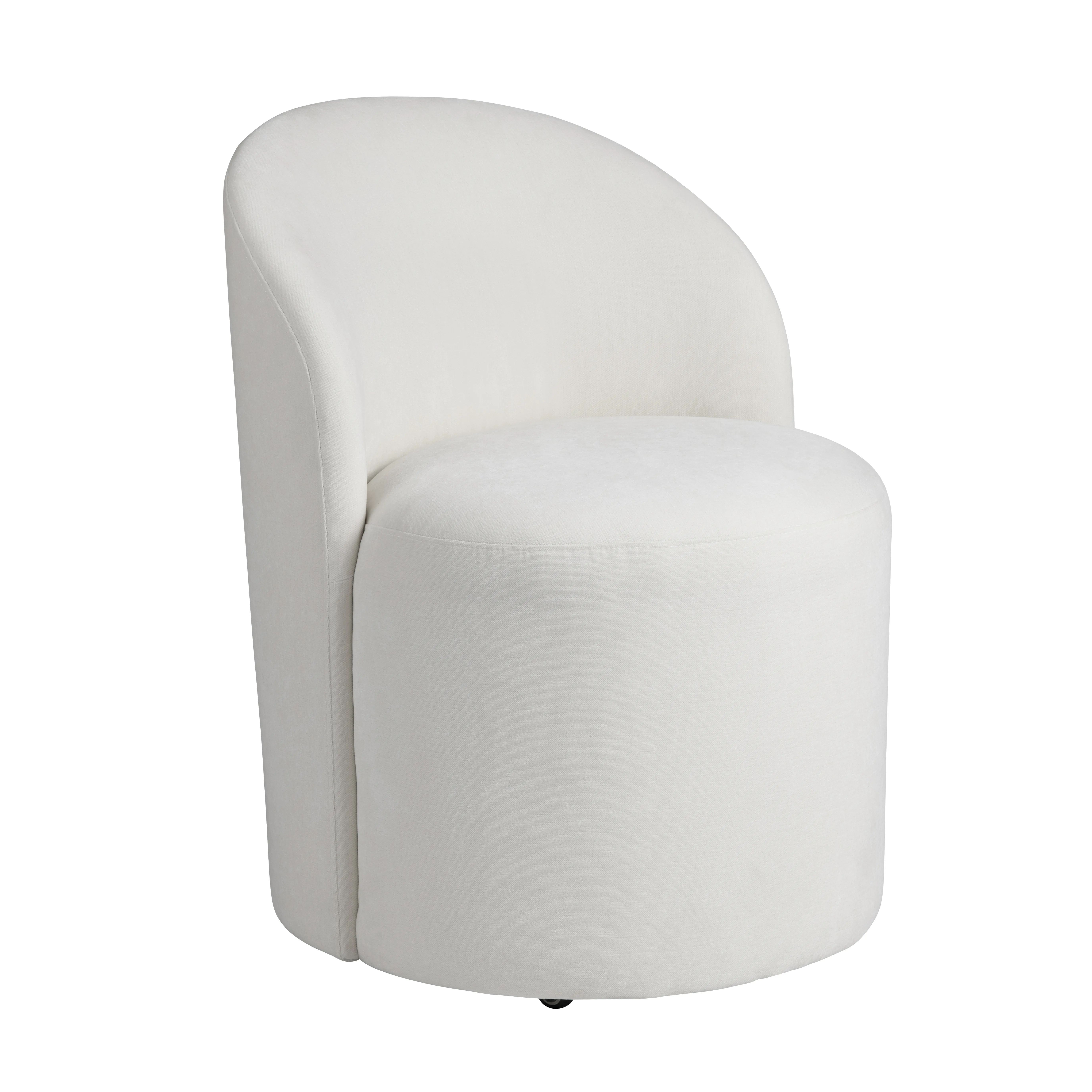 Elevate everyday meals with a dining chair that feels like a hug. This dining chair pairs a sculptural curved back with plush, cloud‑soft performance upholstery in fresh white. A smooth, 360‑degree swivel keeps conversation flowing, while the compact barrel silhouette tucks neatly beneath most tables. Crafted on a kiln‑dried hardwood frame for strength you can count on, this modern statement piece moves effortlessly from breakfast nook to formal dinner party—no assembly required.