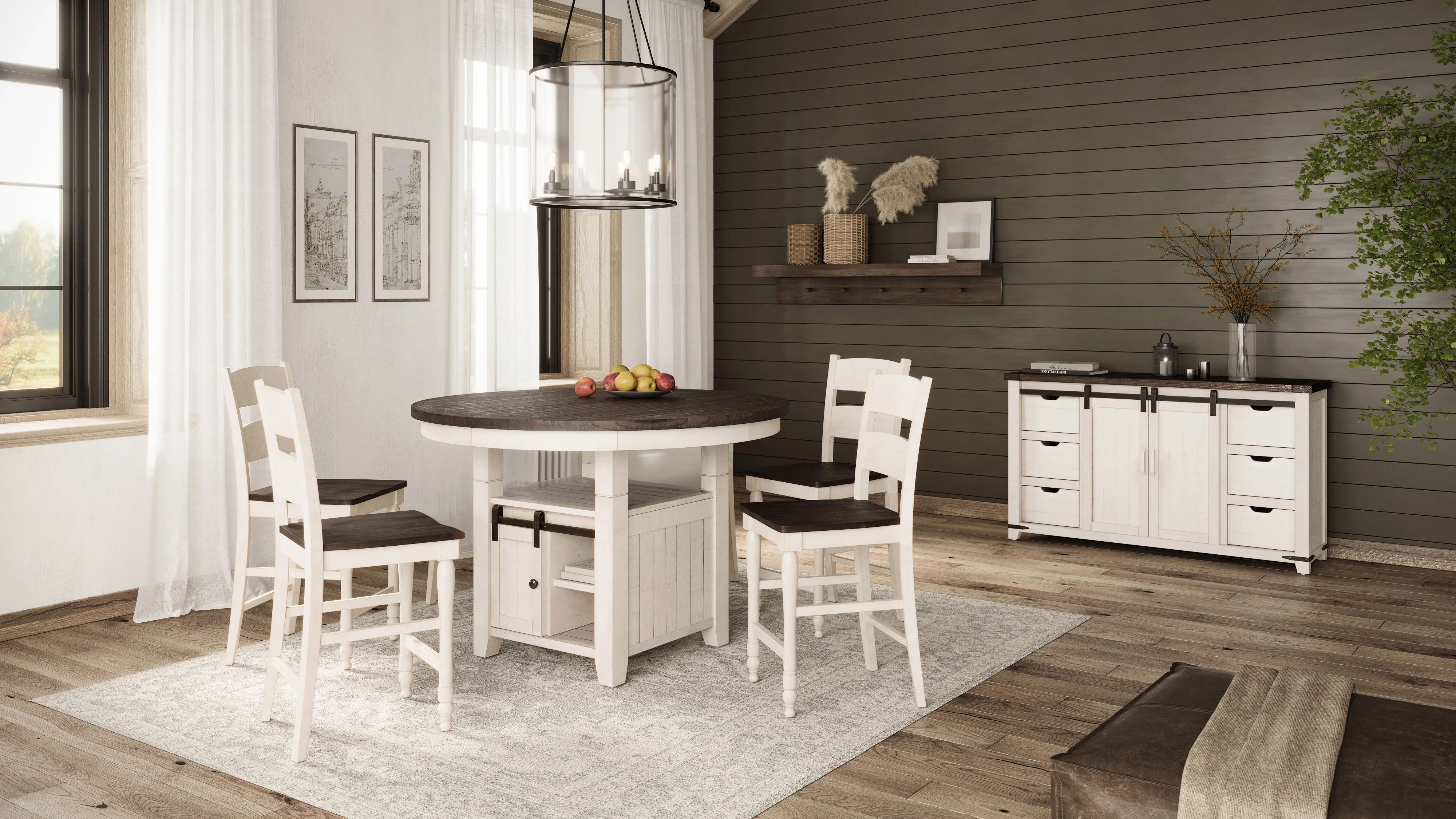 Elevate your dining experience with the charm of rustic farmhouse style embodied in this reclaimed solid wood counter height dining set. The centerpiece, a 54" diameter table, exudes warmth and character with its heavily distressed wood and vintage white finish on the base. Crafted with a keen eye for both aesthetics and functionality, the pedestal base boasts a built-in storage shelf, perfect for displaying your favorite dining essentials, while a storage cabinet concealed behind rolling barn doors offers ample space for stowing away table linens or dinnerware. Complete with your choice of either four or six matching counter height barstools, this set invites cozy gatherings and culinary adventures. Embrace the allure of country living with every meal shared around this exquisite dining ensemble.