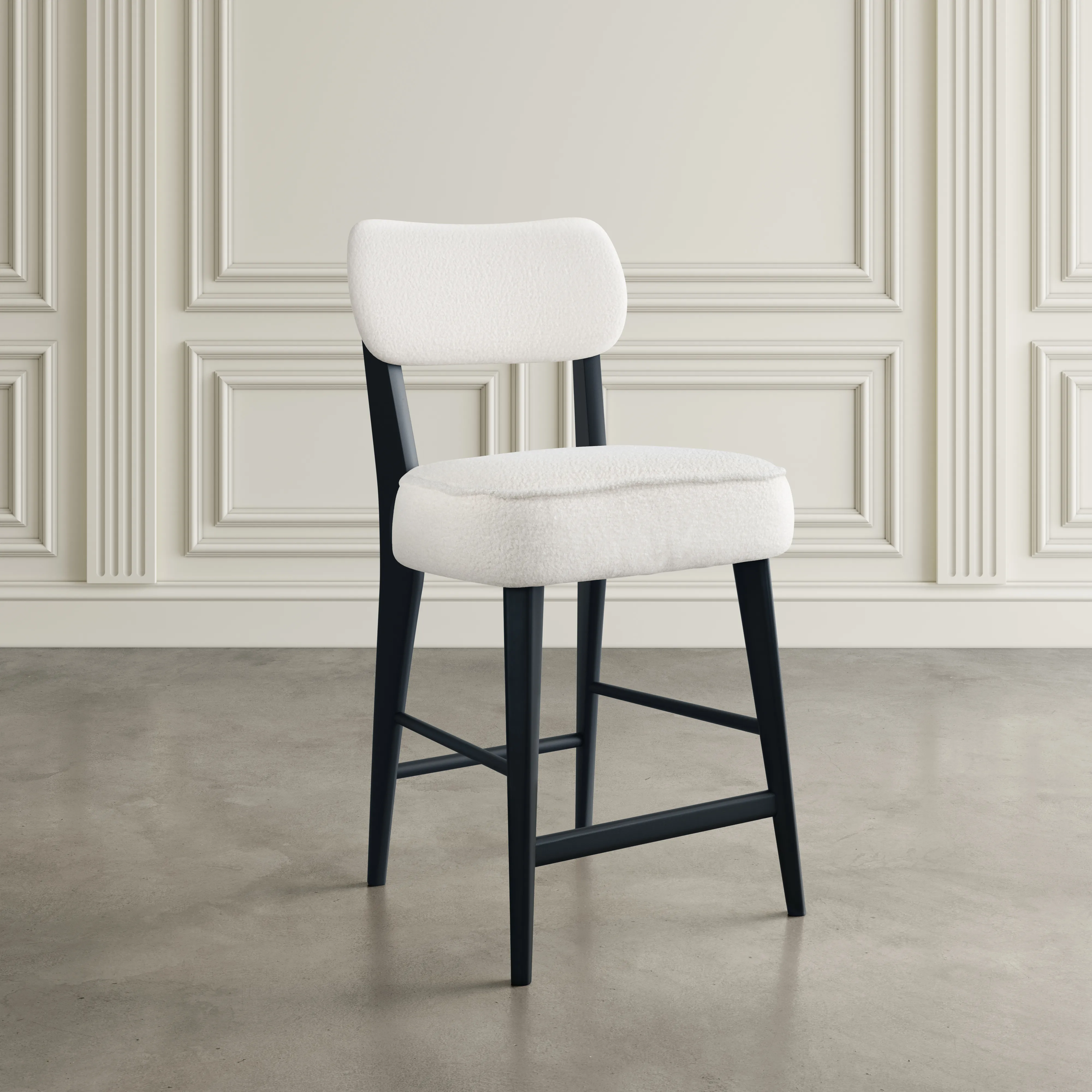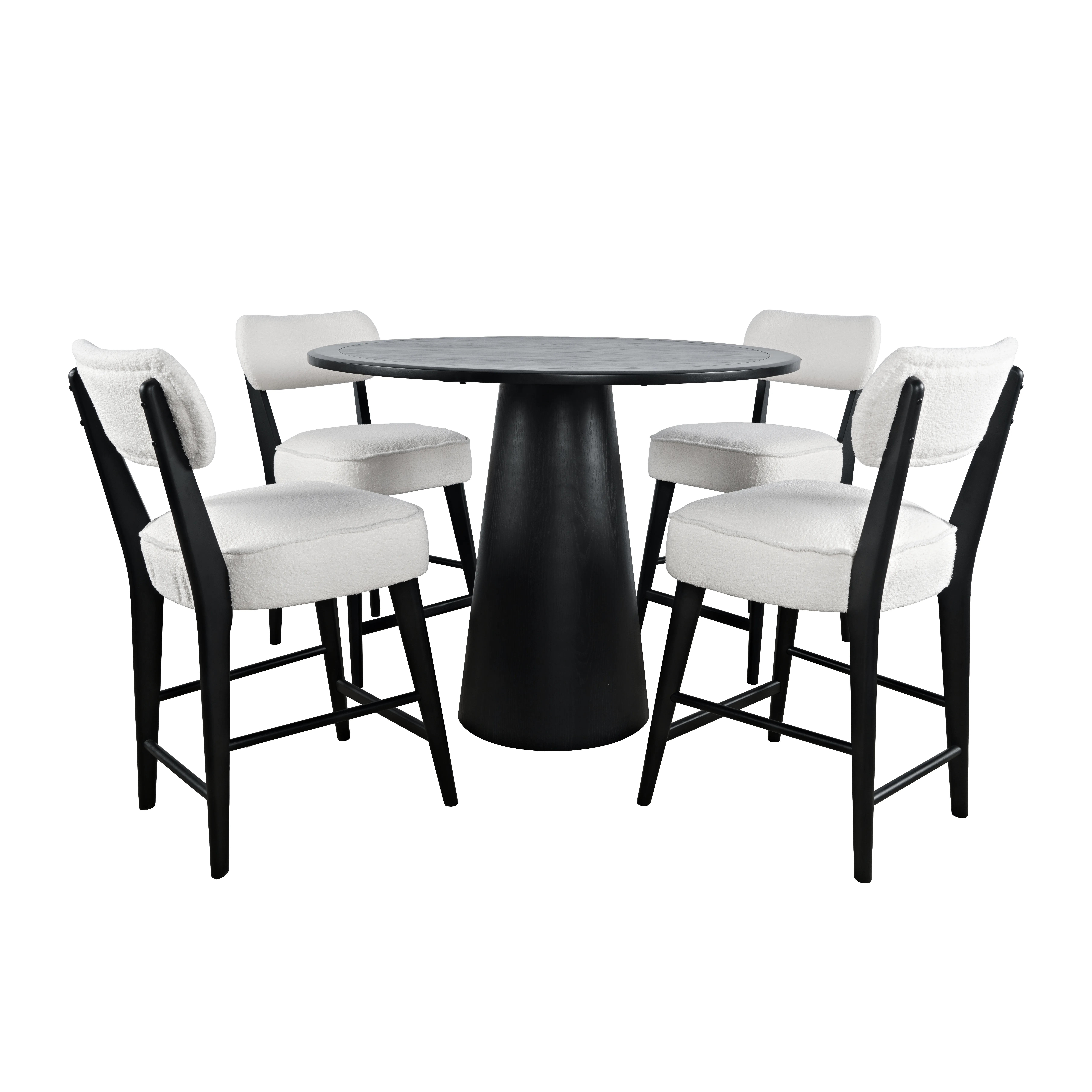 - -Set Includes One 45" Pedestal Counter Table and Four Matching Barstools -Mid-Century Modern Ivory Boucle Upholstery -Stools have Natural Solid Rubberwood Frame -Solid Acacia and Veneer Pedestal Table -1.5" Thick Table Top - -
