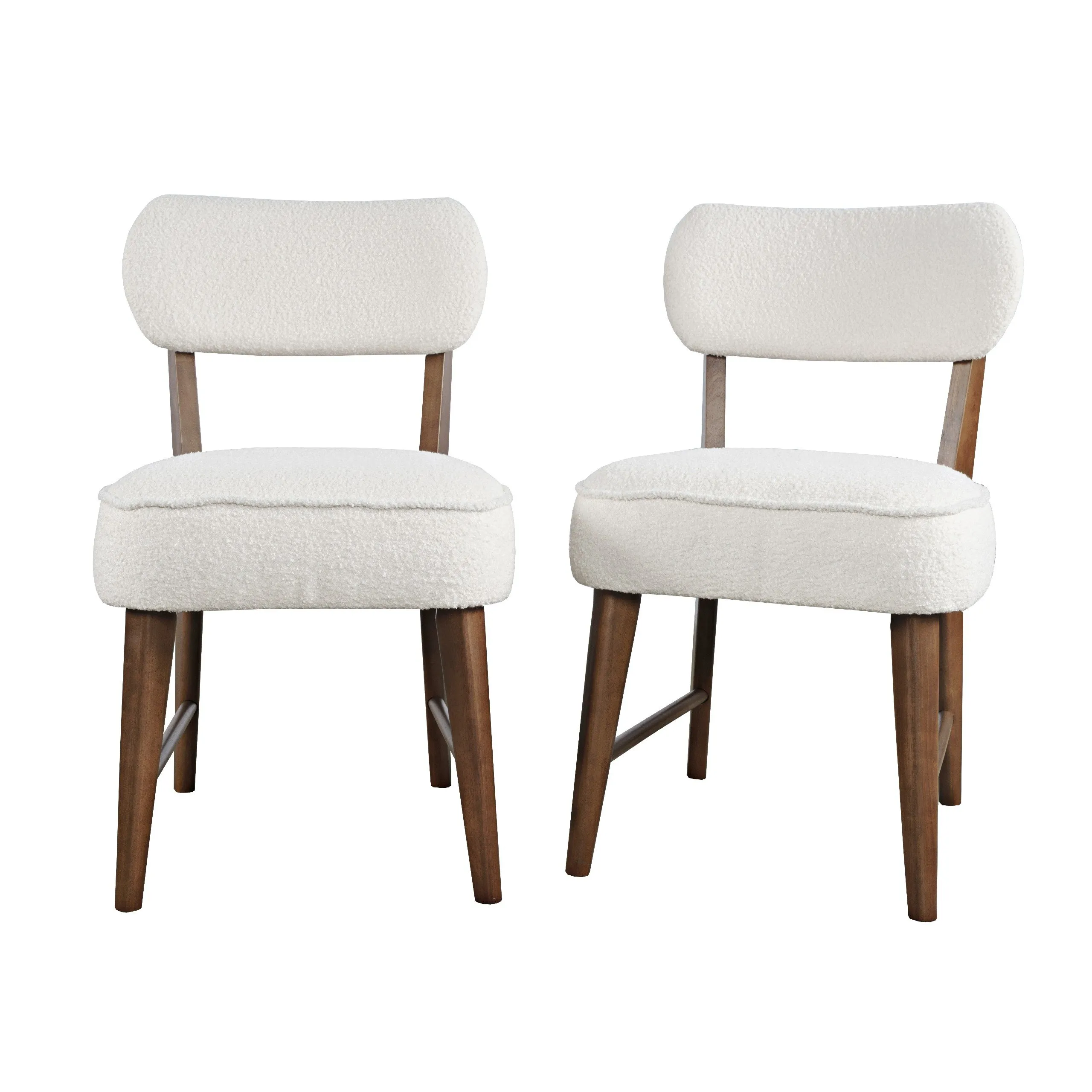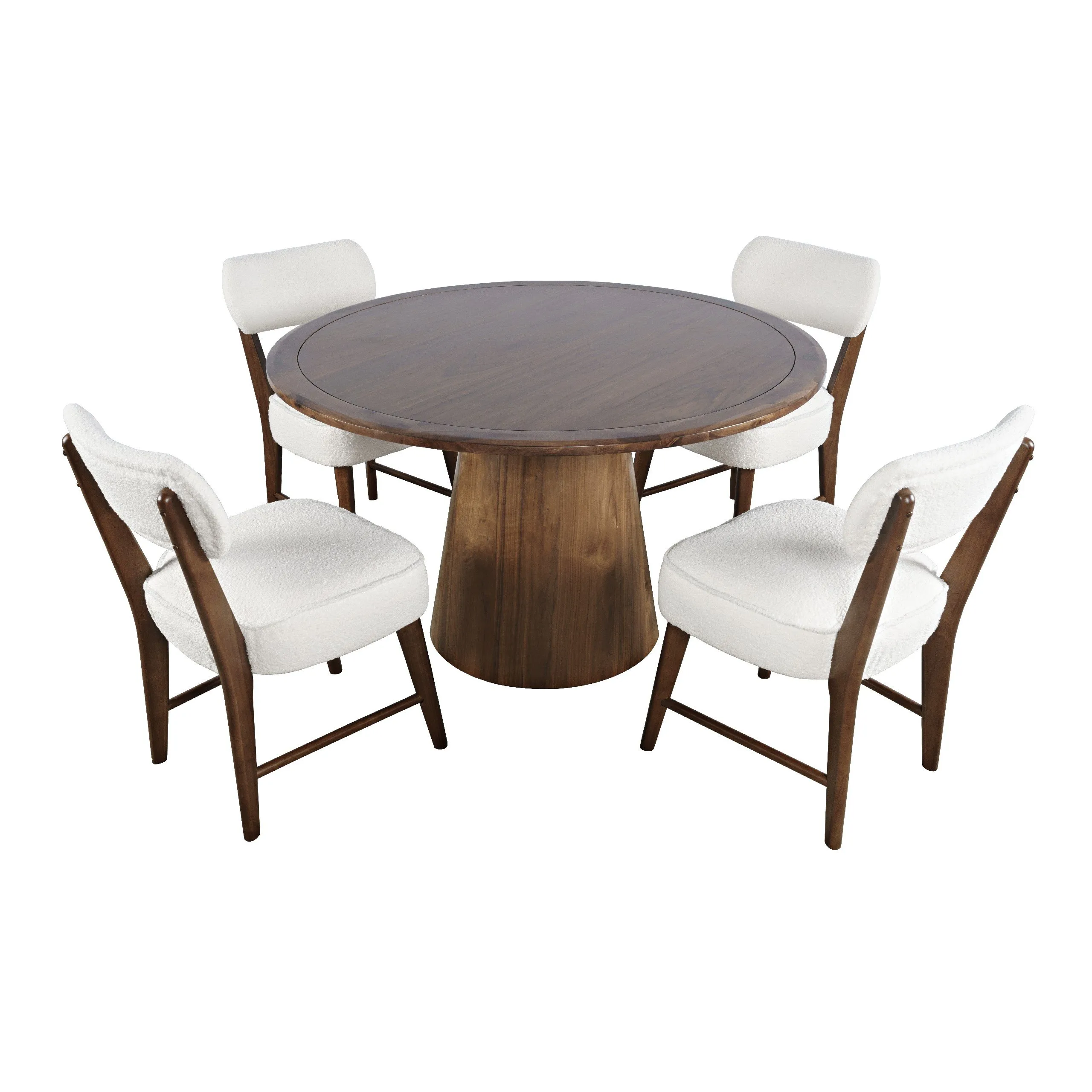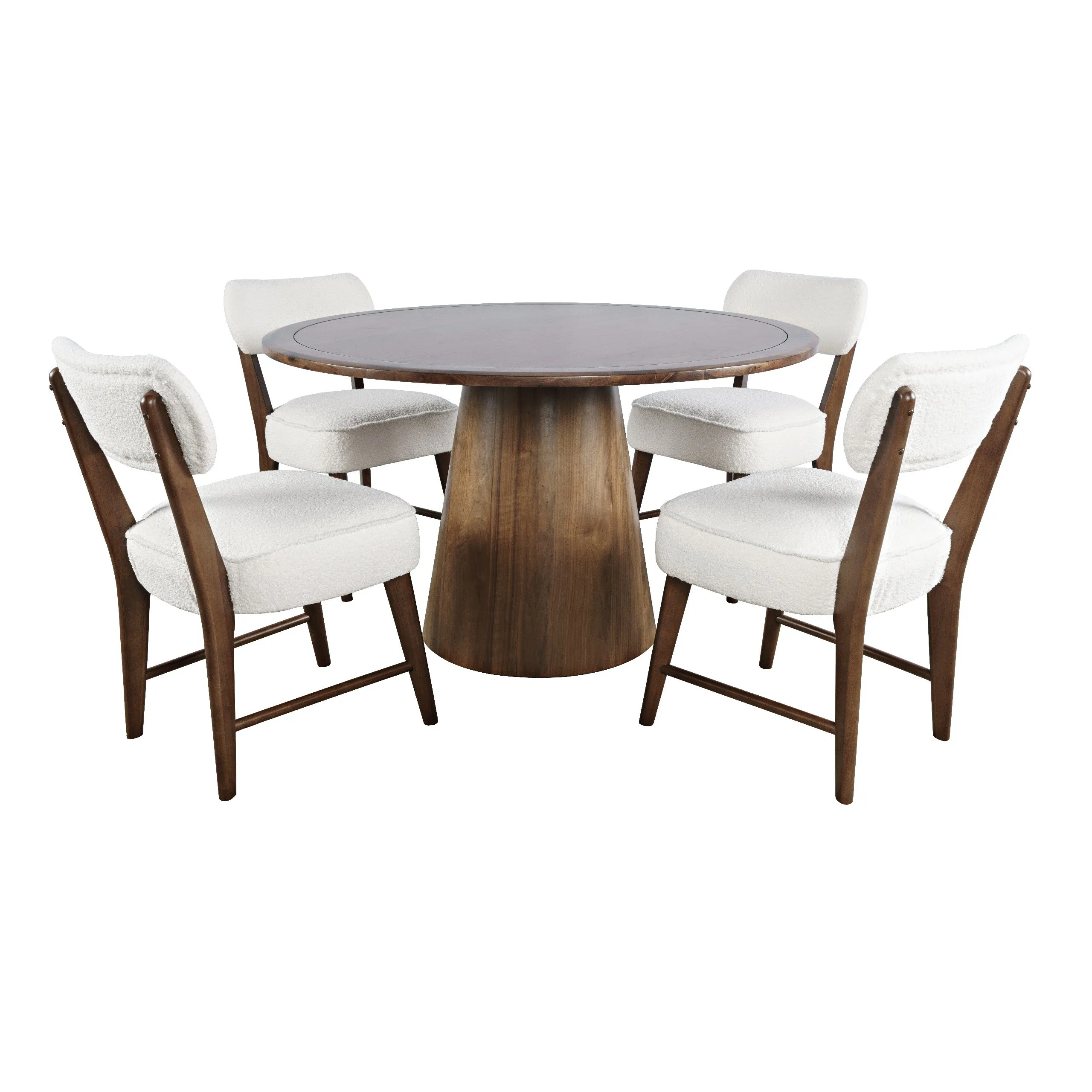 Transform your dining space with the Nash Mid-Century Modern Five Piece Pedestal Dining Set, complete with four beautifully upholstered chairs. At the heart of this set is the Nash Round 50" Pedestal Dining Table, featuring a sleek mid-century modern tapered base in a rich walnut brown finish. Its elegant curved silhouette blends minimalist design with everyday practicality, creating a stylish centerpiece for family dinners or gatherings with friends. The chairs, upholstered in soft ivory boucle, provide both comfort and a touch of timeless luxury, supported by a sturdy solid wood frame. With its combination of style and functionality, this dining set offers the perfect balance for any occasion.