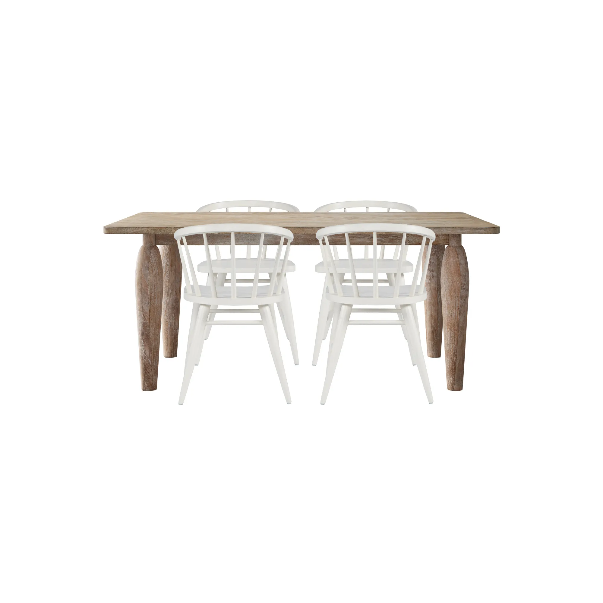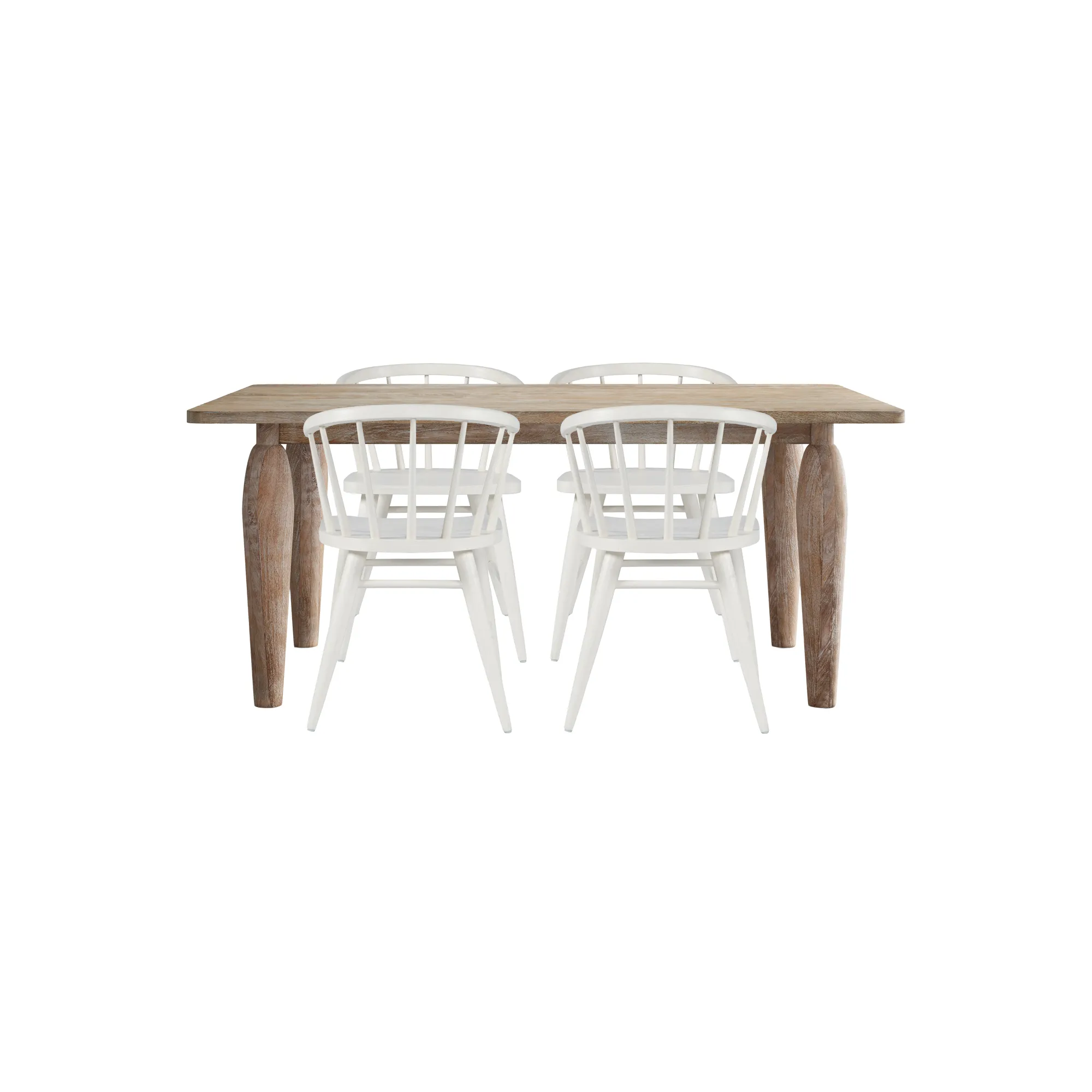 • -Set includes One Dining Table and 4 Chairs -Table crafted from solid mango wood with natural grain detail -Chairs made from solid rubberwood for durability and comfort -Sculptural table legs and spindle back chairs for timeless design -Coastal modern style complements rustic and casual interiors - -
