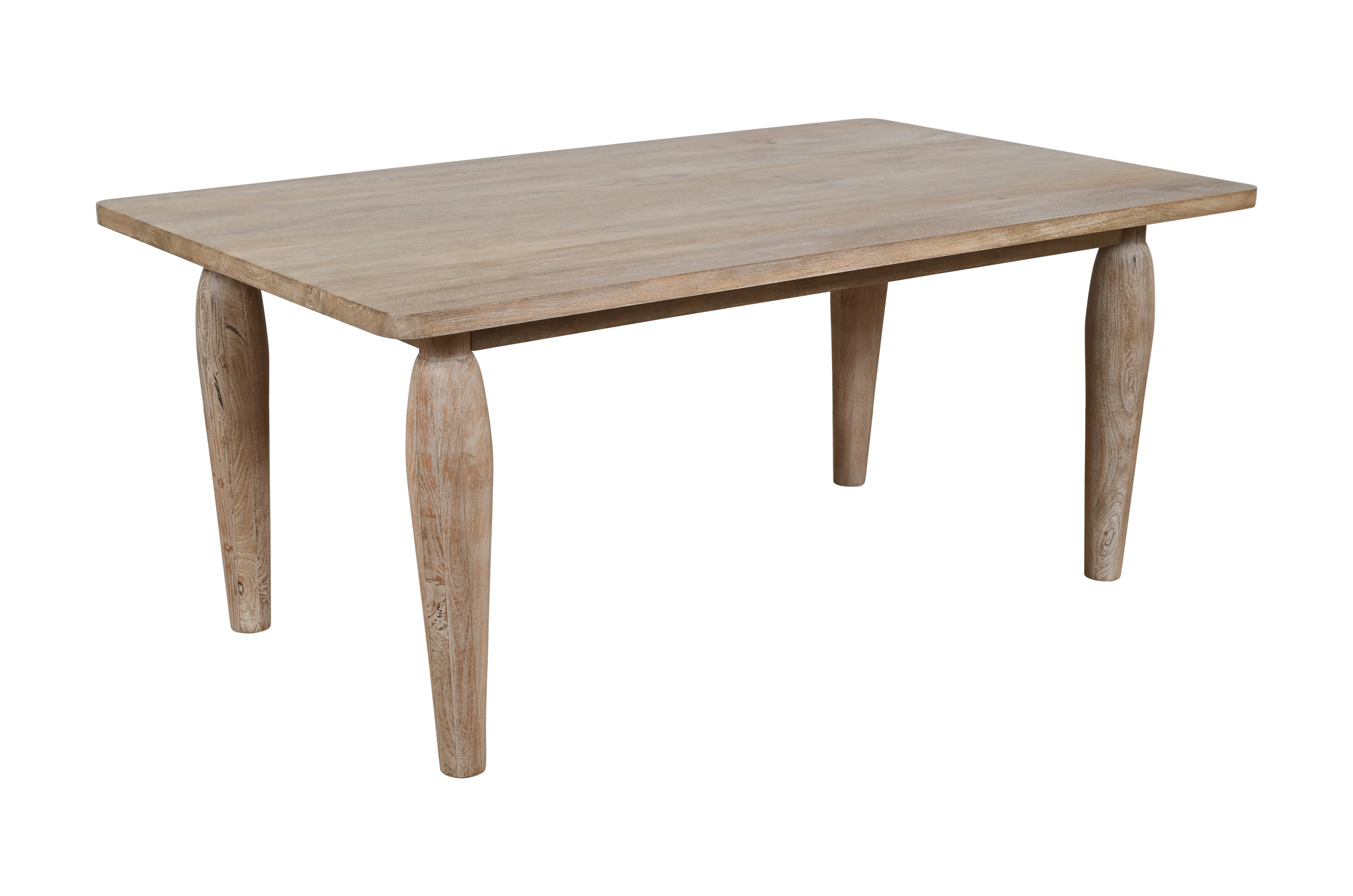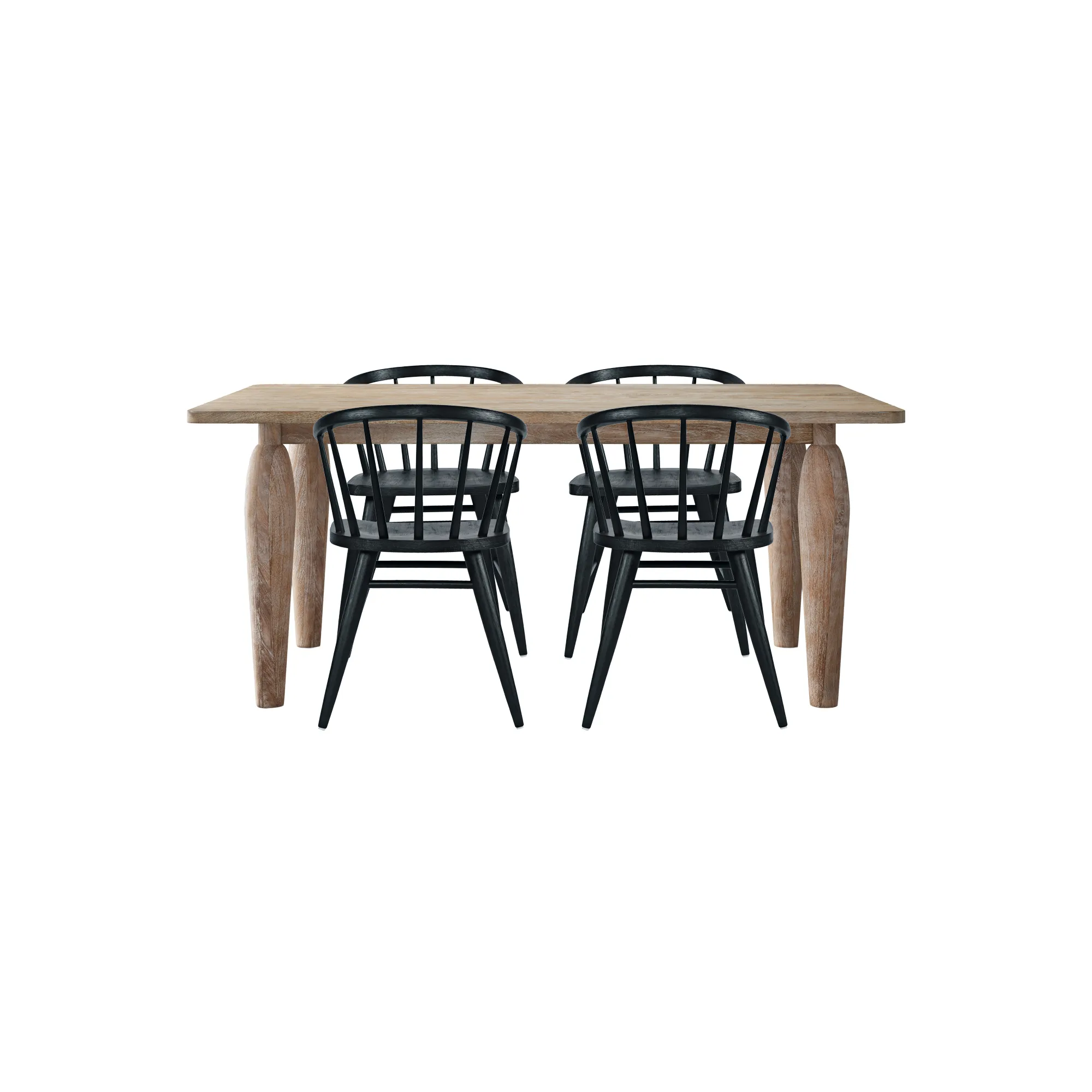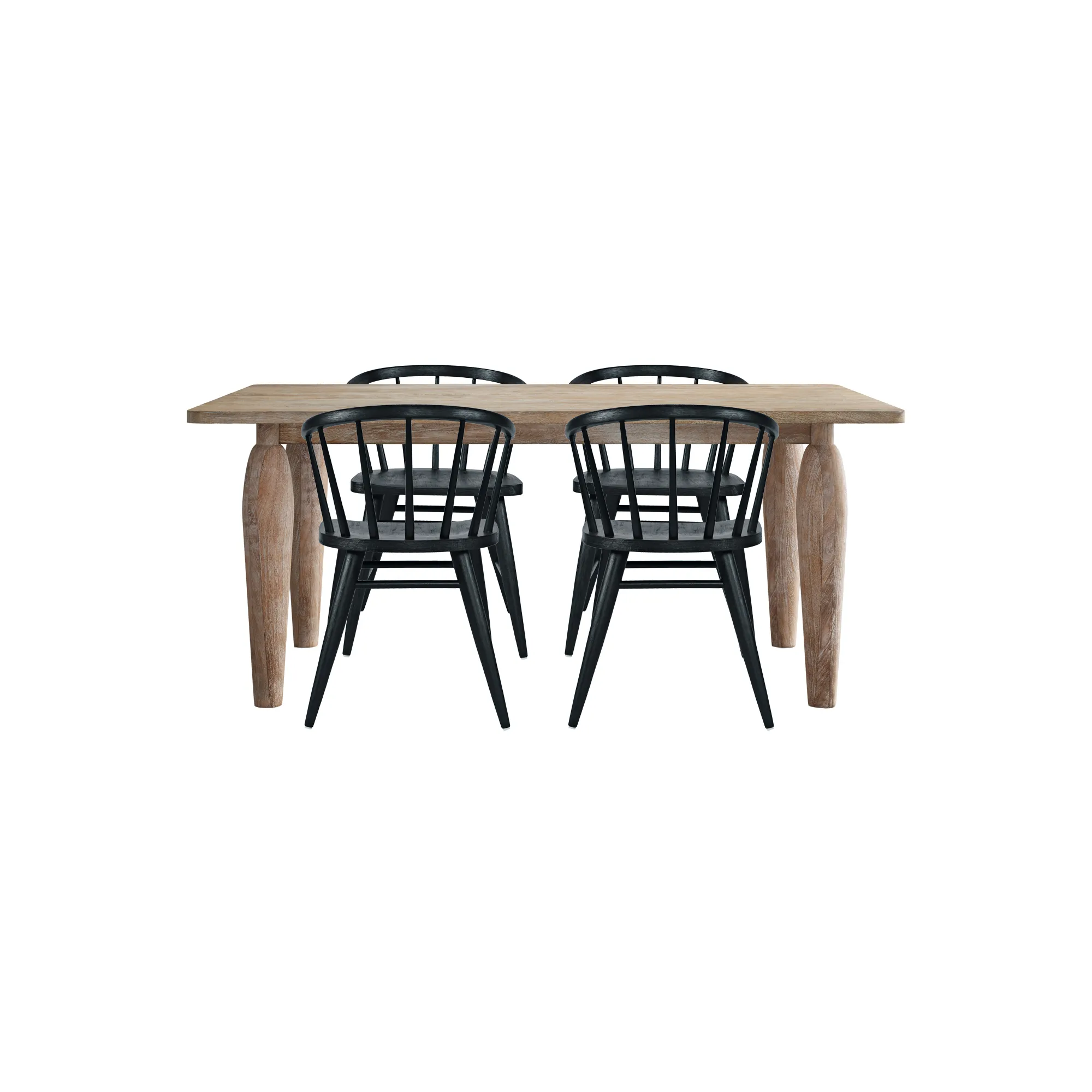 • -Set includes One Dining Table and 4 Chairs -Table crafted from solid mango wood with natural grain detail -Chairs made from solid rubberwood for durability and comfort -Sculptural table legs and spindle back chairs for timeless design -Coastal modern style complements rustic and casual interiors - -