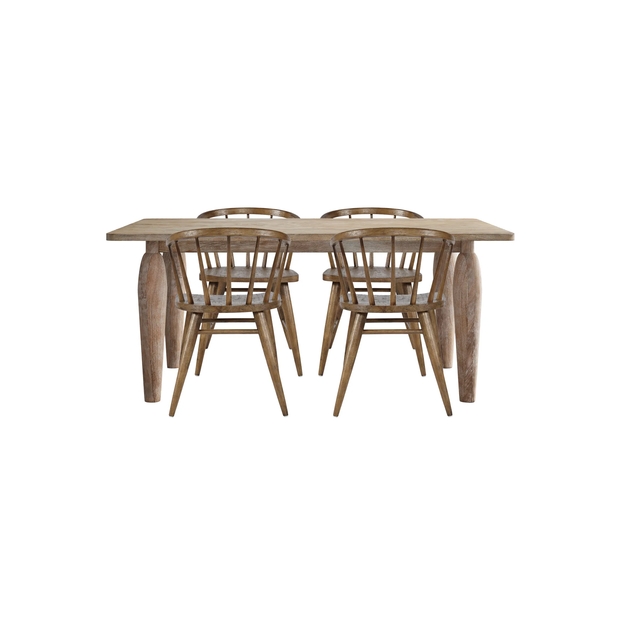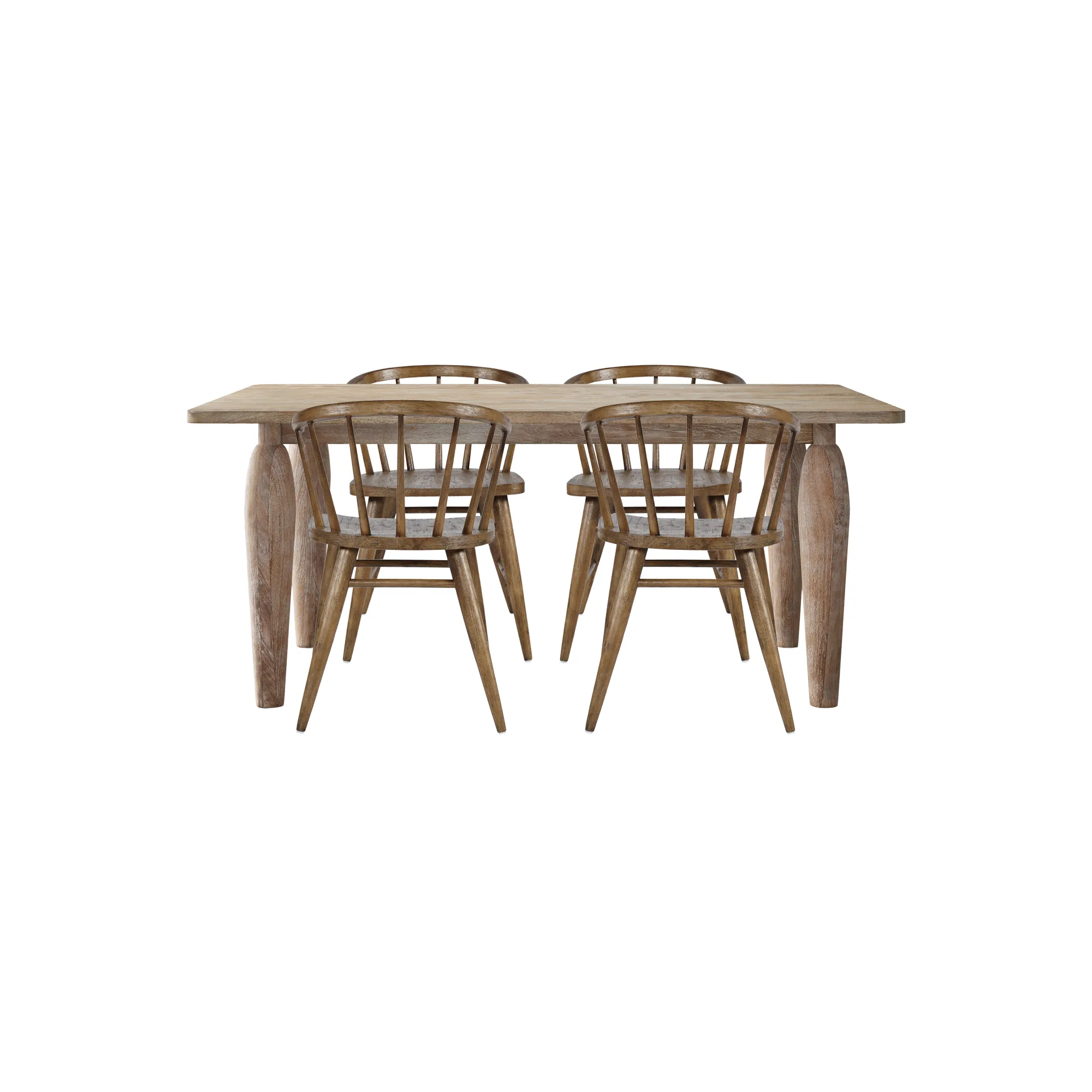 • -Set includes One Dining Table and 4 Chairs -Table crafted from solid mango wood with natural grain detail -Chairs made from solid rubberwood for durability and comfort -Sculptural table legs and spindle back chairs for timeless design -Coastal modern style complements rustic and casual interiors - -