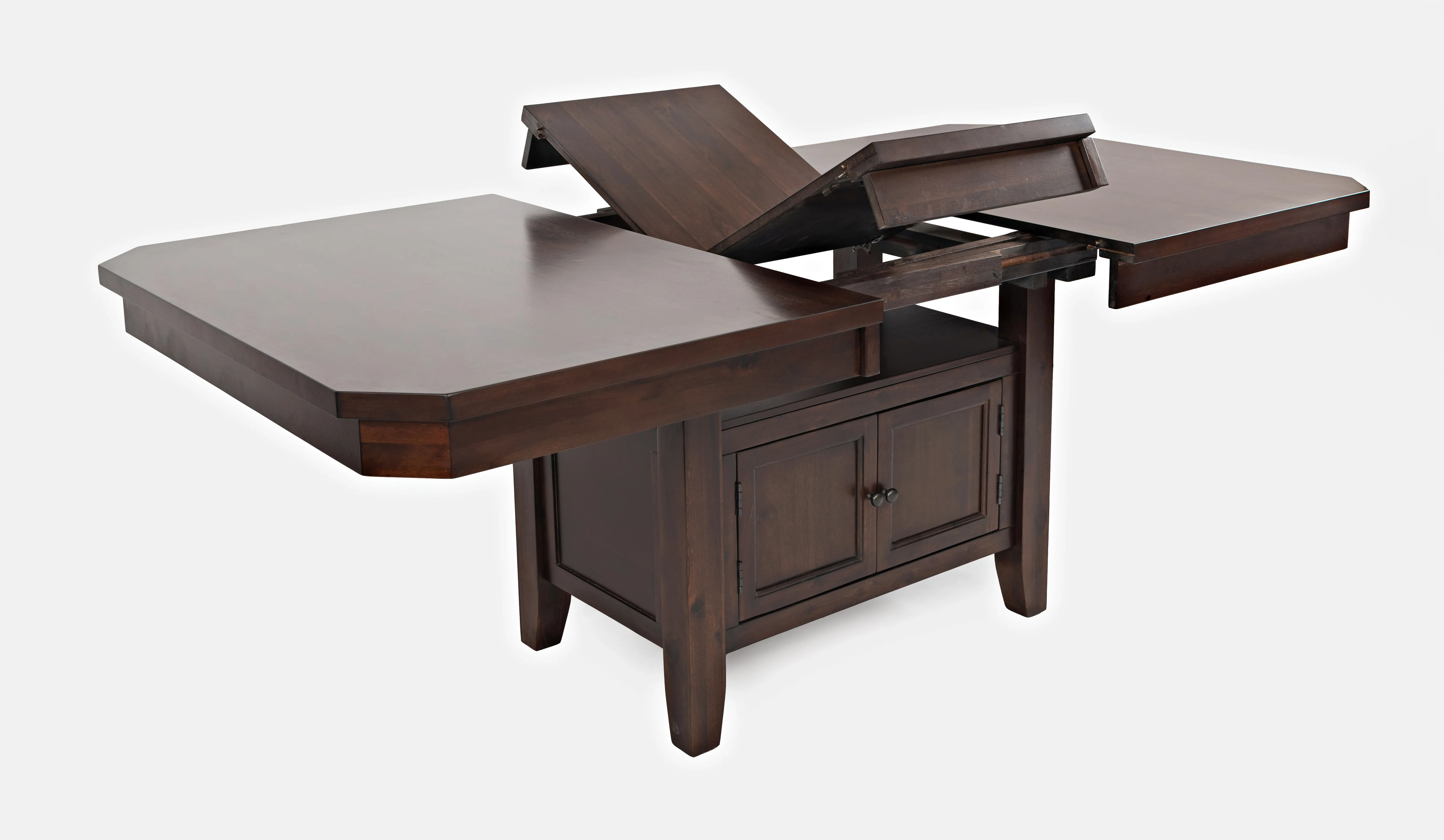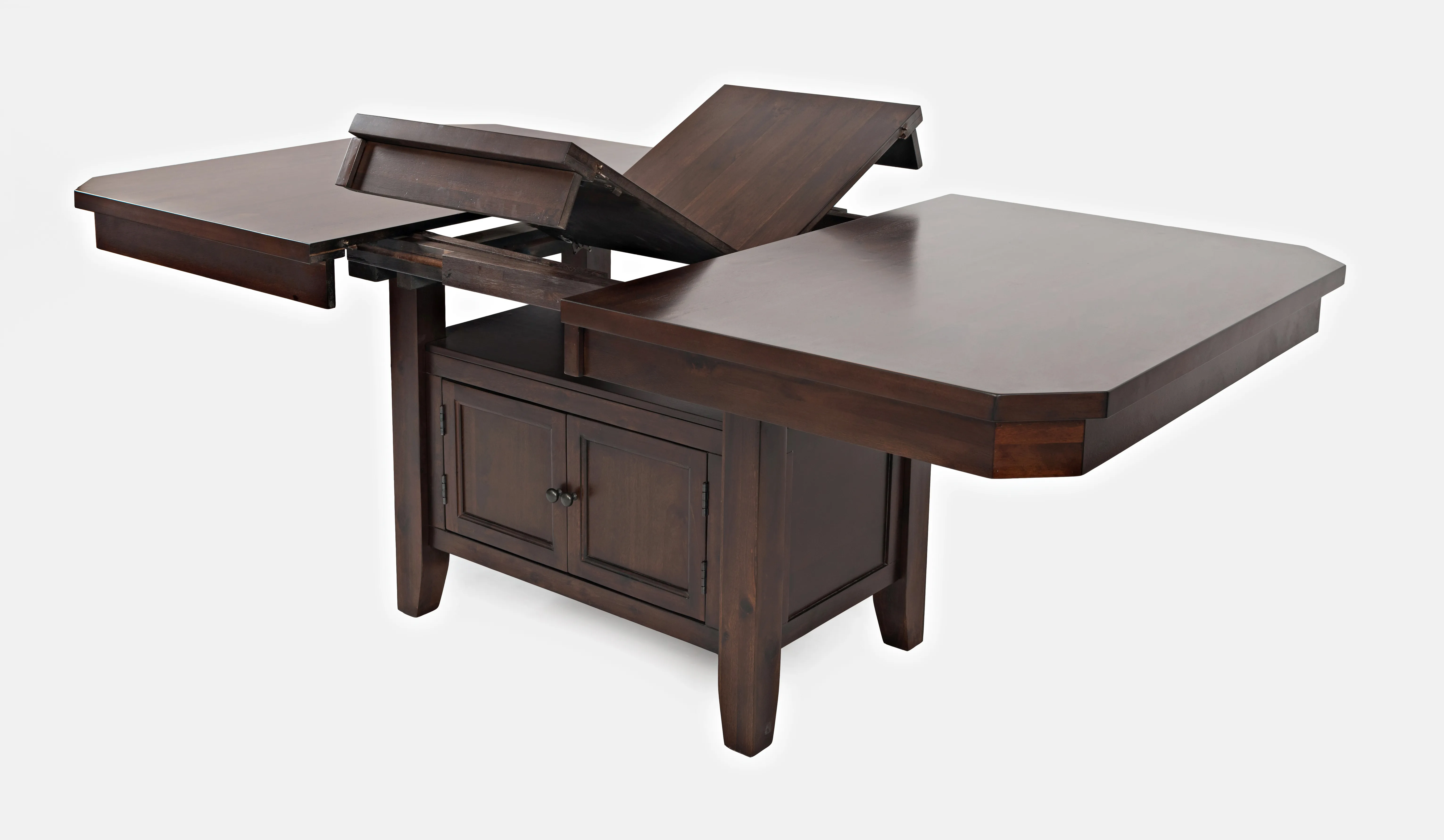 - -Adjustable Height - 30" or 36" -Double header storage base for easy accessibility (interior dimensions: 21"W x 21"D). -Shelf from Top of Storage to table: 11"H -(1) 12" butterfly leaf -For residential use only -Ships in (2) boxes -
