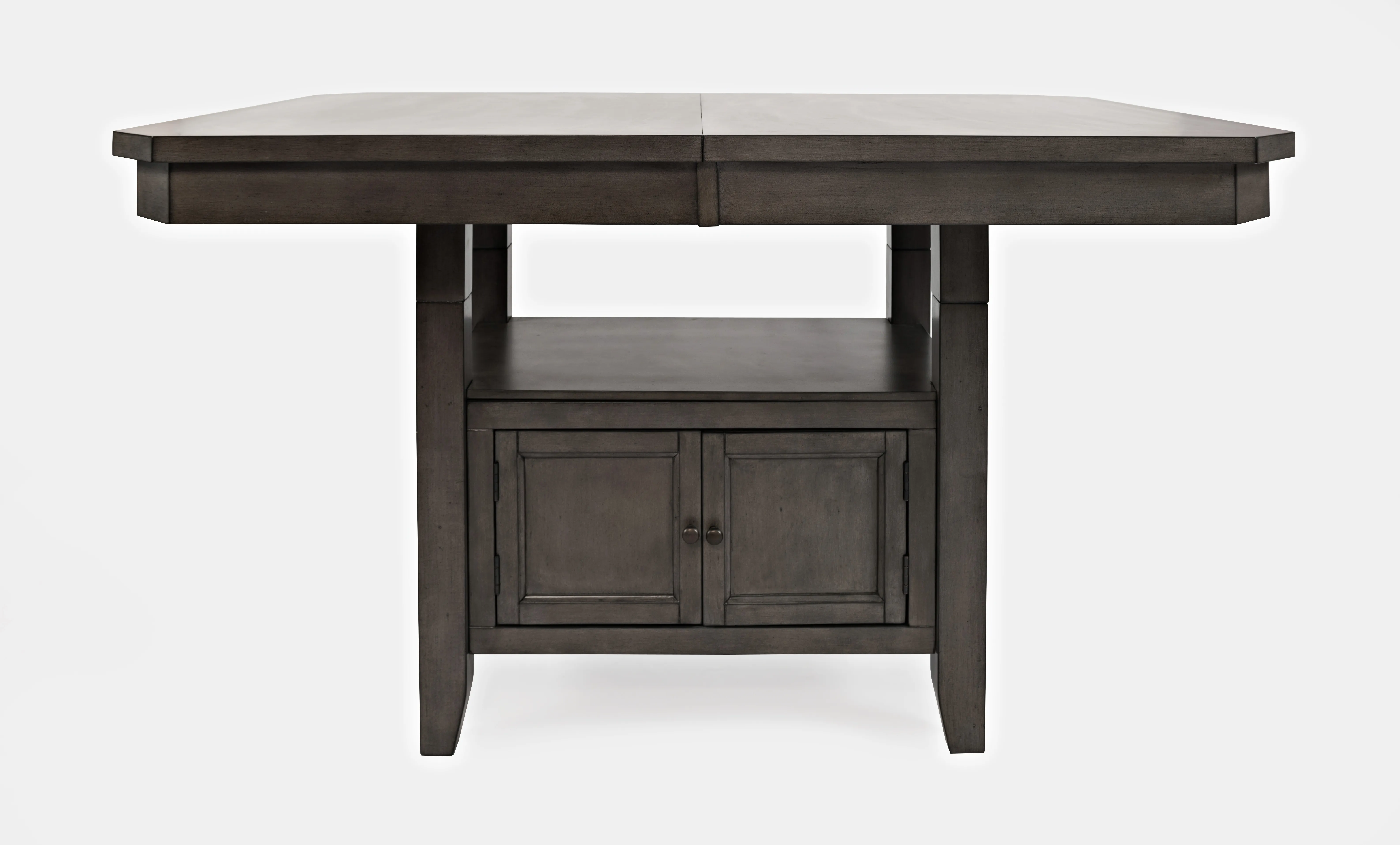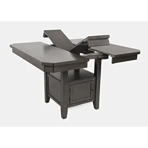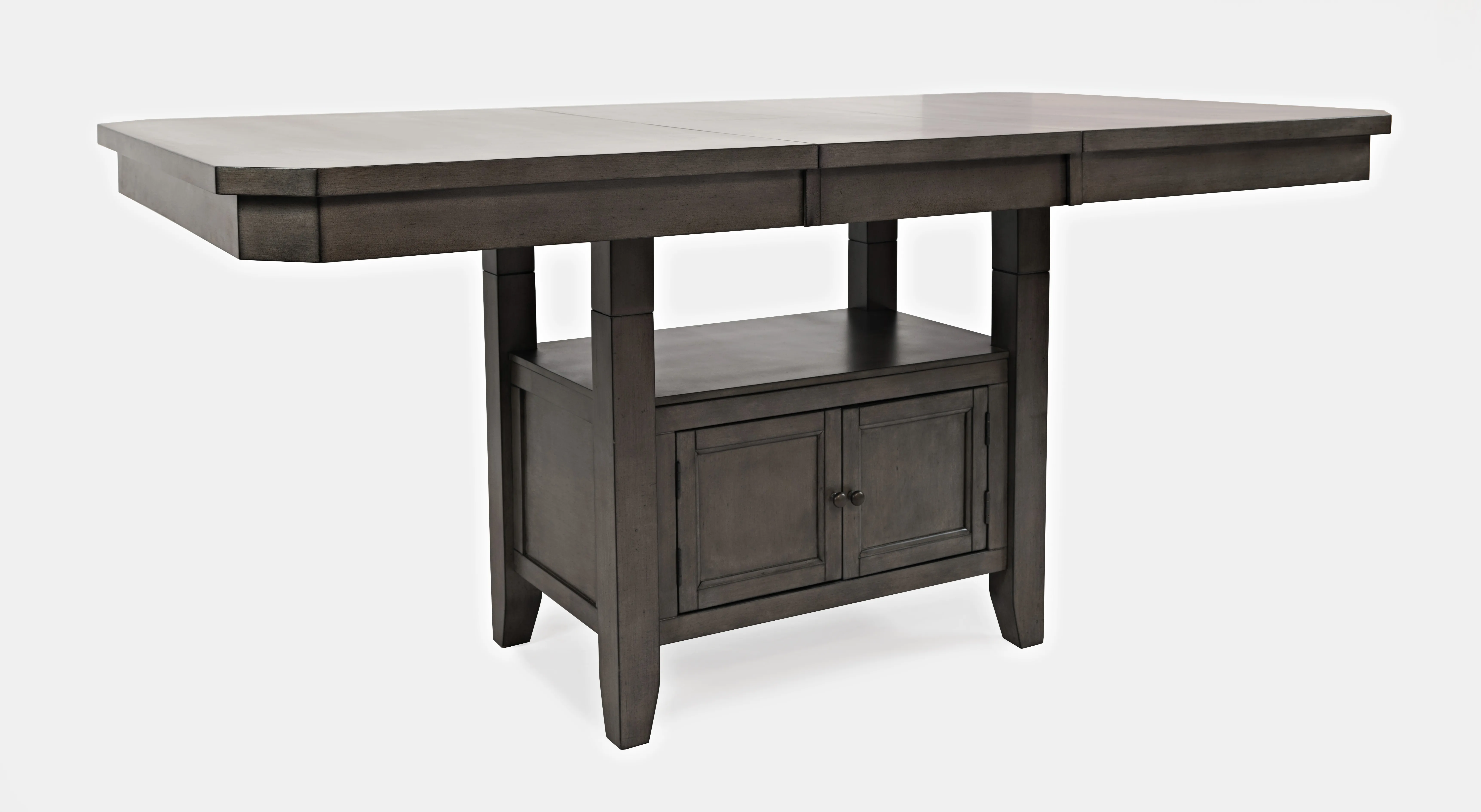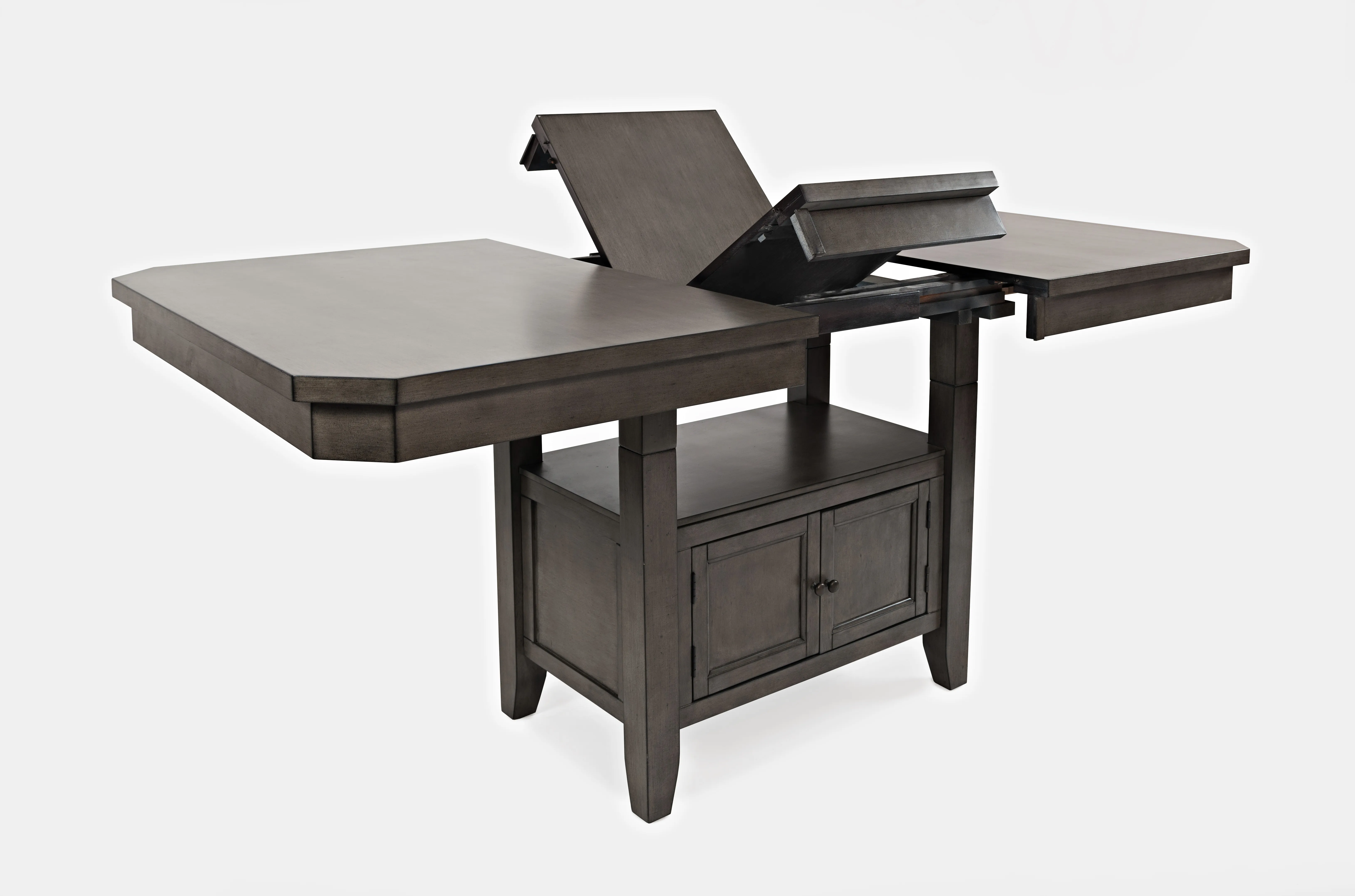 • -Adjustable Height - 30" or 36" -Double header storage base for easy accessibility (interior dimensions: 21"W x 21"D). -Shelf from Top of Storage to table: 11"H -(1) 12" butterfly leaf -For residential use only -Ships in (2) boxes -