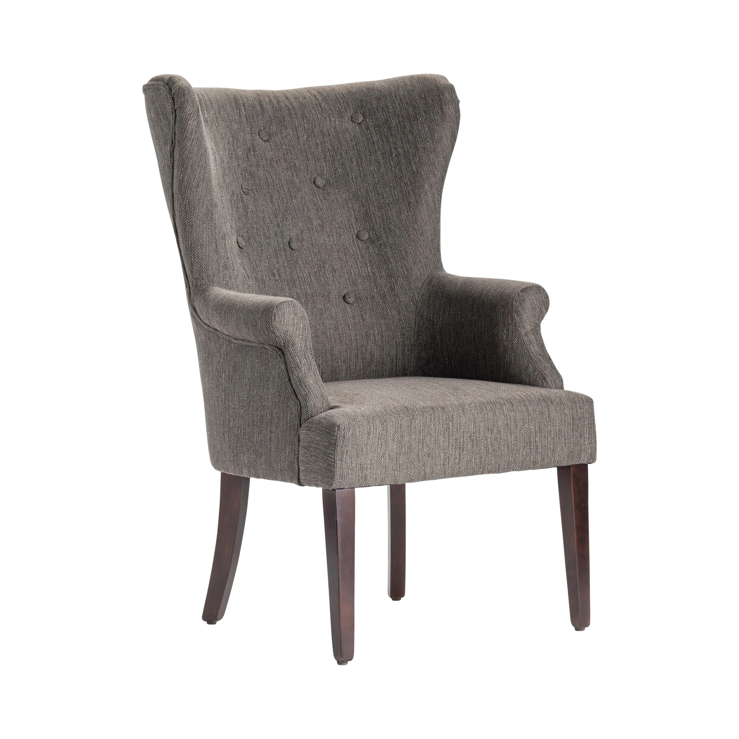 Set your body down at the end of a day on this Crestview Collection Seville gray Upholsted Button Tufted Wingback Chair. This chair's support gives you just the right balance of relaxing cushion and structure so that you can rest just enough and get back up refreshed. The dark gray upholstery is elegant with traditional button tufting details, and the black birch wood finished legs complete the look.