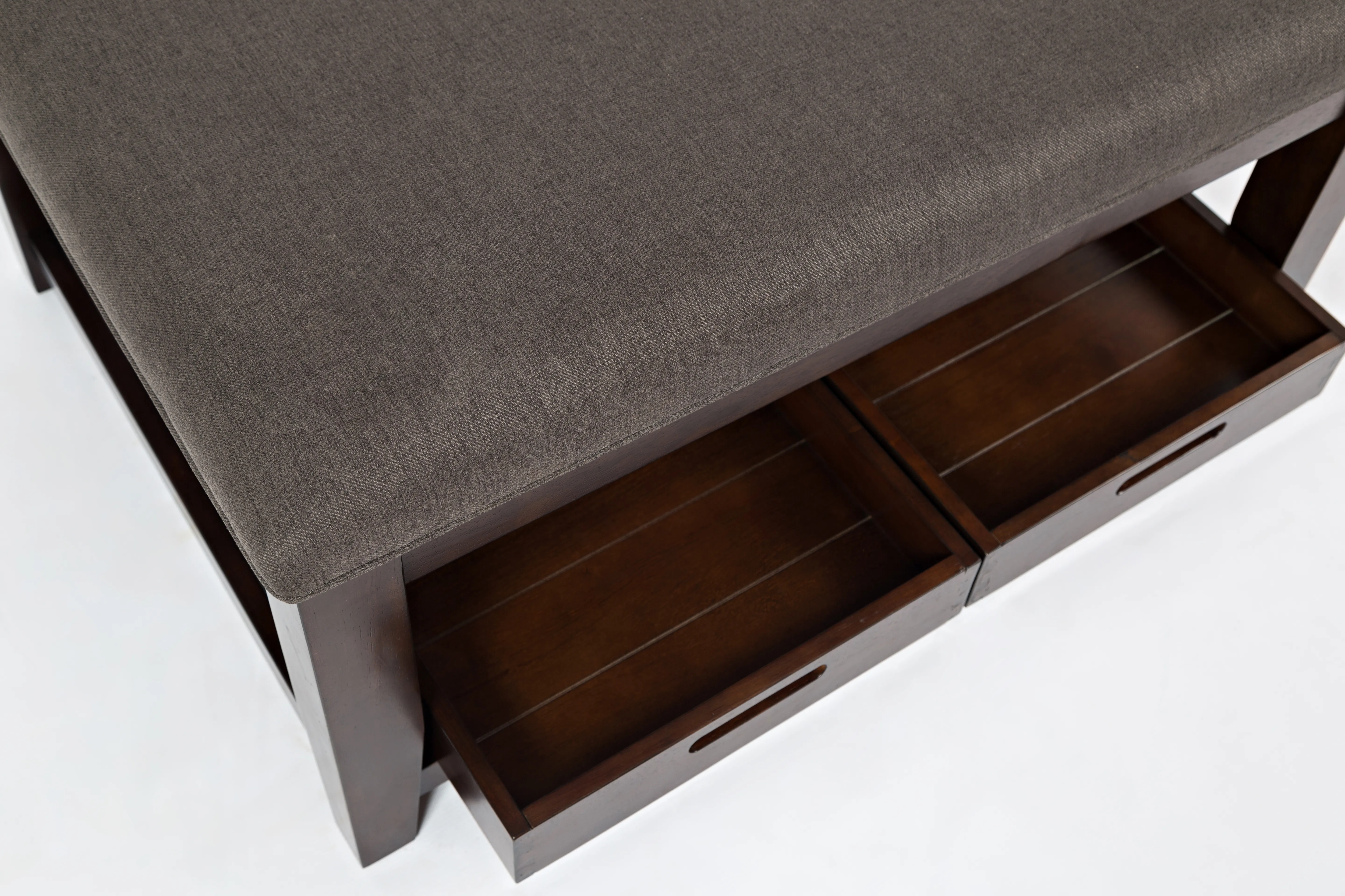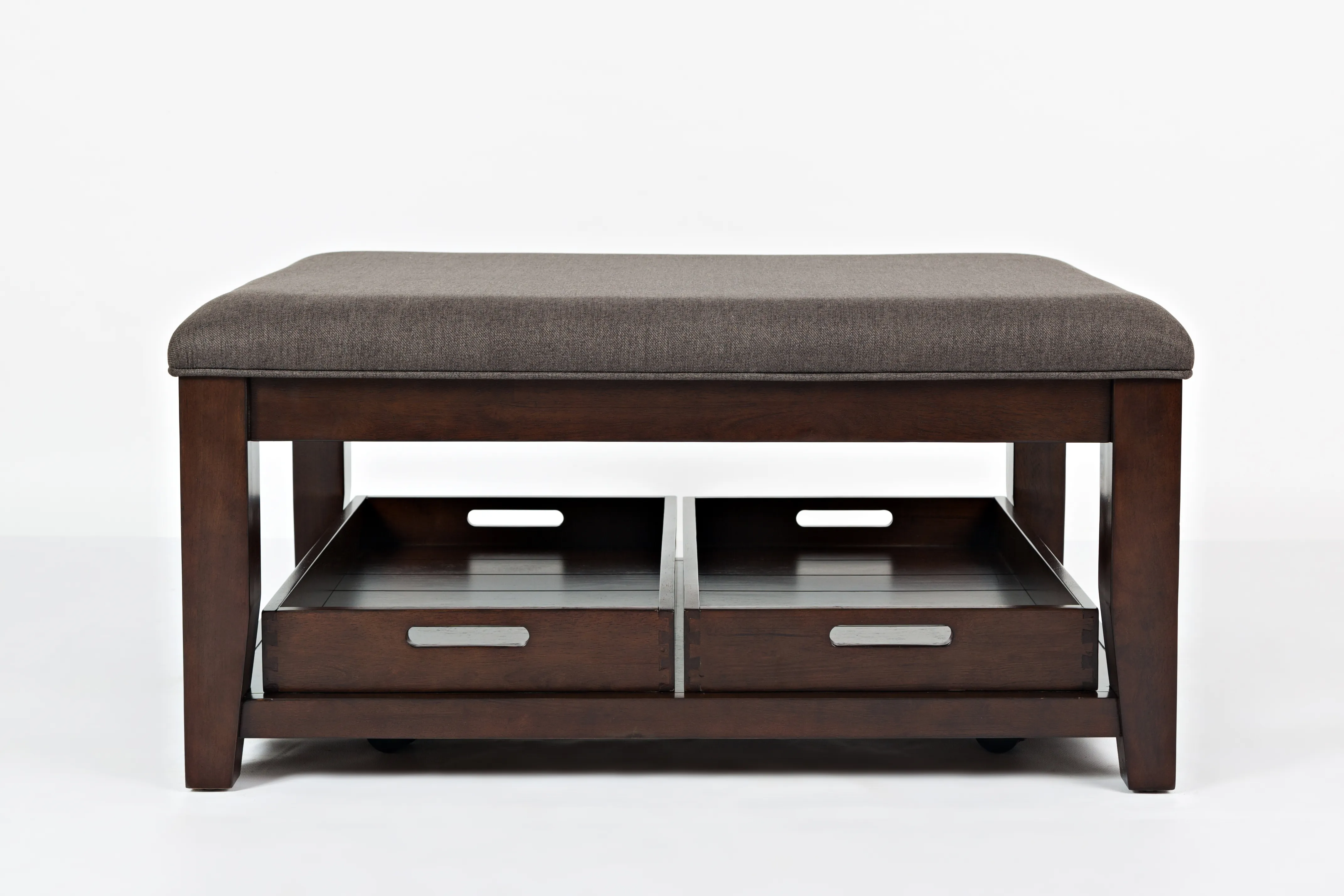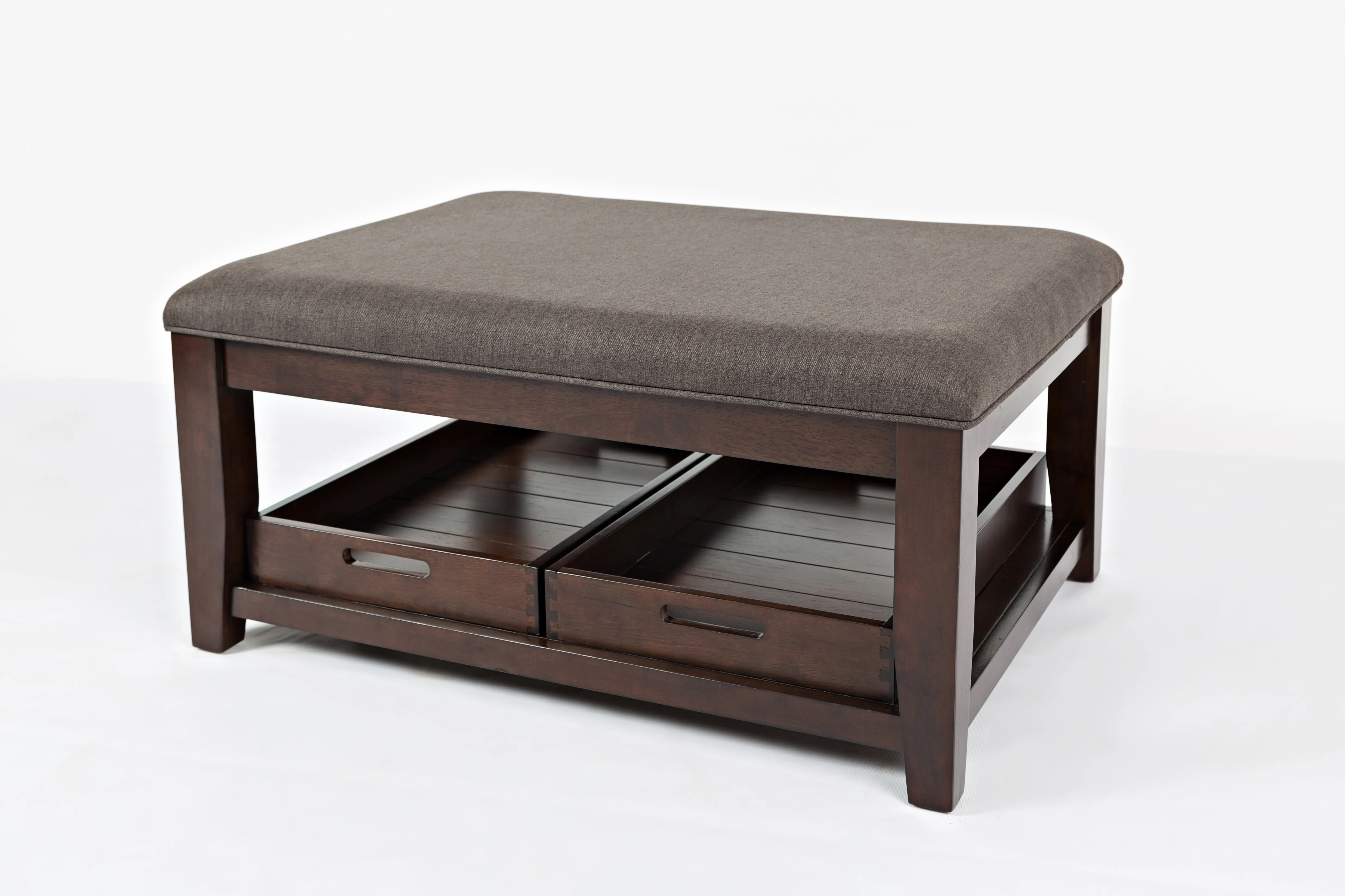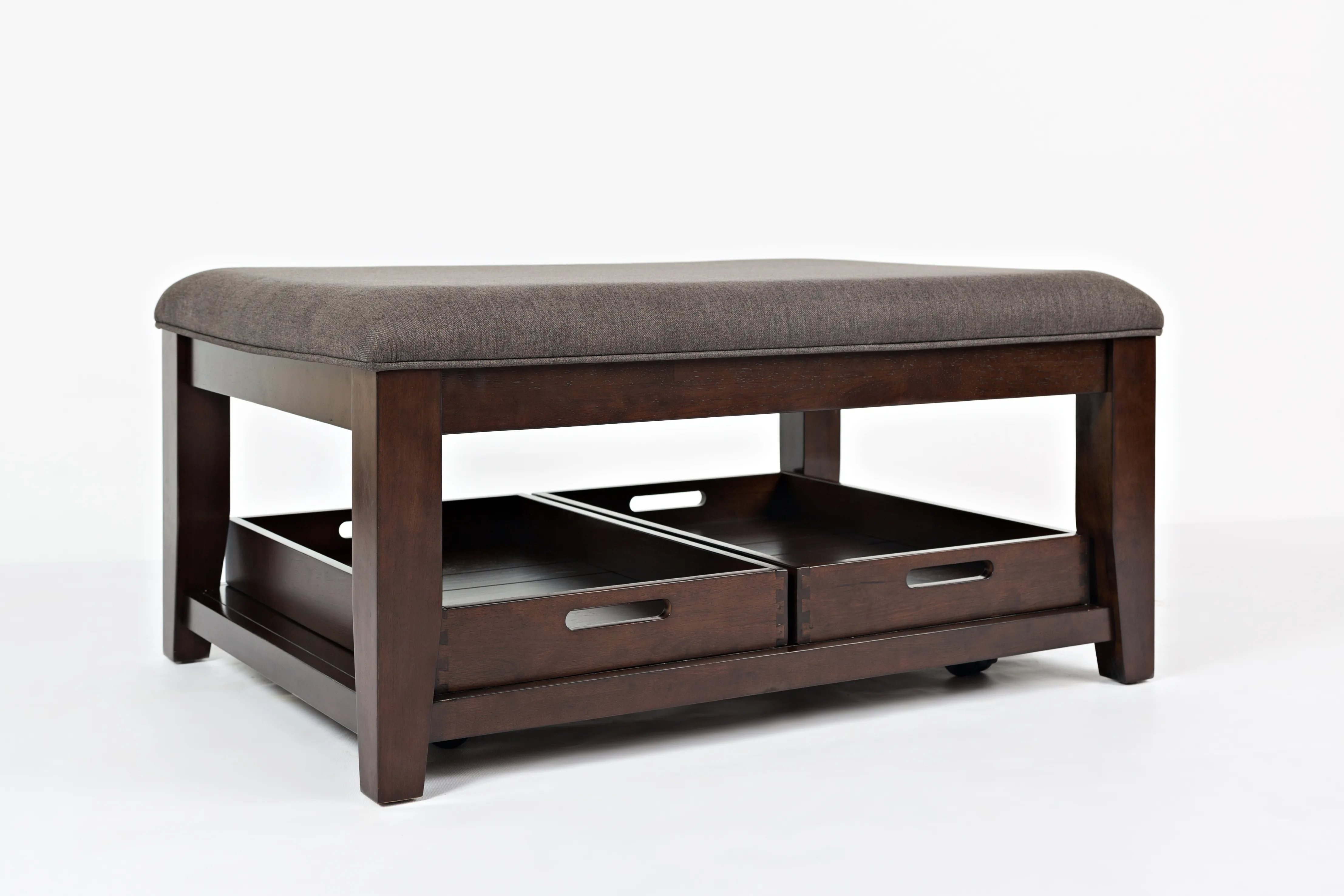 Jofran's Twin Cities Occasional Collection is offers your living room a classic look with its dark finish and solid silhouettes, but it's the ottoman cocktail table that is the real star of this group. Upholstered with our Easy Living charcoal fabric, it is stain resistant and moisture repellent- making it perfect for everyday life. This group also includes sofa, end, and chairside tables.