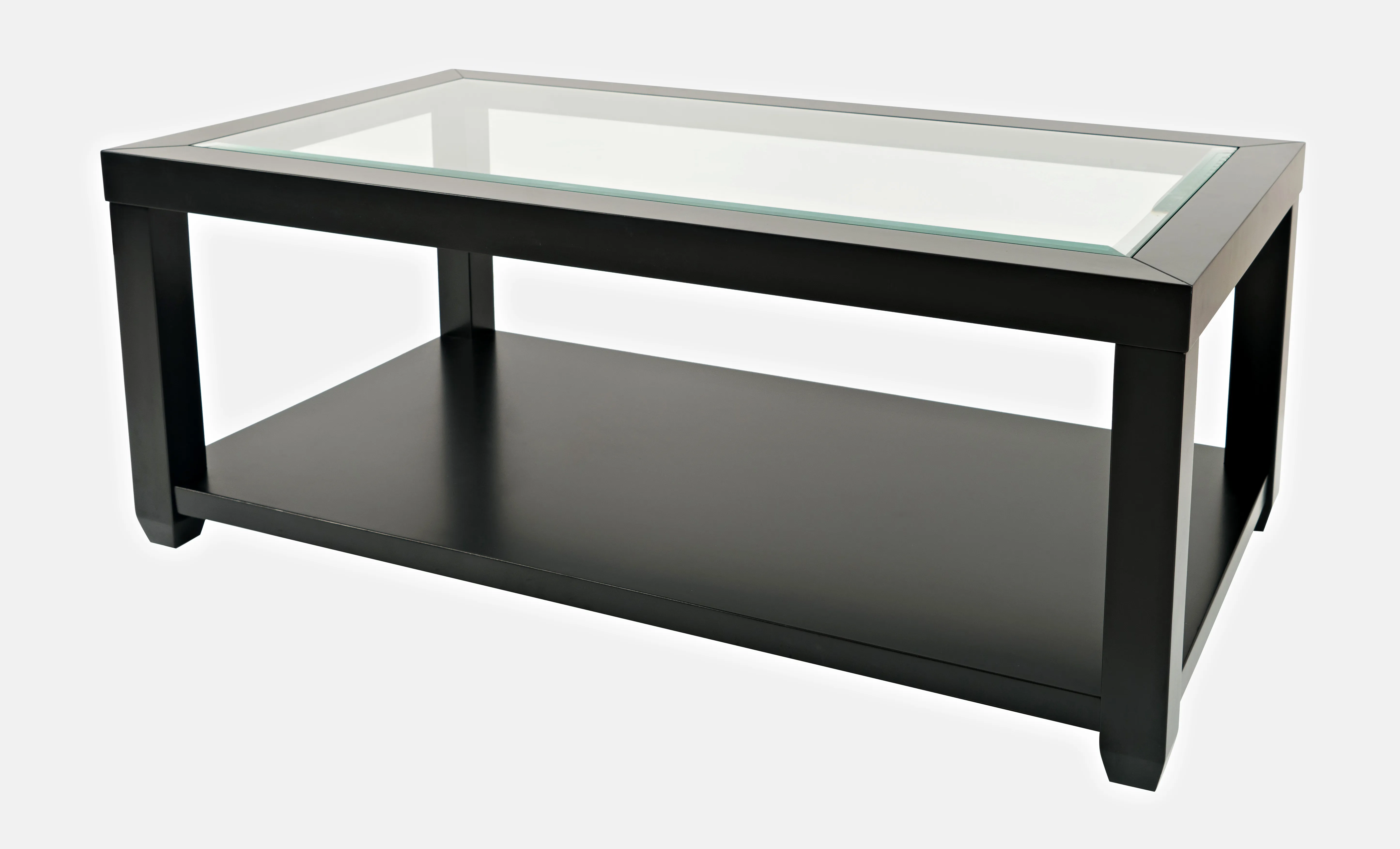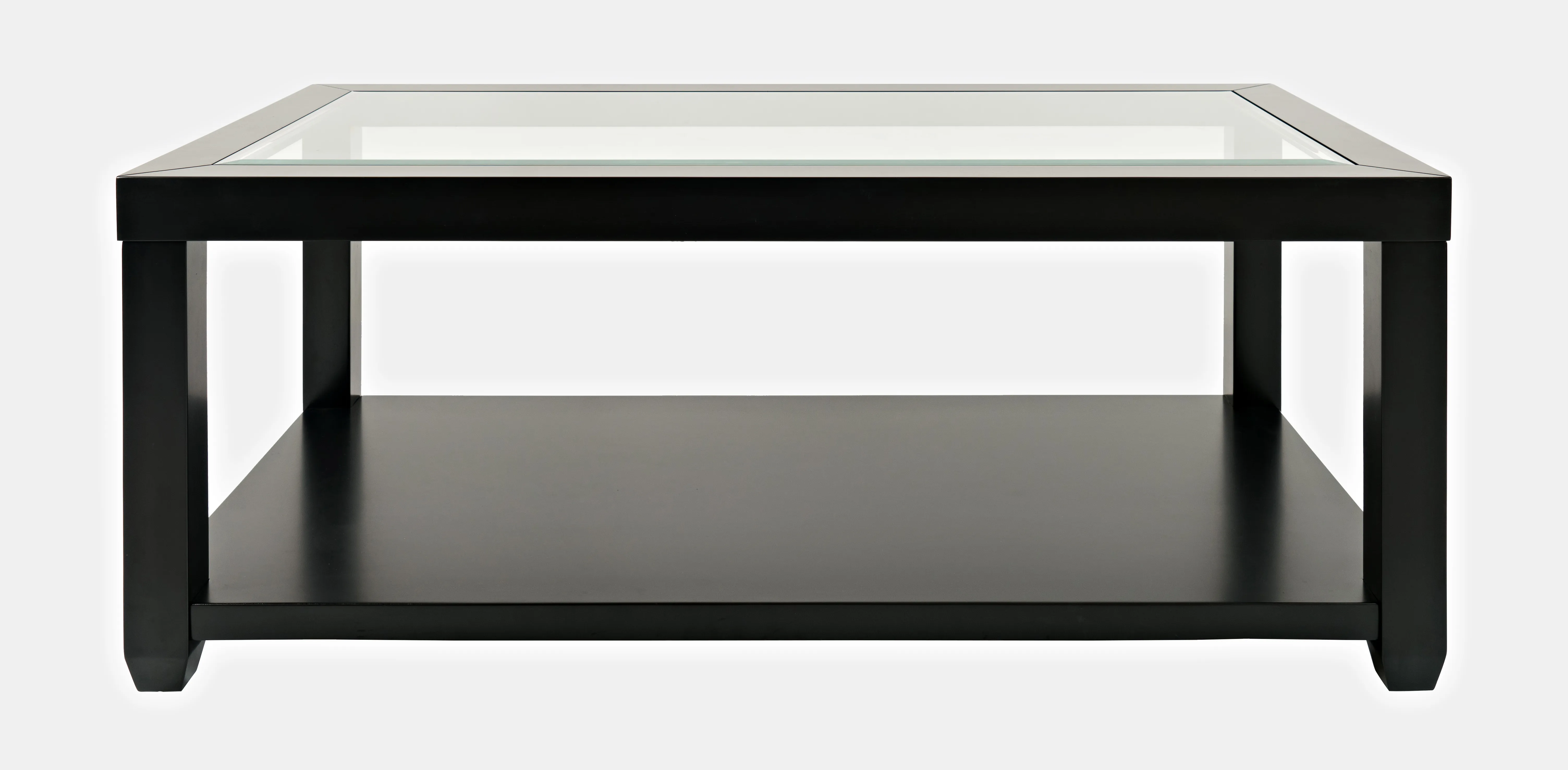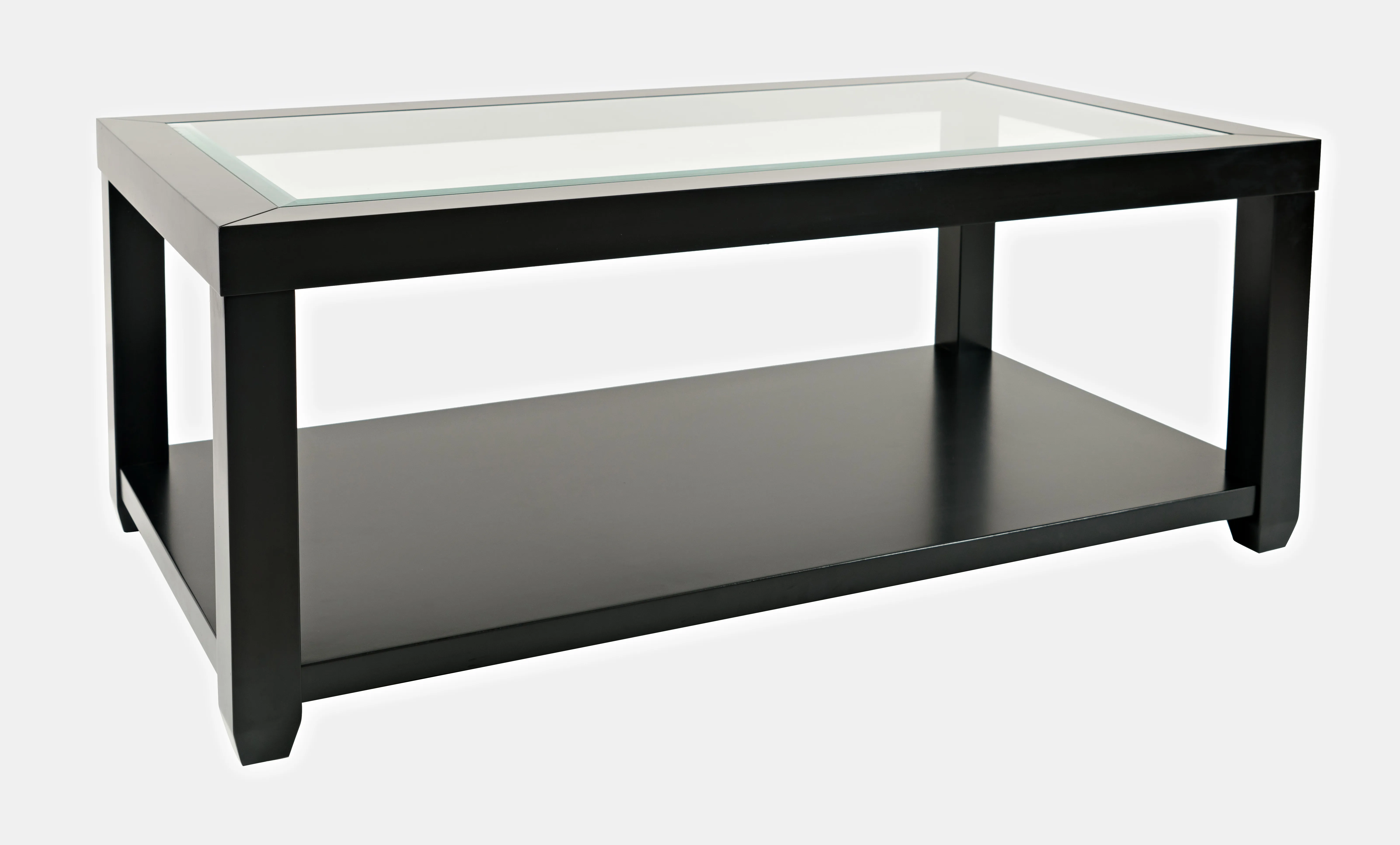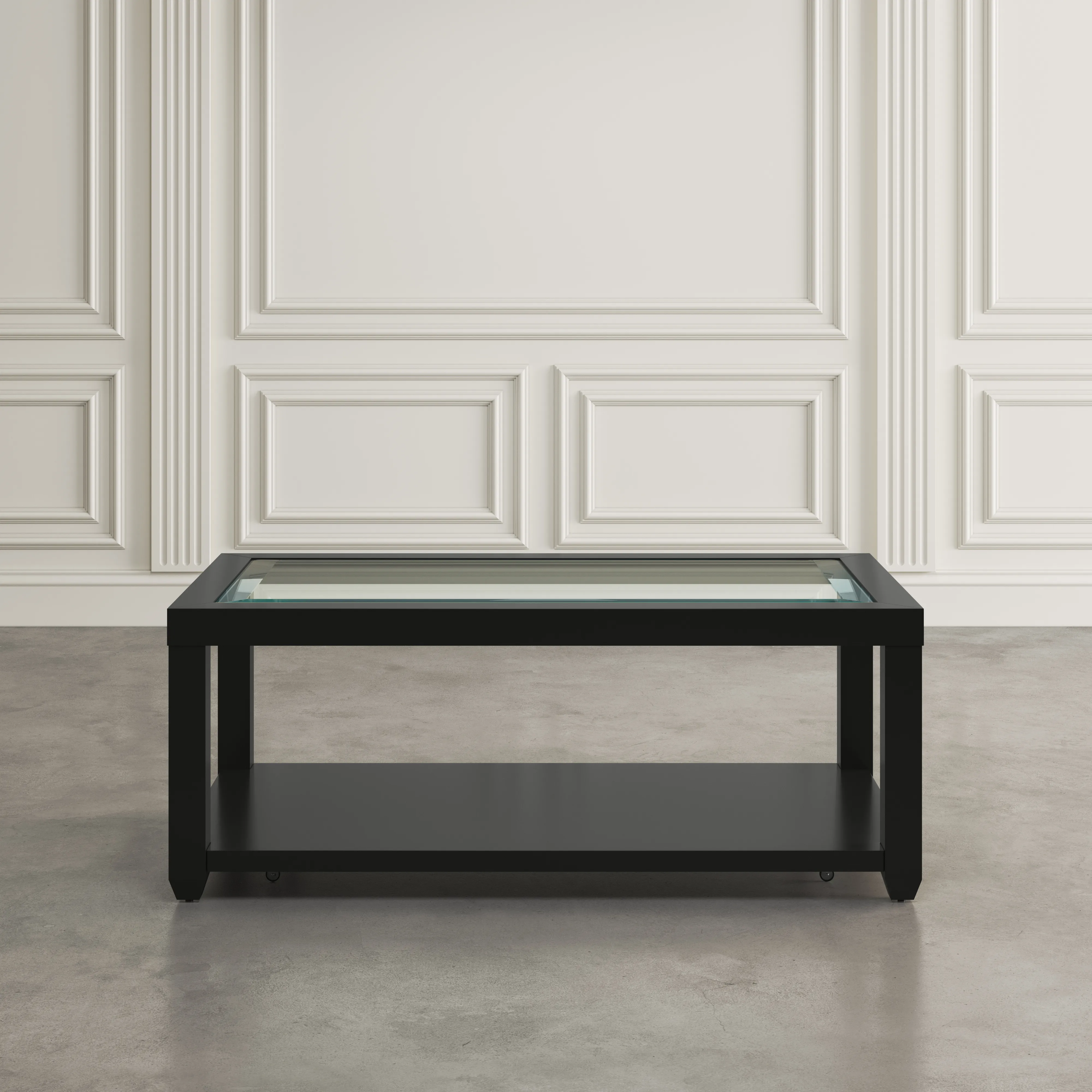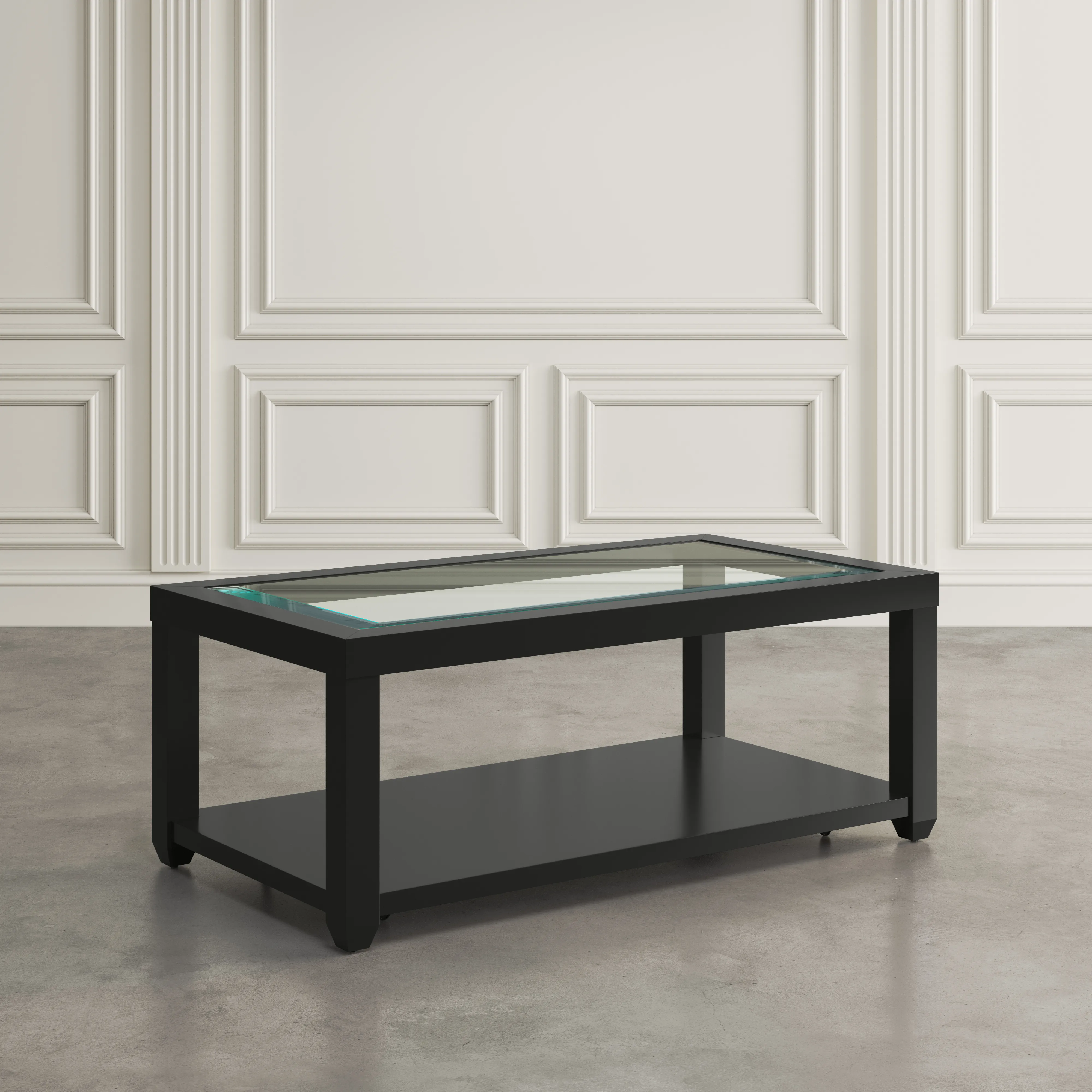 Contemporary style with a solid tempered glass inlay, this Urban Icon Rectangular Coffee Table features three unique color options and modern beveled edges. One full-length storage shelf is included, and the optional caster wheels make moving easy. Available In White, Black, and Merlot finishes.