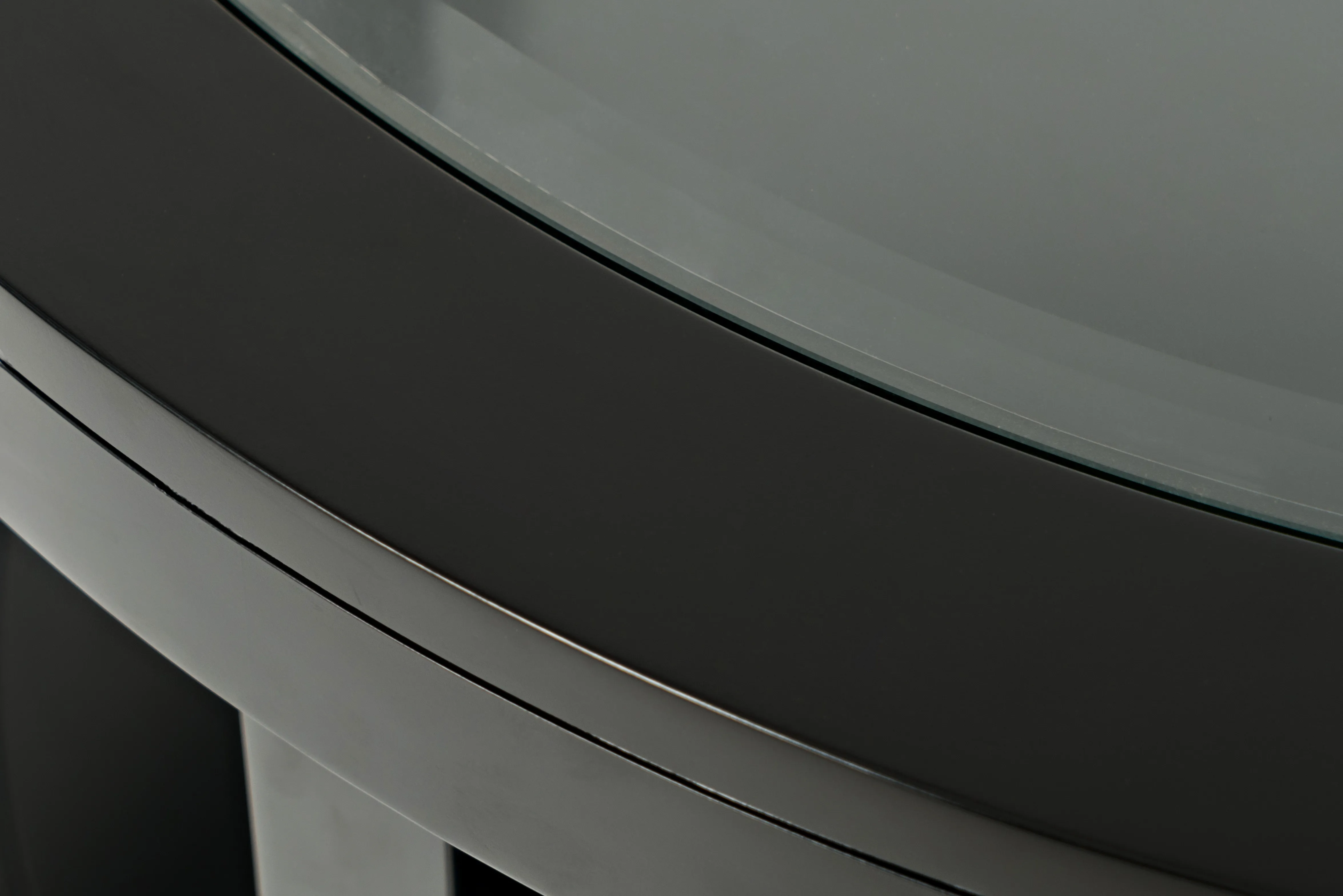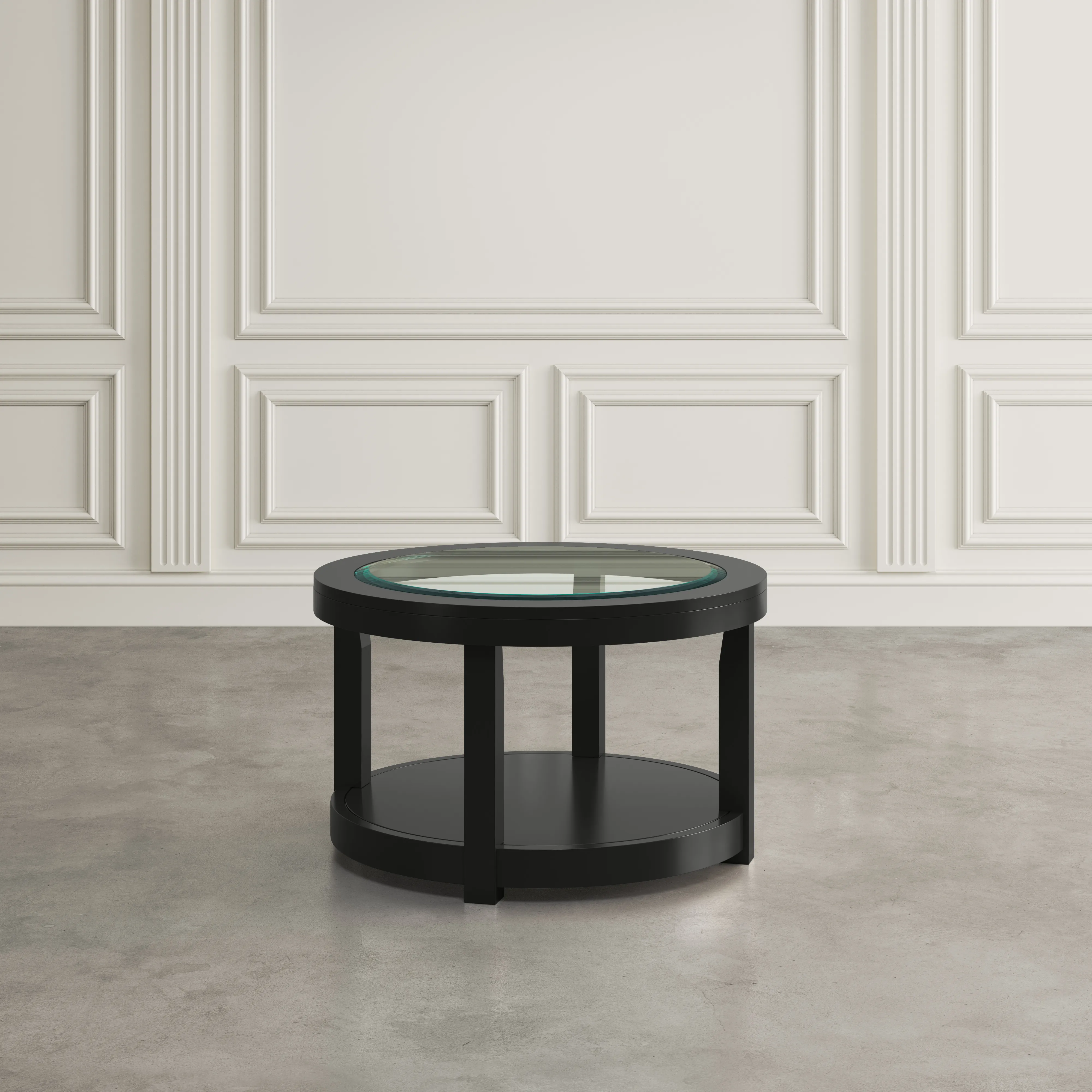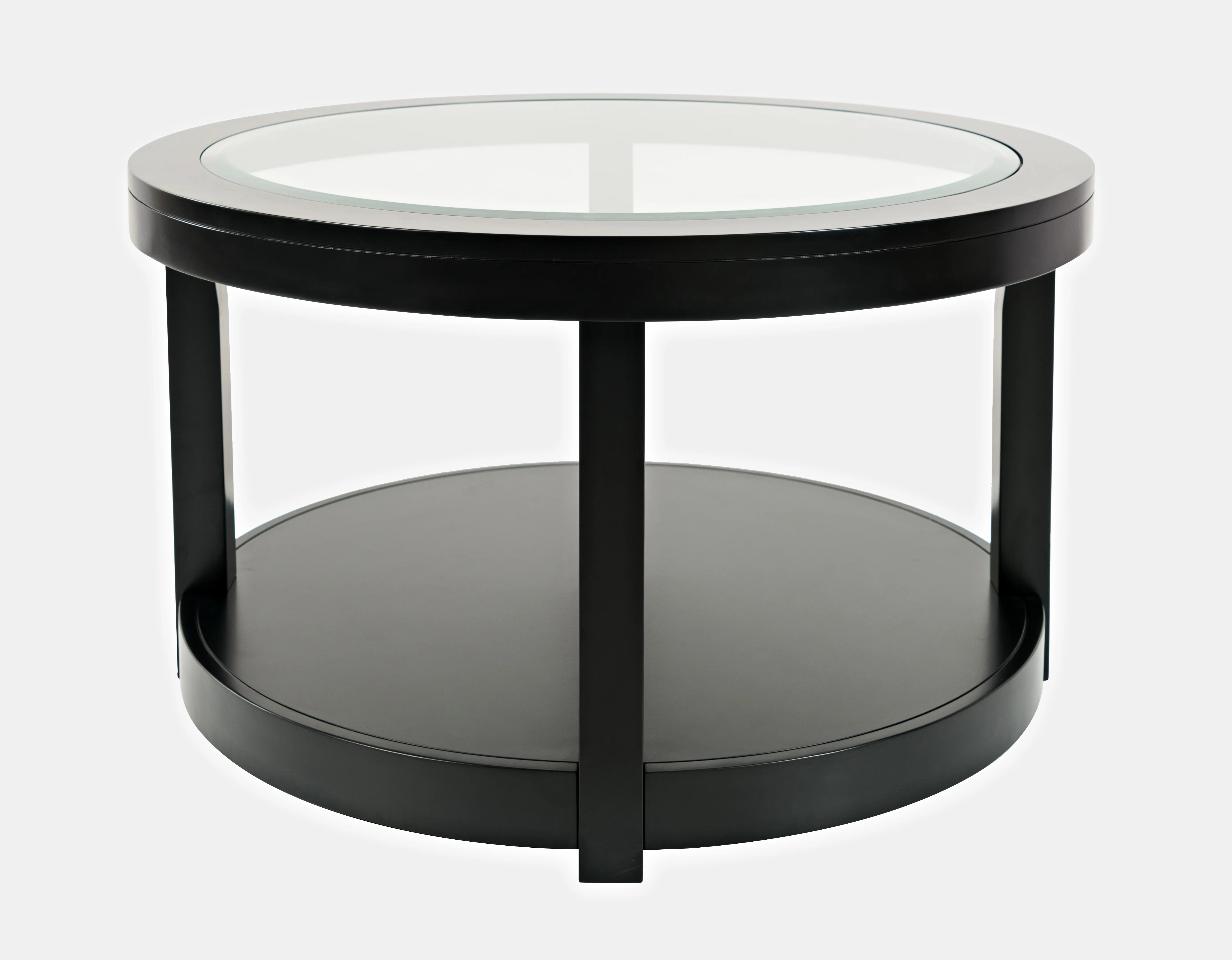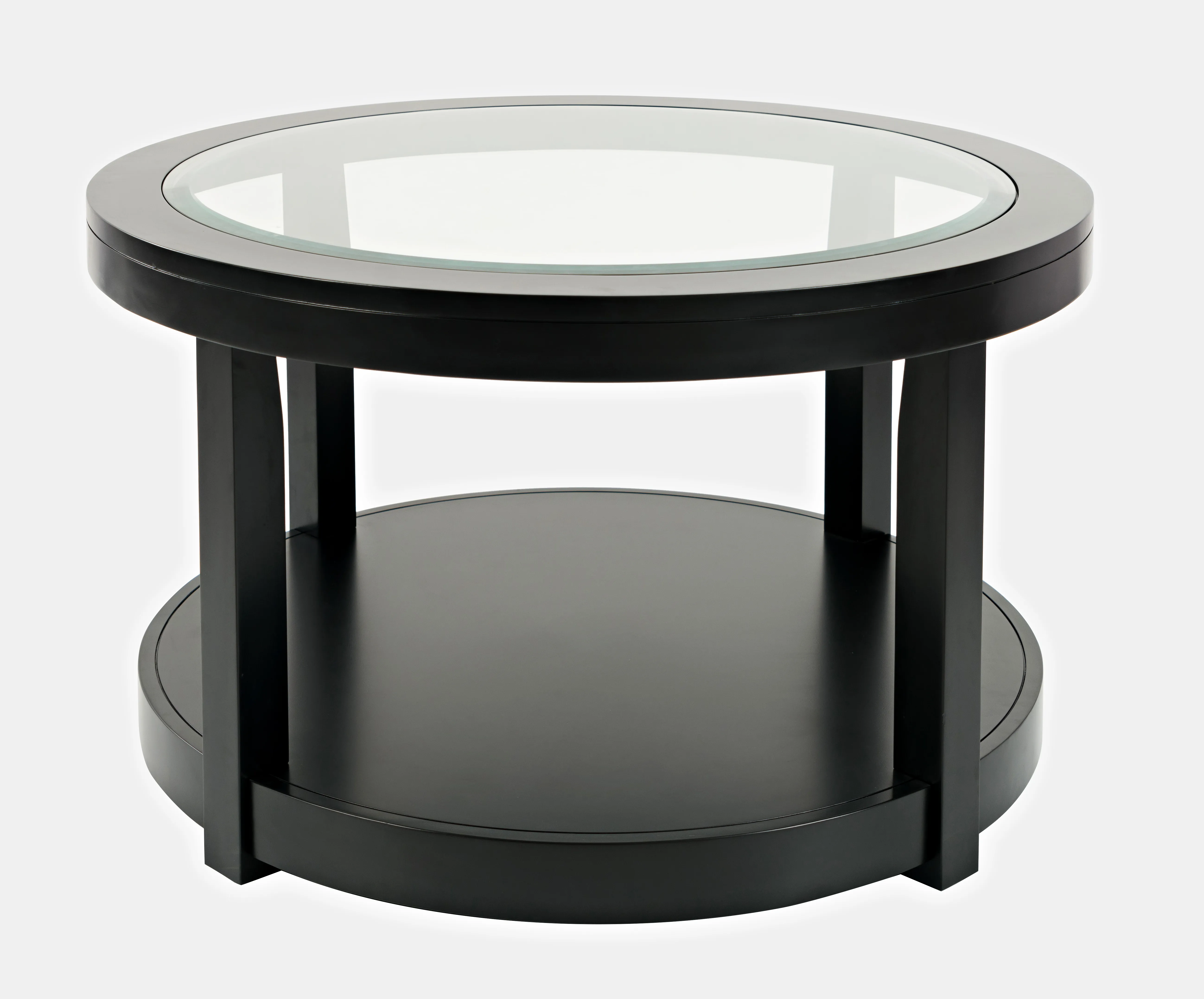 Contemporary style with a solid tempered glass inlay, this Urban Icon Round Coffee Table features three unique color options and modern beveled edges. One full-length storage shelf is included, and the optional caster wheels make moving easy. Available In White, Black, and Merlot finishes.