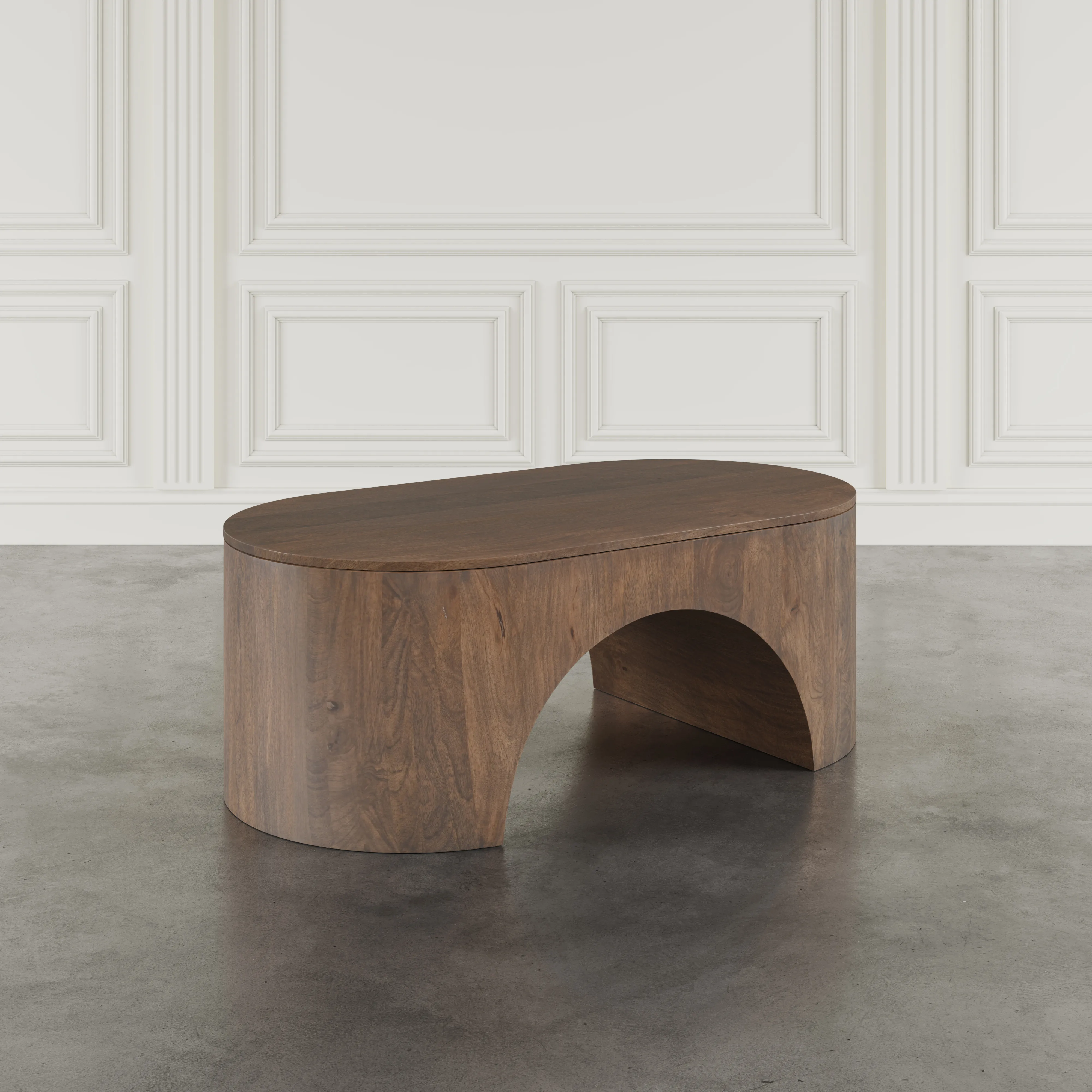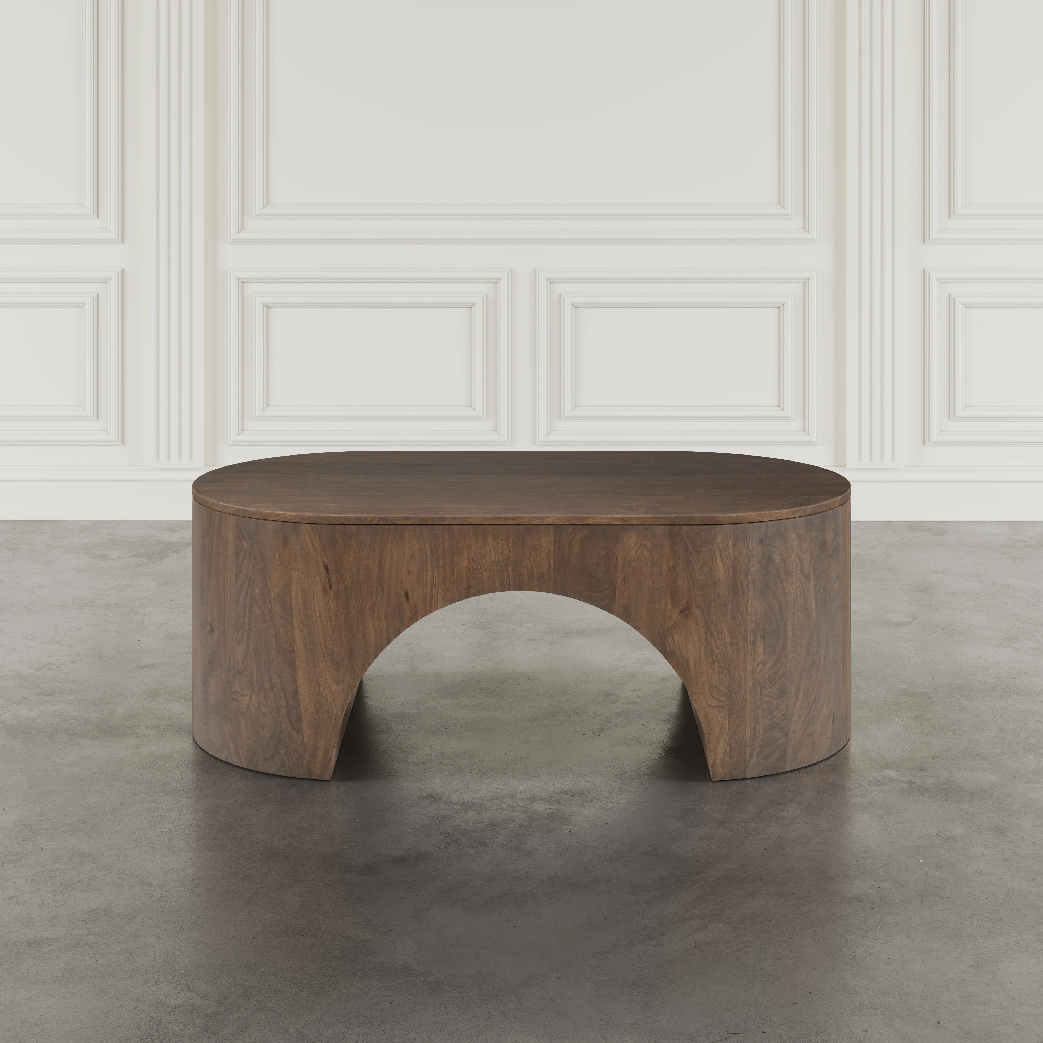 Elevate your living space with the Luna Arch Coffee Table, where clean curves meet bold craftsmanship. Made from solid wood and rich in organic character, its flowing oval top sits atop a sculpted base with sweeping arches. The seamless form and deep dark brown finish offer a grounding element for curated interiors, blending contemporary style with timeless materials. A statement piece that anchors the room without overpowering it, Luna invites tactile appreciation and visual serenity. The generous surface is ideal for styled trays, books, or entertaining essentials. Adjustable floor levelers keep the table stable on any flooring type, from wood to rugs.