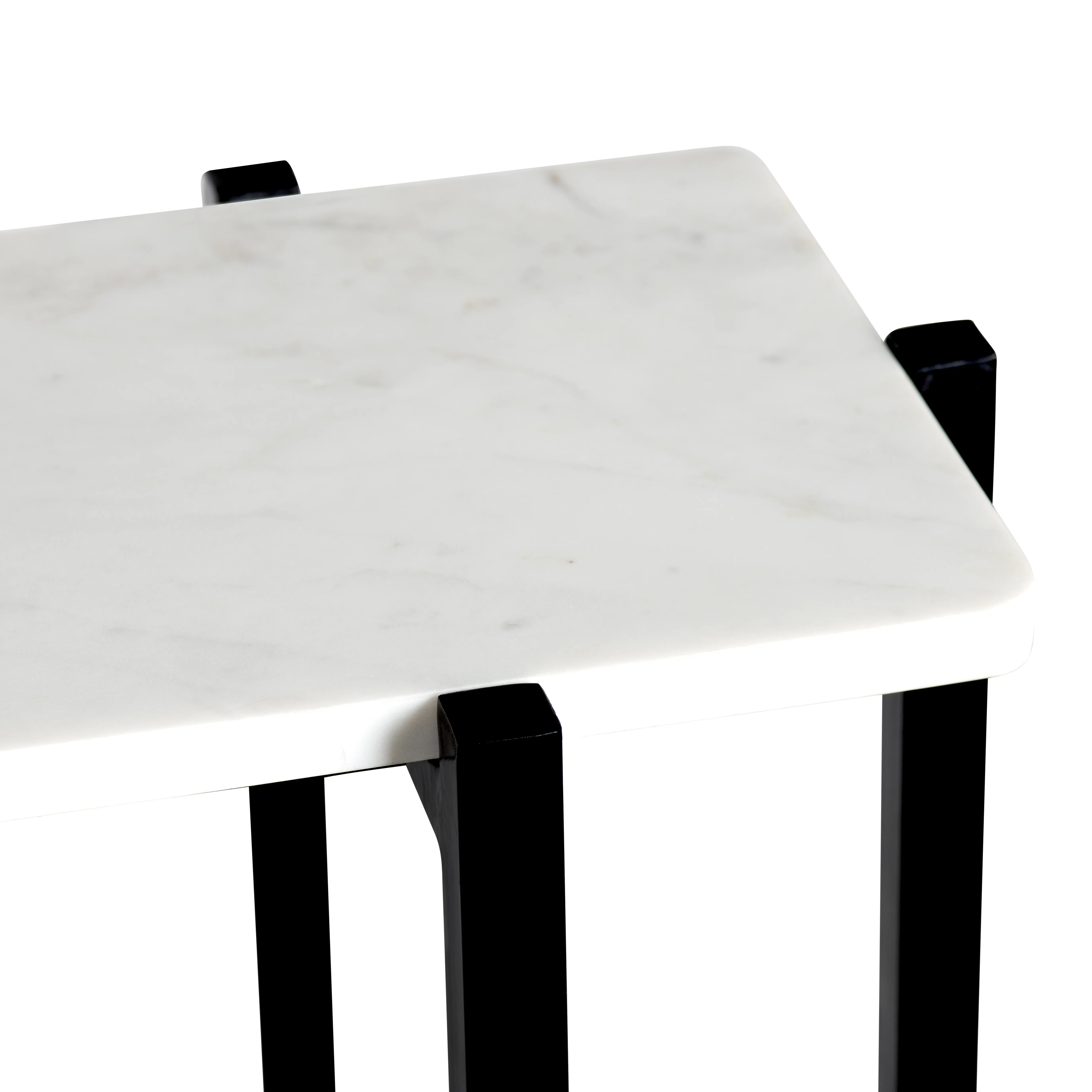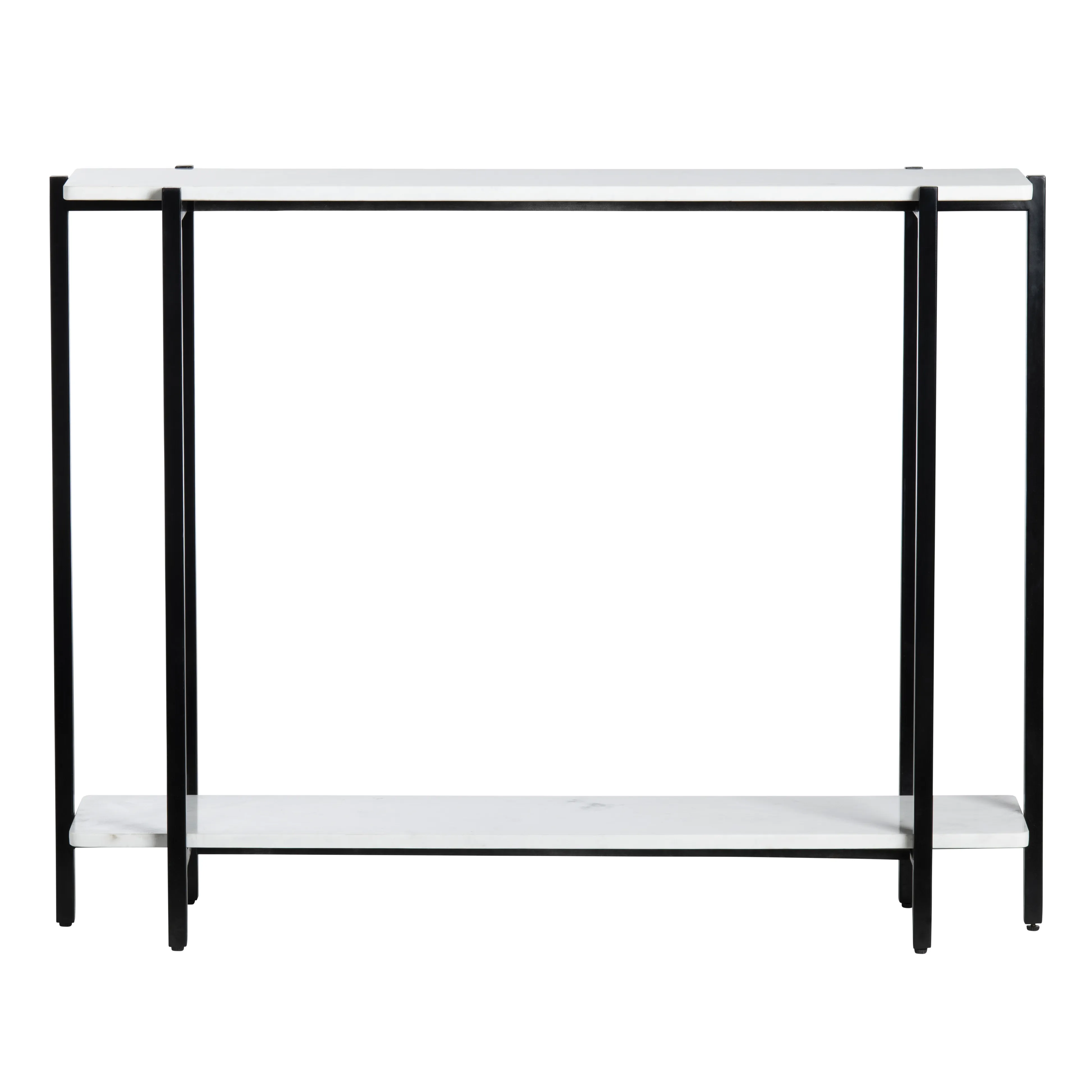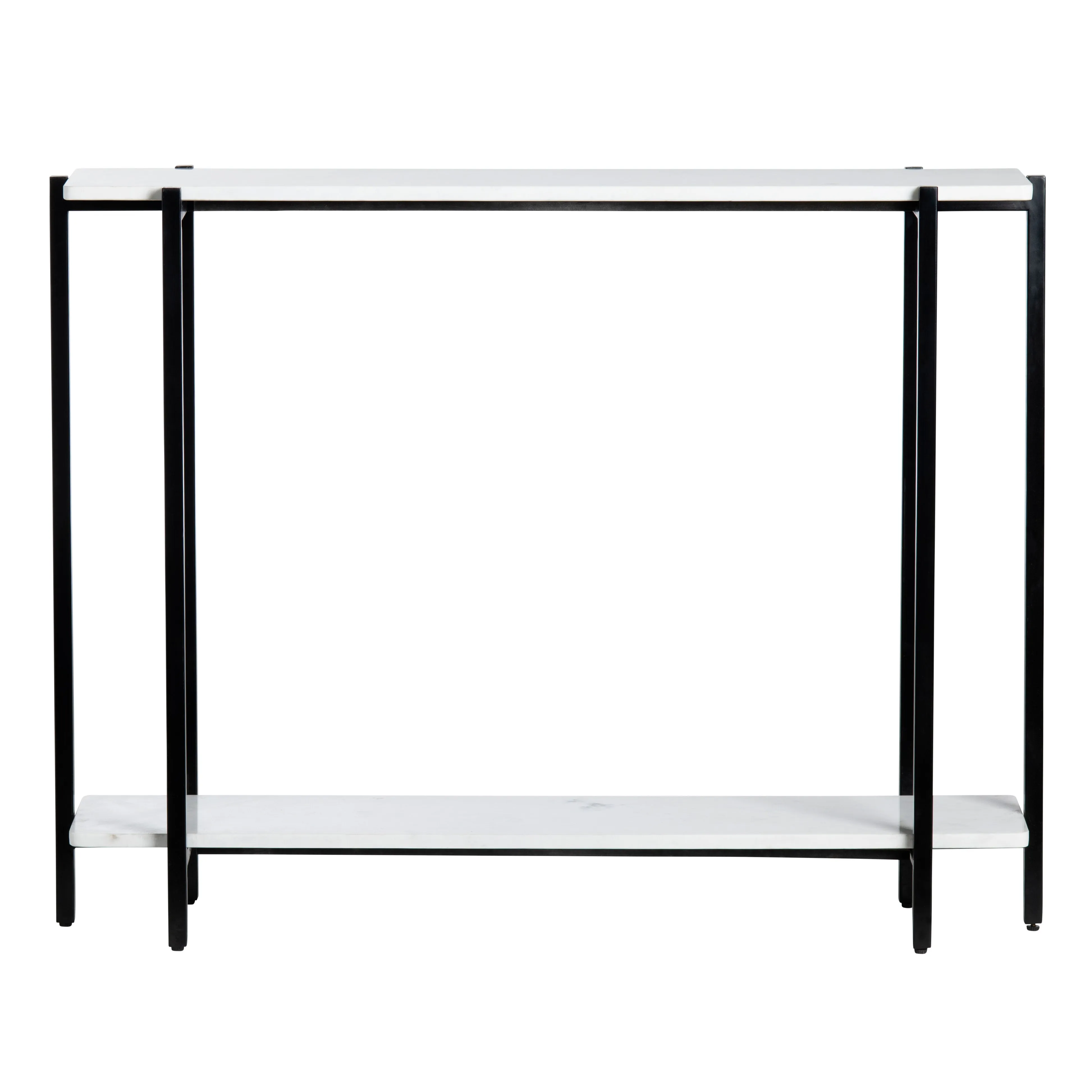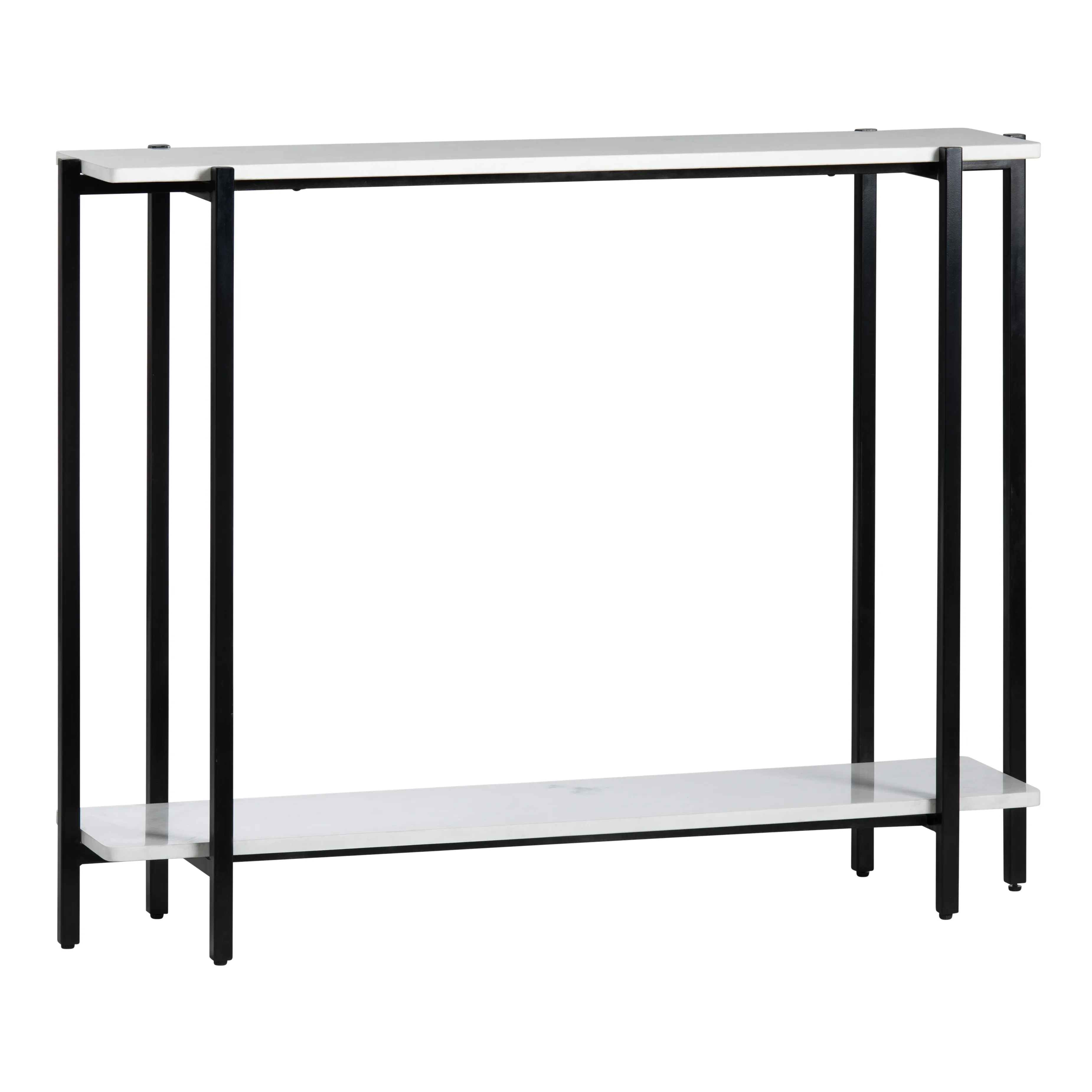 Crafted from luxurious white marble and sturdy black iron, this console table radiates modern elegance. The polished marble top showcases natural veining, adding a refined touch, while the brushed black iron legs provide a sleek contrast. A fixed lower shelf offers additional storage and display space. Designed with levelers for stability on uneven surfaces, this rectangular piece blends style with functionality. Minimal assembly required, making it an effortless addition to any space.