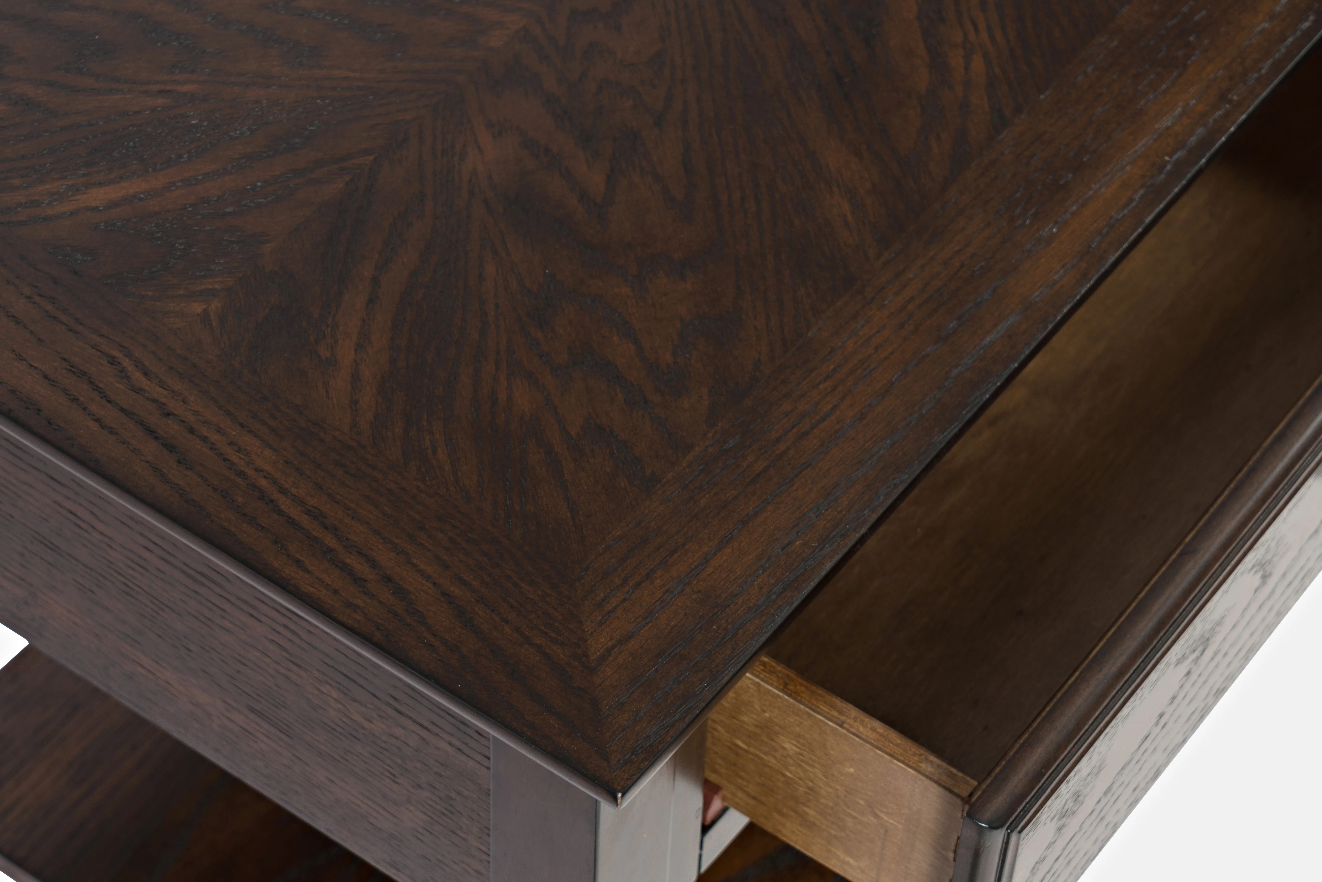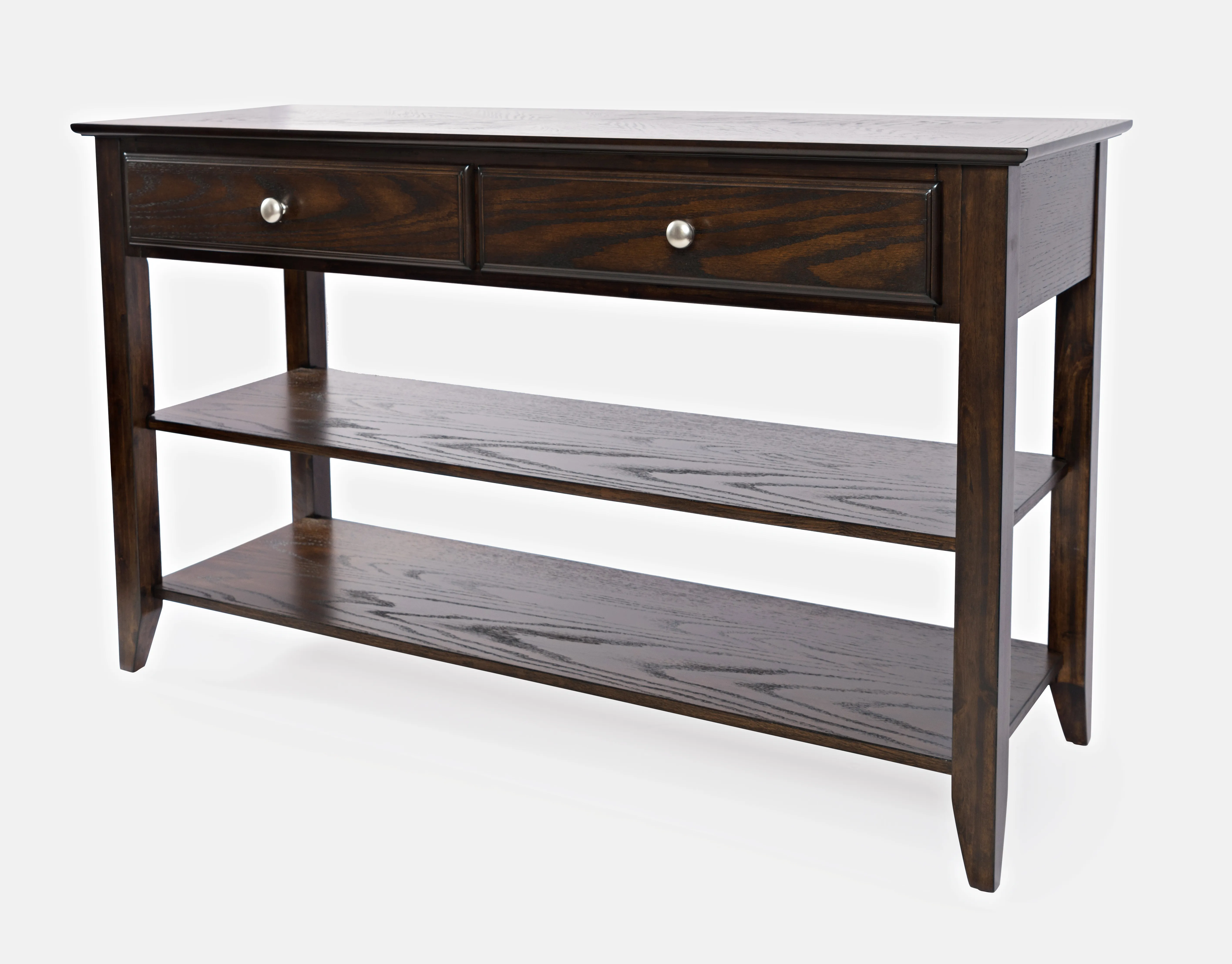 A smooth finish, a dovetailed drawer and brushed nickel hardware make this Espresso Modern Sofa Table everyone's favorite. There is plenty of storage with two full-size drawers and two shelves, perfect for adding to a hallway, against a wall or couch in your living room, or for an extra pop of style in the dining room. Available in Espresso Brown and Grey-Brown Carlton finishes.