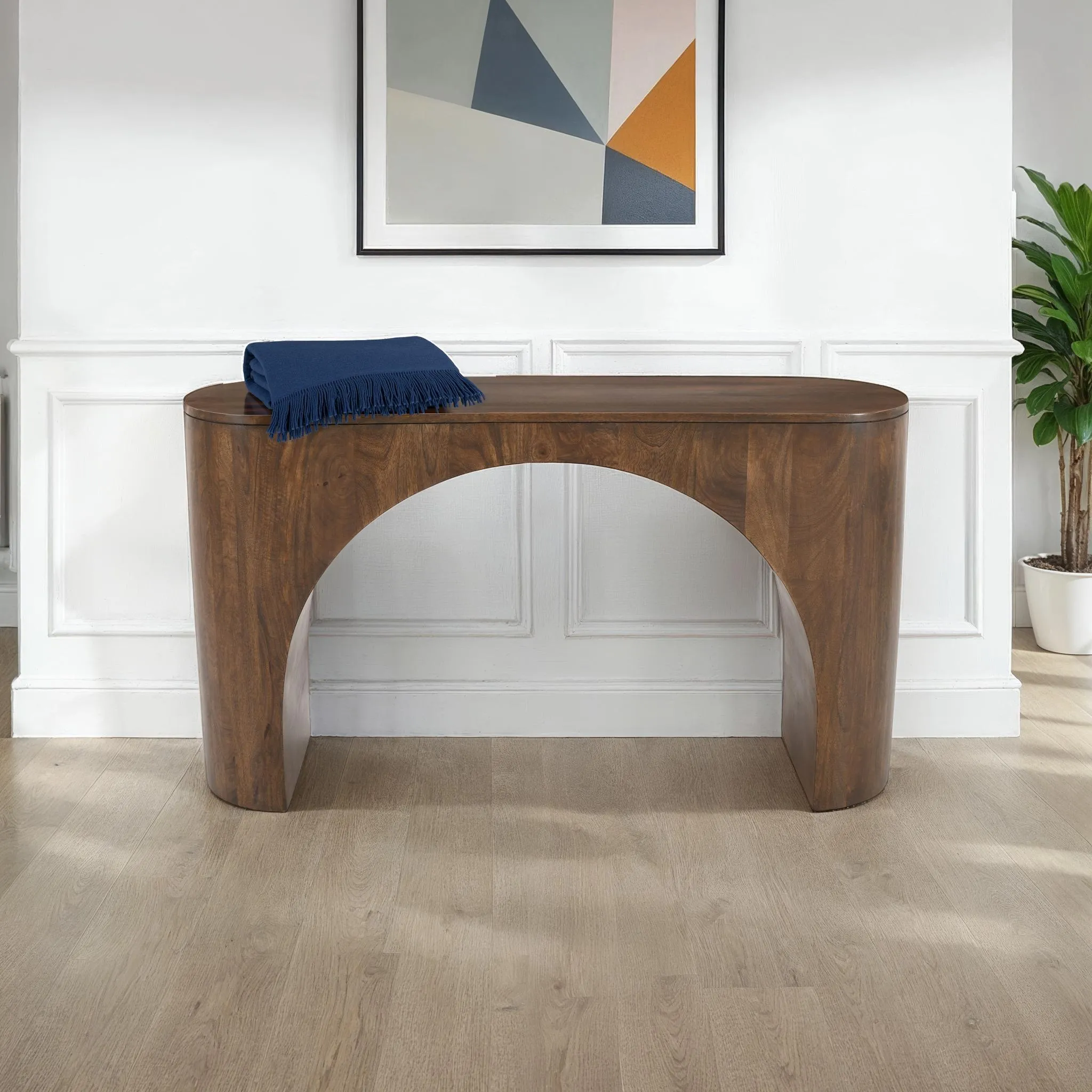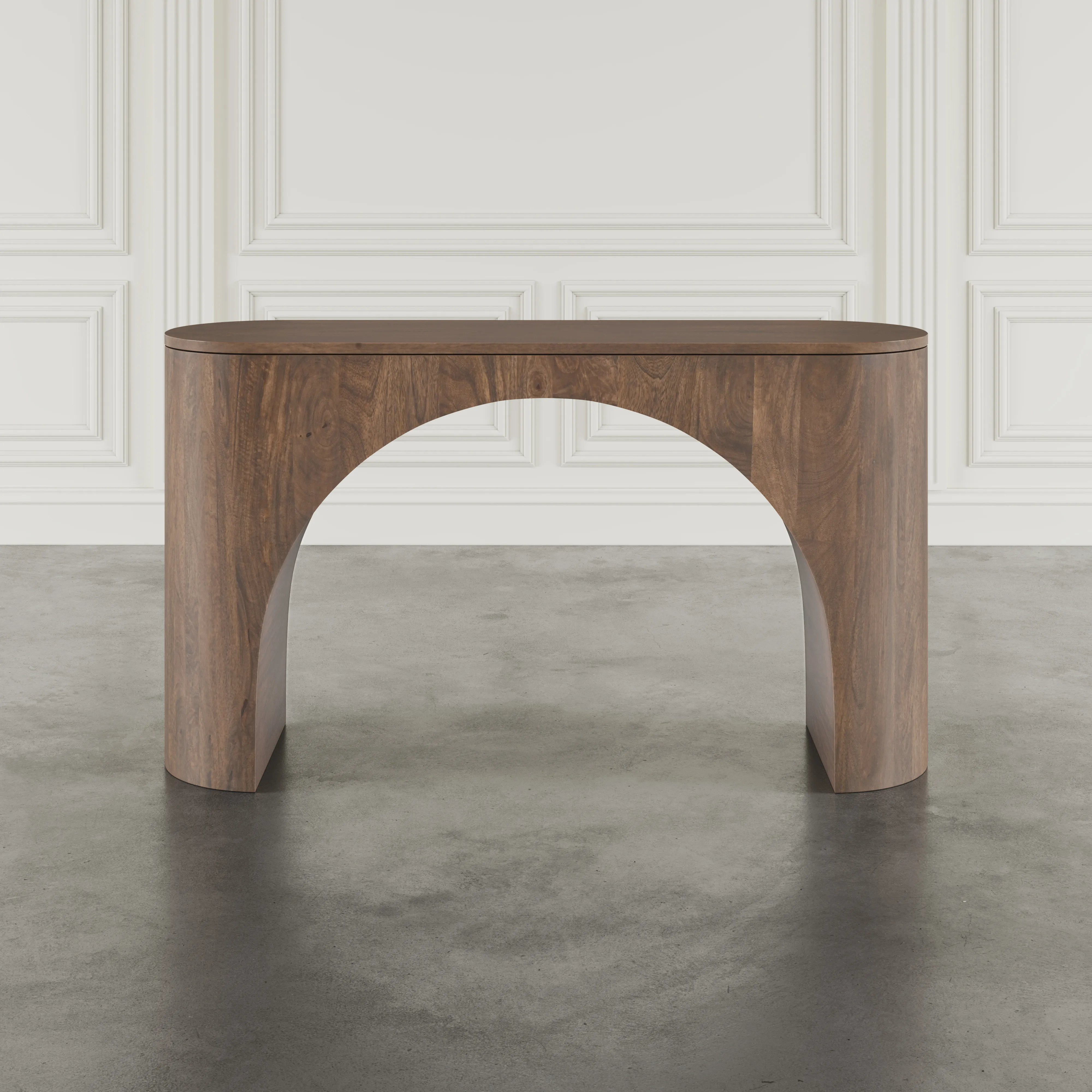 Sculptural and refined, the Luna Arched Console Table brings modern sophistication to any entryway or living space. Crafted from solid wood and finished in a rich dark brown tone, its waterfall silhouette and soft oval edges create a sense of organic flow. The dramatic center arch introduces architectural presence while maintaining visual lightness. Perfectly balanced between form and function, Luna adds warmth and depth to minimalist or transitional interiors. Whether styled with a decorative mirror, layered artwork, or a sculptural lamp, this piece becomes a quiet focal point that complements the space rather than overwhelms it. It also includes adjustable floor levelers to ensure stability on a variety of surfaces.