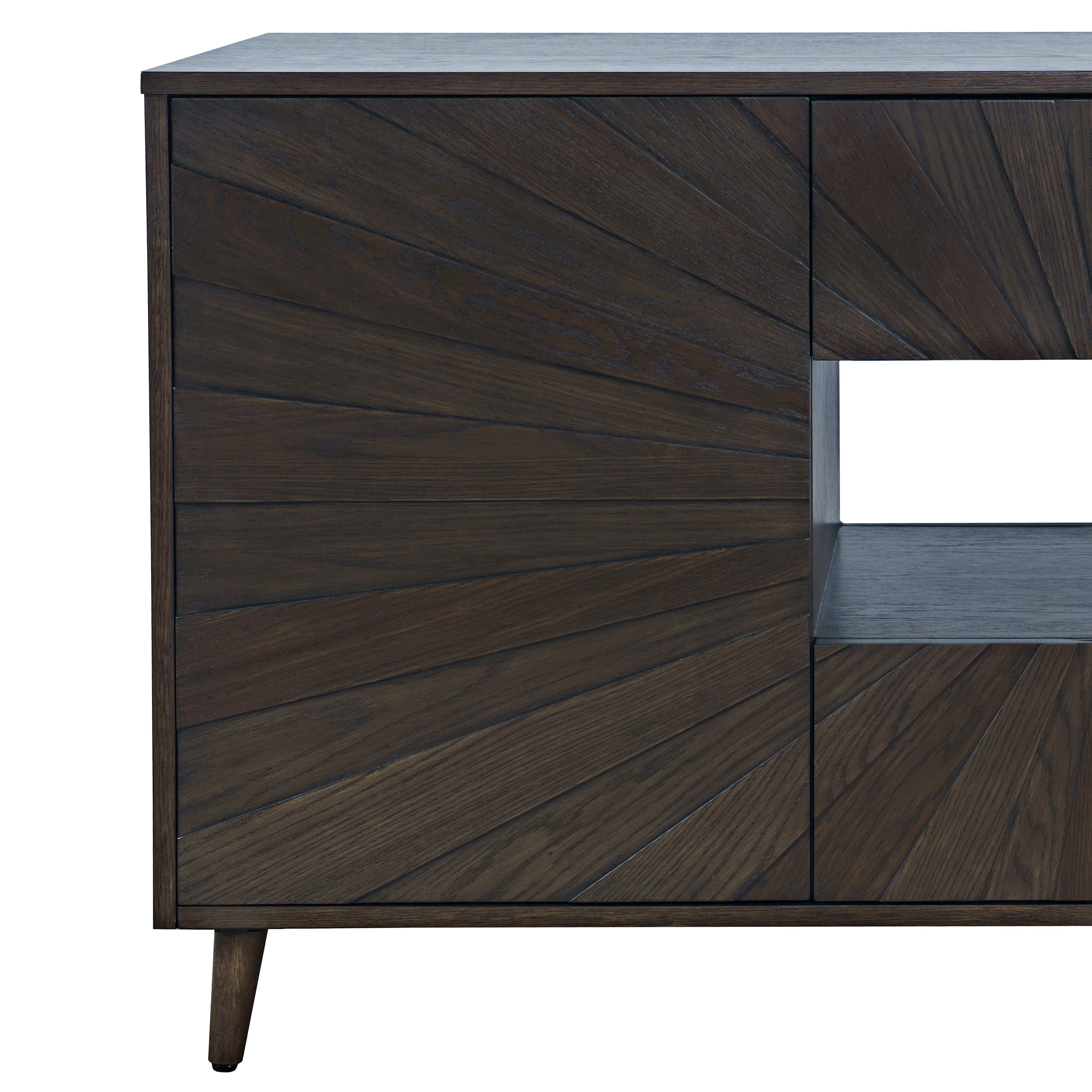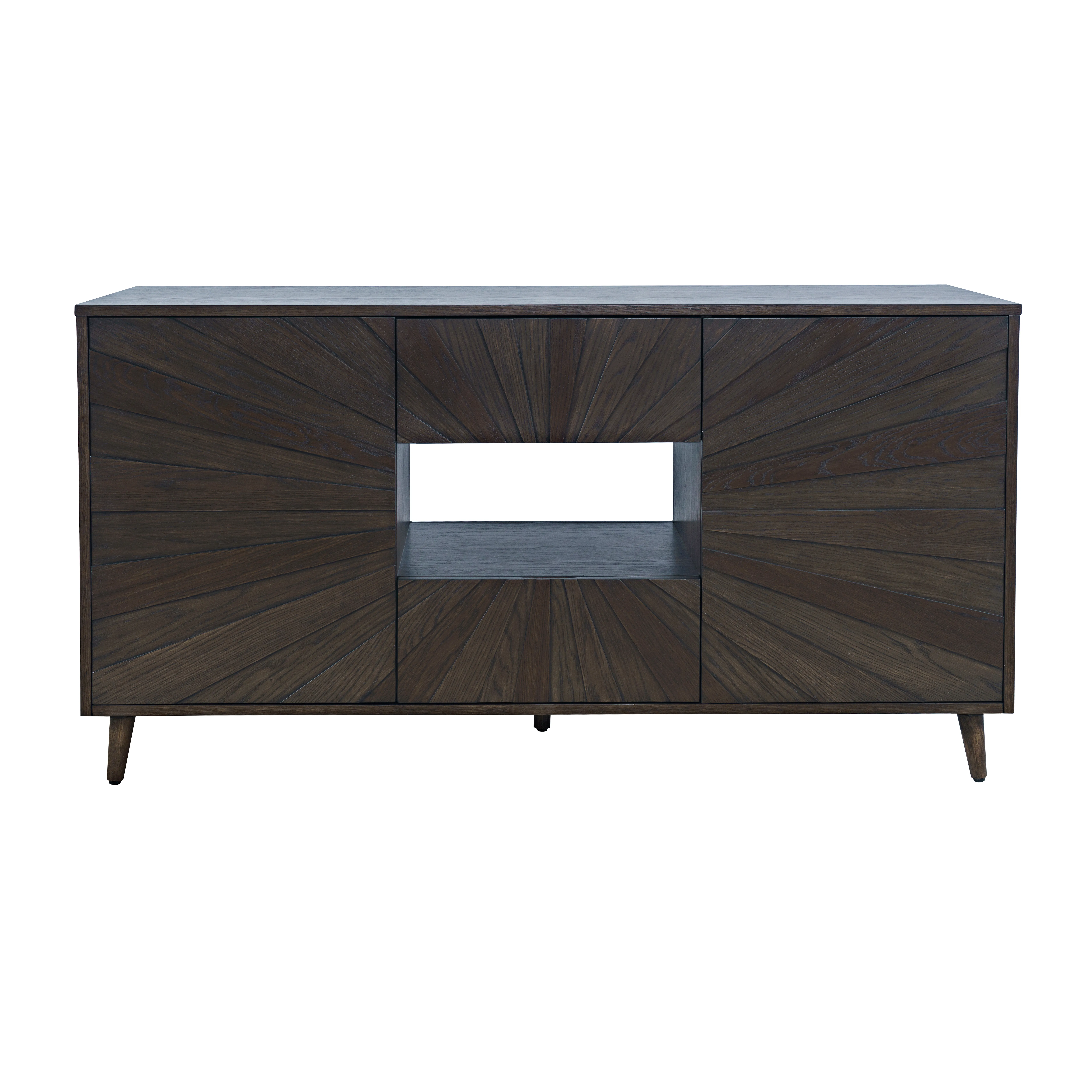 • -Two Doors and Two Drawers -Unique Modern Sunburst Design -Open Storage In Center Cabinet for Electronics -Easy assembly - no tools required - - -