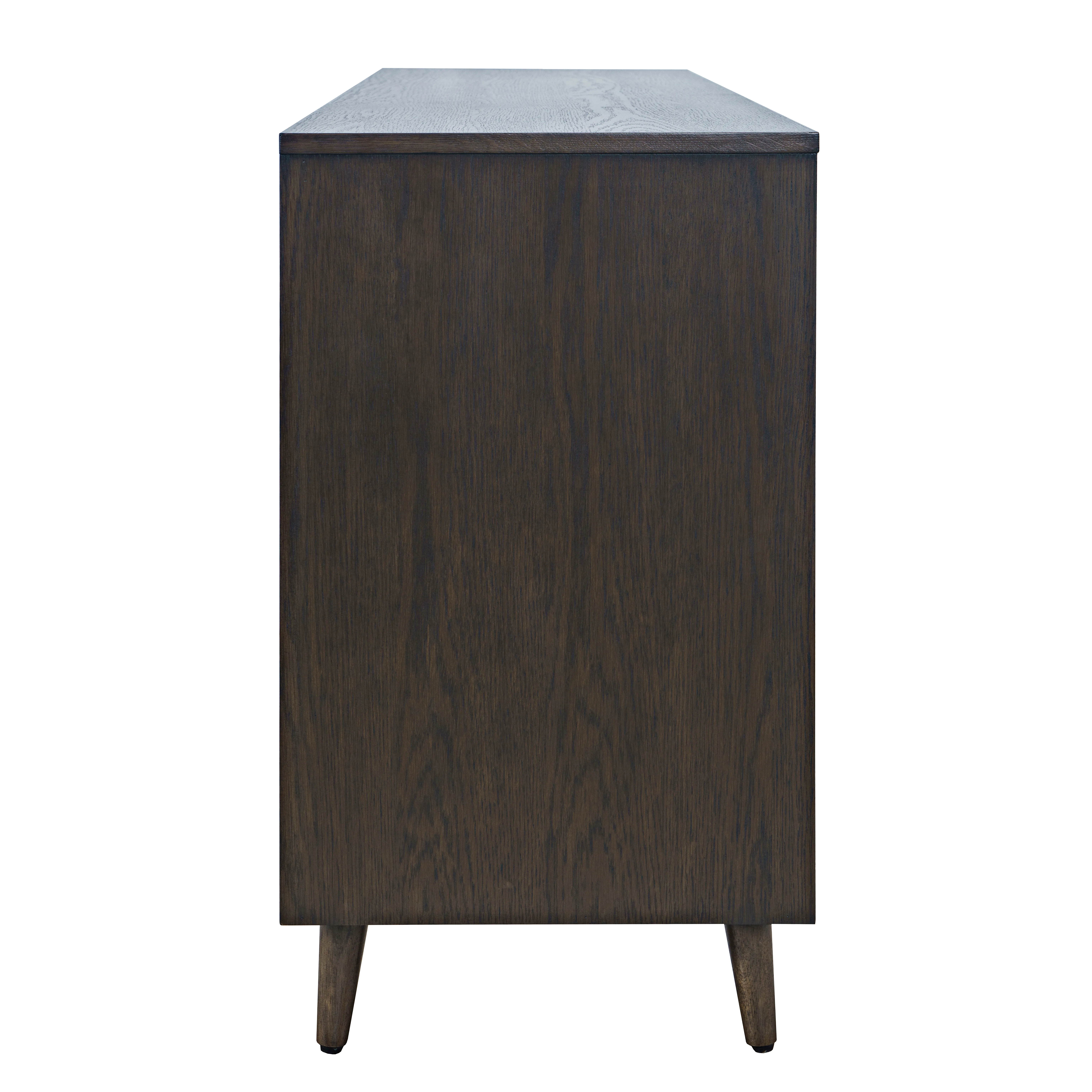 Elevate your entertainment space with the Reece Mid-Century Modern Starburst TV Stand Console, where timeless design meets practical functionality. Crafted with a combination of solid acacia wood and veneer, this piece features a stunning starburst pattern across its facade, making it a standout centerpiece for any room. Available in three sophisticated finishes and sizes, the Reece offers the perfect balance of style and versatility to suit your home decor. Thoughtfully designed, the cabinet includes two spacious storage compartments with adjustable shelves, two smooth-glide drawers, and a unique open cutout in the center - ideal for showcasing electronics, video game systems, or decor accents. The solid acacia construction provides a substantial feel that's built to handle the demands of everyday use. Rear cable cutouts keep cords organized and out of sight, ensuring a clean, clutter-free look. Best of all, assembly is quick and easy no tools are required; simply attach the legs, and it's ready to use. Whether as a TV stand, media console, or storage cabinet, the Reece transforms your living space with its striking design, practical features, and timeless appeal.