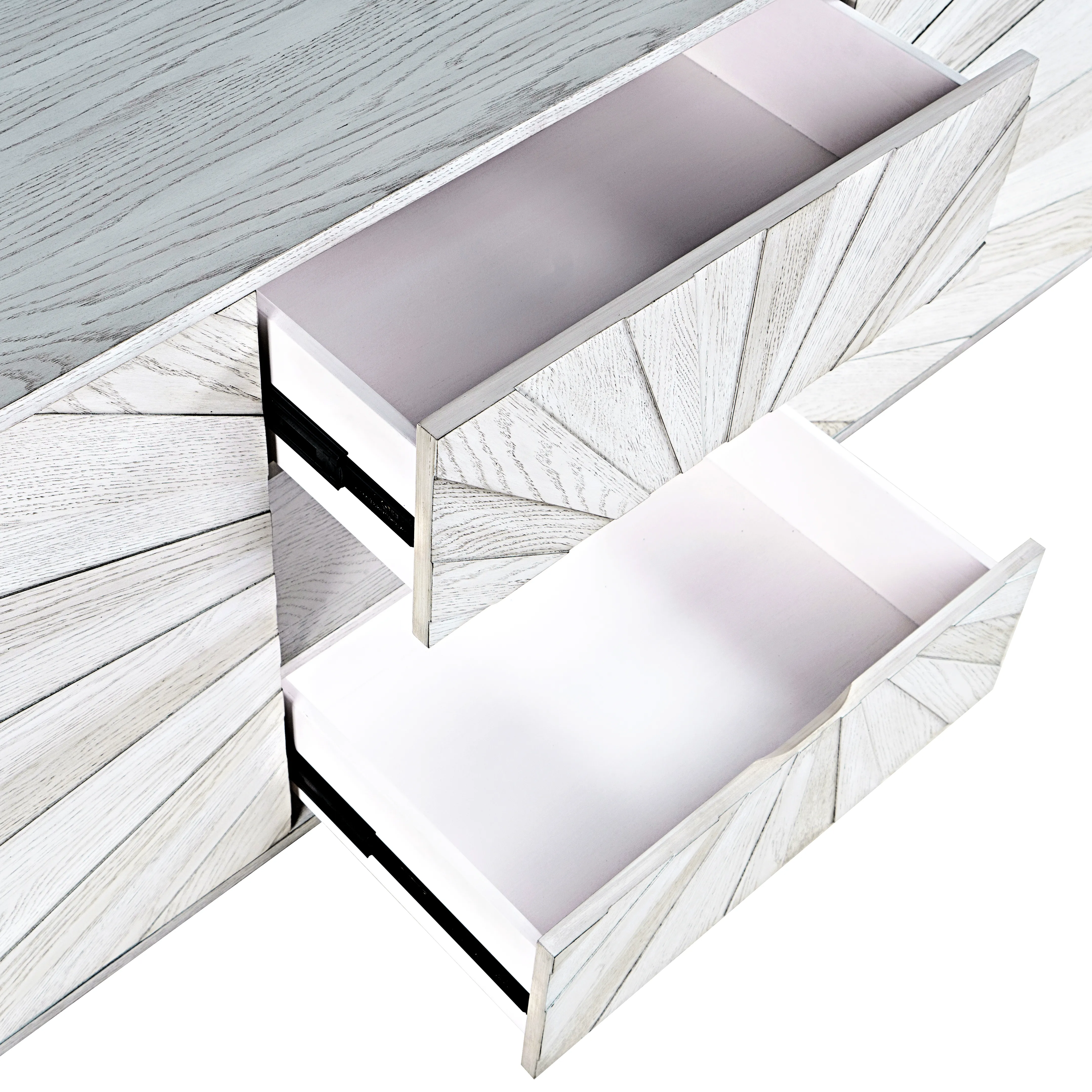 • -Two Doors and Two Drawers -Unique Modern Sunburst Design -Open Storage In Center Cabinet for Electronics -Easy assembly - no tools required - - -