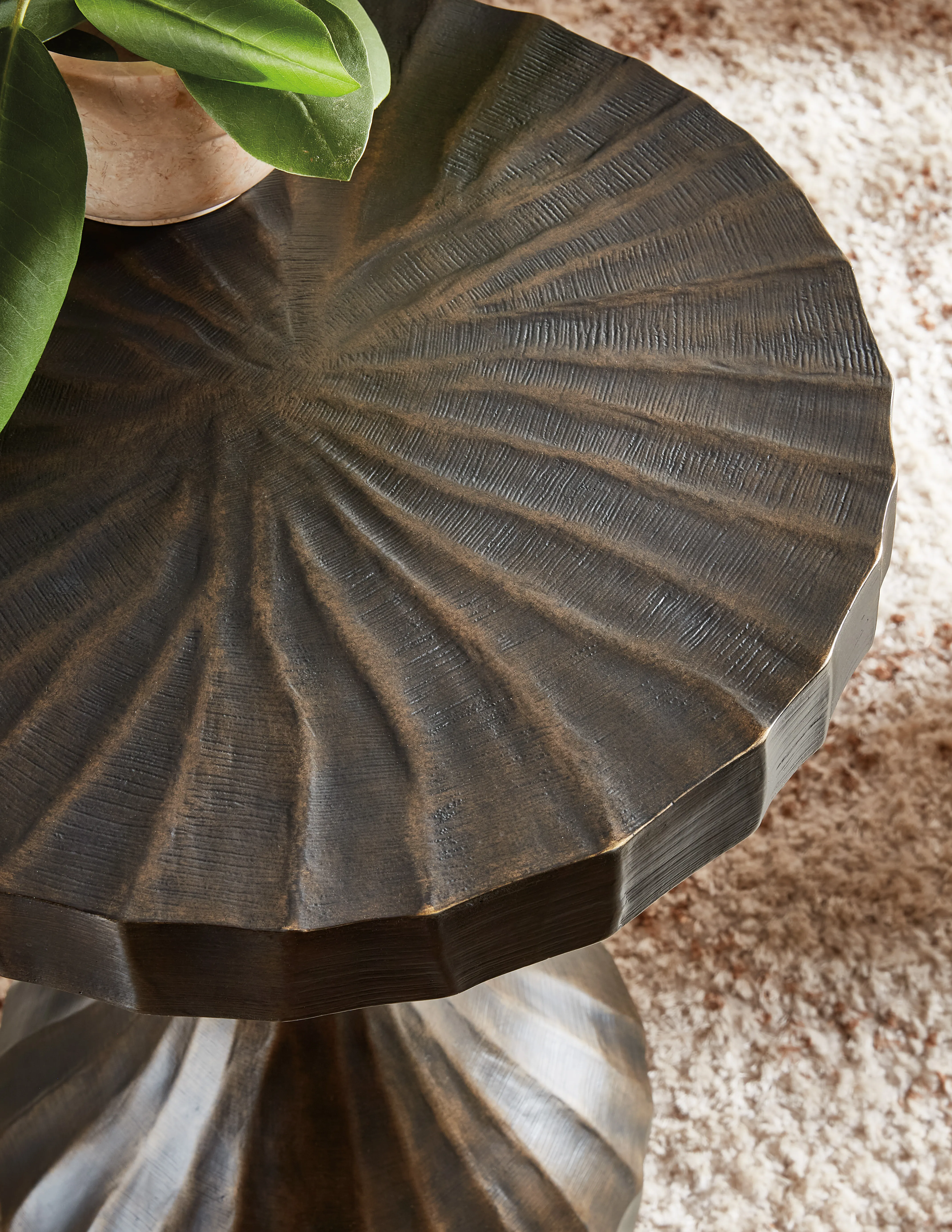 With a ribbed design and bronze-colored finish with highs and lows and textured feet, the Ferrous Accent Table has the appearance of a forged metal piece. At 17 inches round, it has a convenient compact footprint.