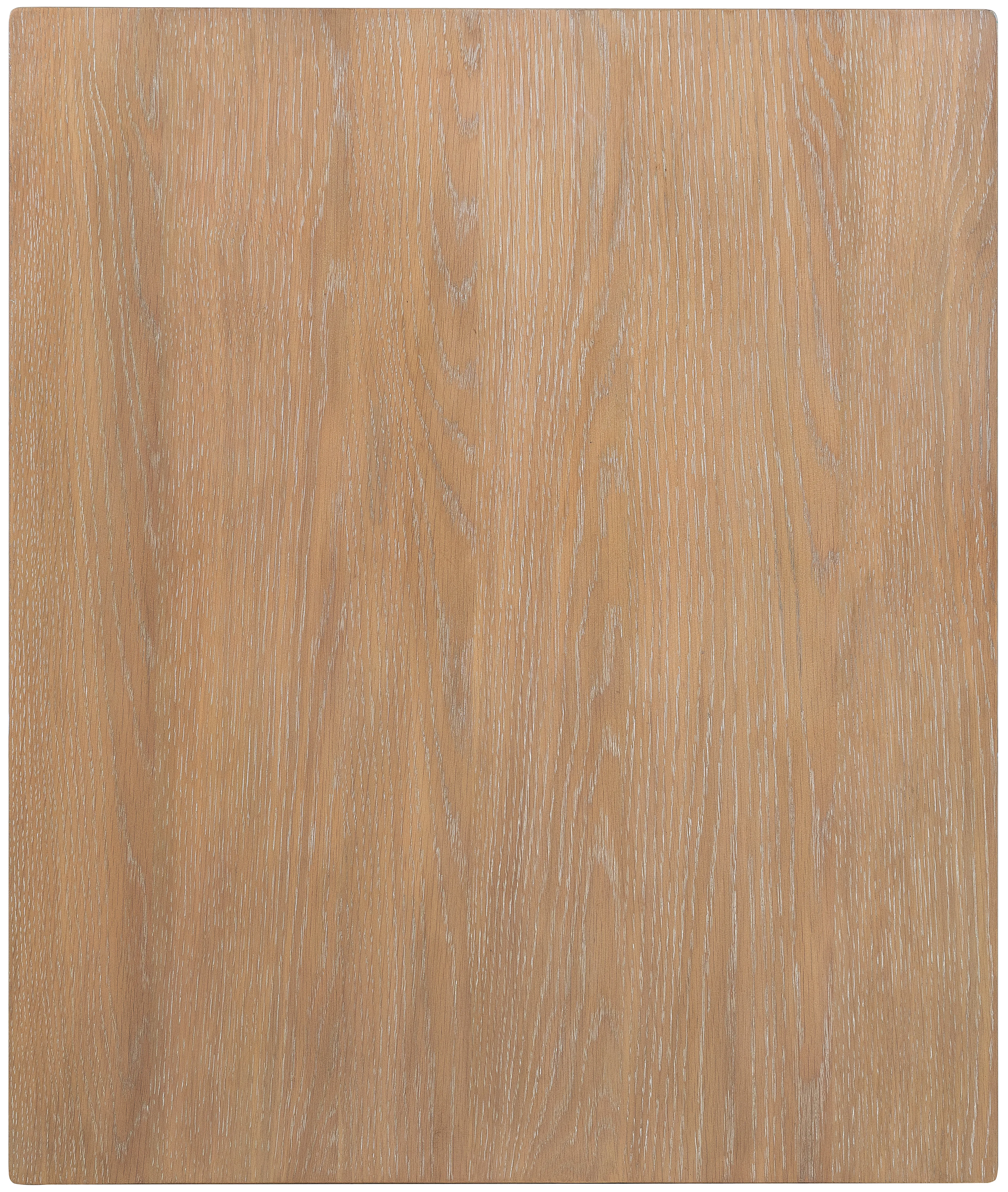 A rectangular accent table with scalloped edges, hidden locking storage, and soft-close door. Finished in light oak veneers for natural appeal.