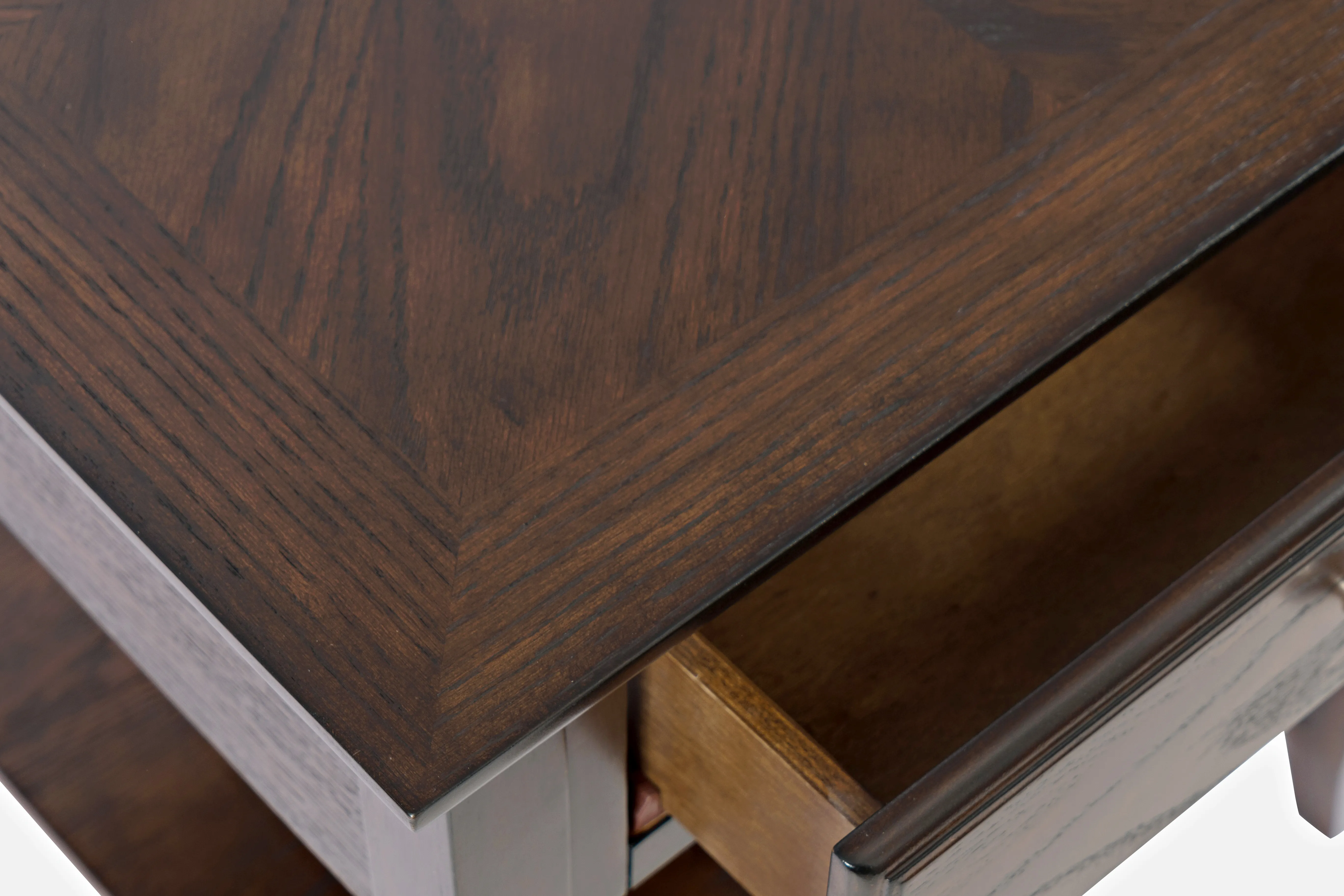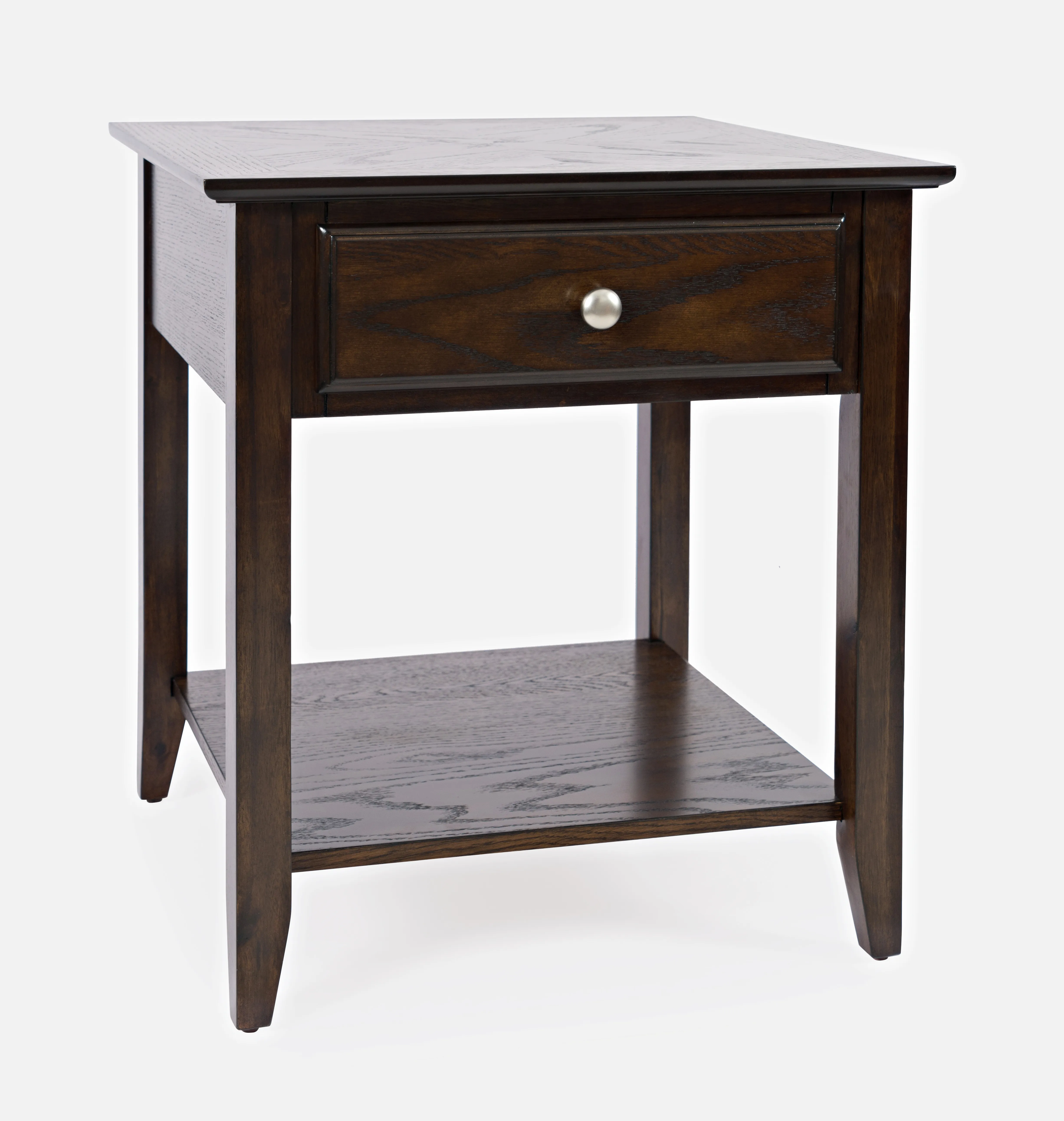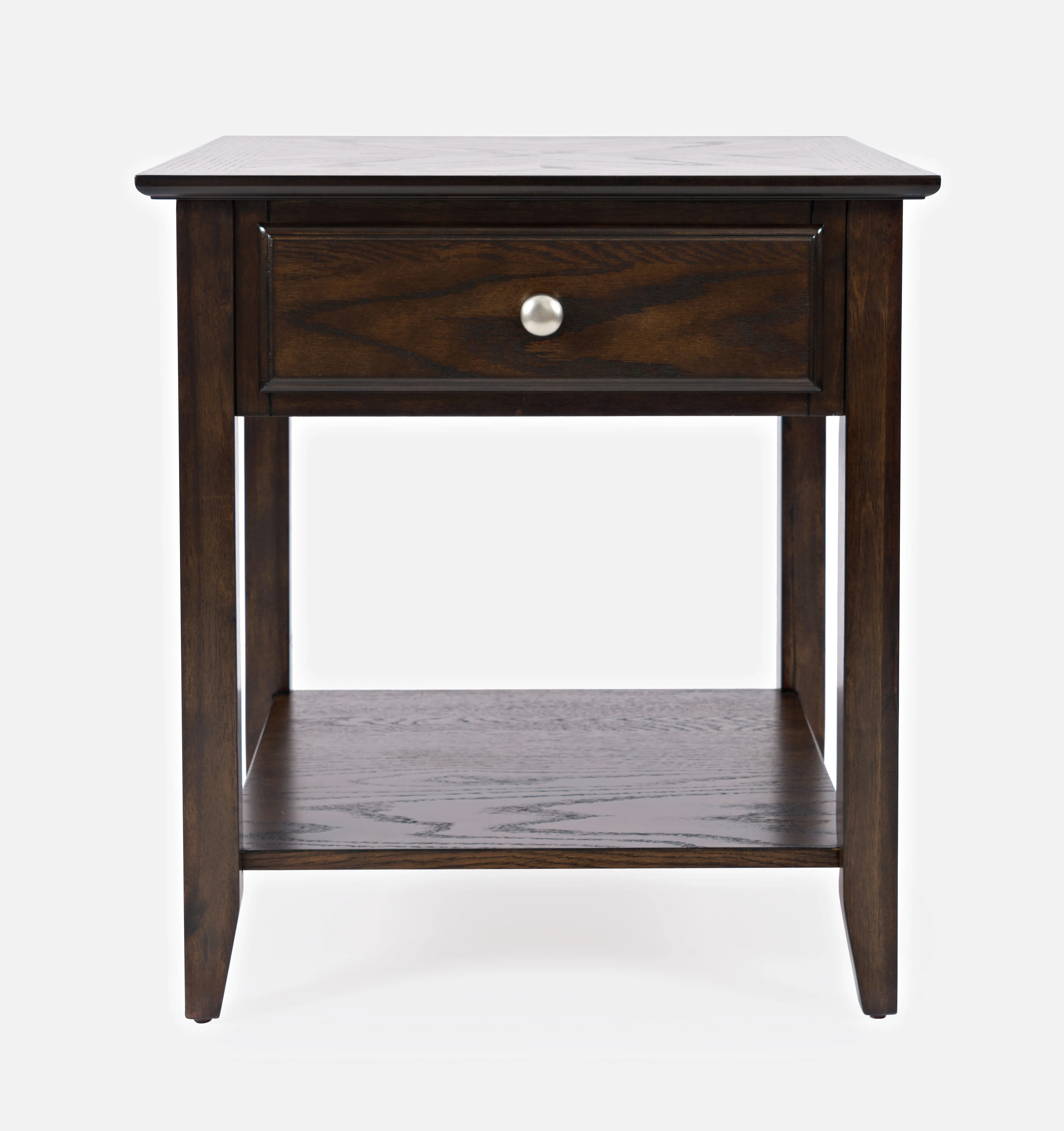 A smooth finish, a dovetailed drawer and brushed nickel hardware make this Espresso Modern End Table everyone's favorite. There is plenty of storage with the full-size drawer and one shelf, perfectly accenting your living room couch or a chair in the den, or bring it into the bedroom for a stylish nightstand. Available in Espresso Brown and Grey-Brown Carlton finishes.