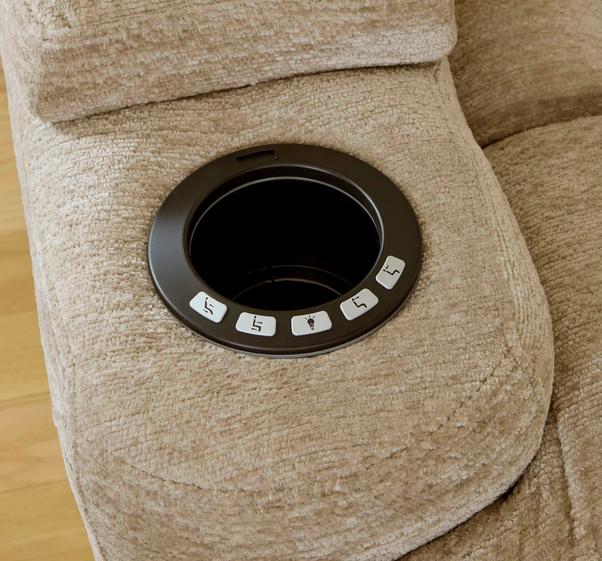 - Inset black cupholder with integrated reclining switch, displaying individual buttons for reclining, adjusting headrest, and illuminating the ambient blue cup holder light with one USB port
