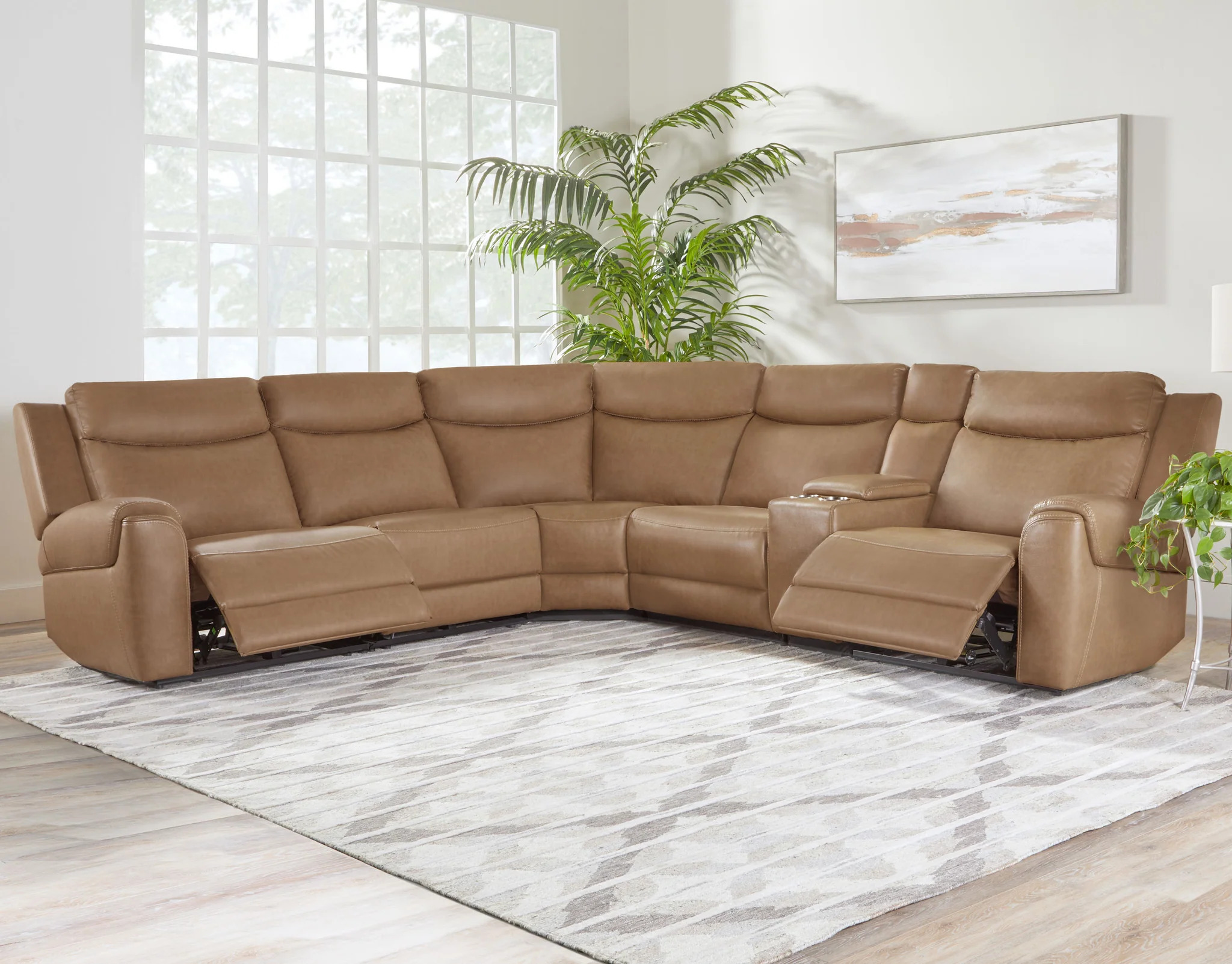 Combining comfort and modern convenience, Momentum is a stylish addition to any contemporary home. With a zero-gravity power recline and independently adjustable power headrests, you can control heat, massage, and lumbar support with one remote. The console includes one Bluetooth speaker, stainless steel cup holders, a hidden compartment with USB and USB-C ports, and a 110-volt charger. The slimline, padded armrests and easy-to-clean synthetic leather fabric make this group a must-have.