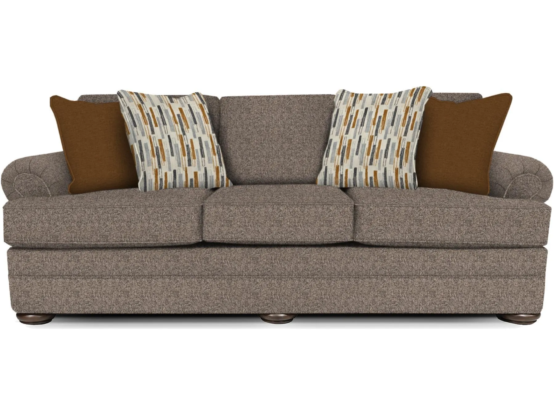 Our Knox collection is anything but ordinary, with its transitional styling it stands out in any room. This series has a roll arm, bun foot, T-cushion, and optional antique brass nailhead trim on the arms and base. Available as a sofa, loveseat, chair, ottoman, and sectional.