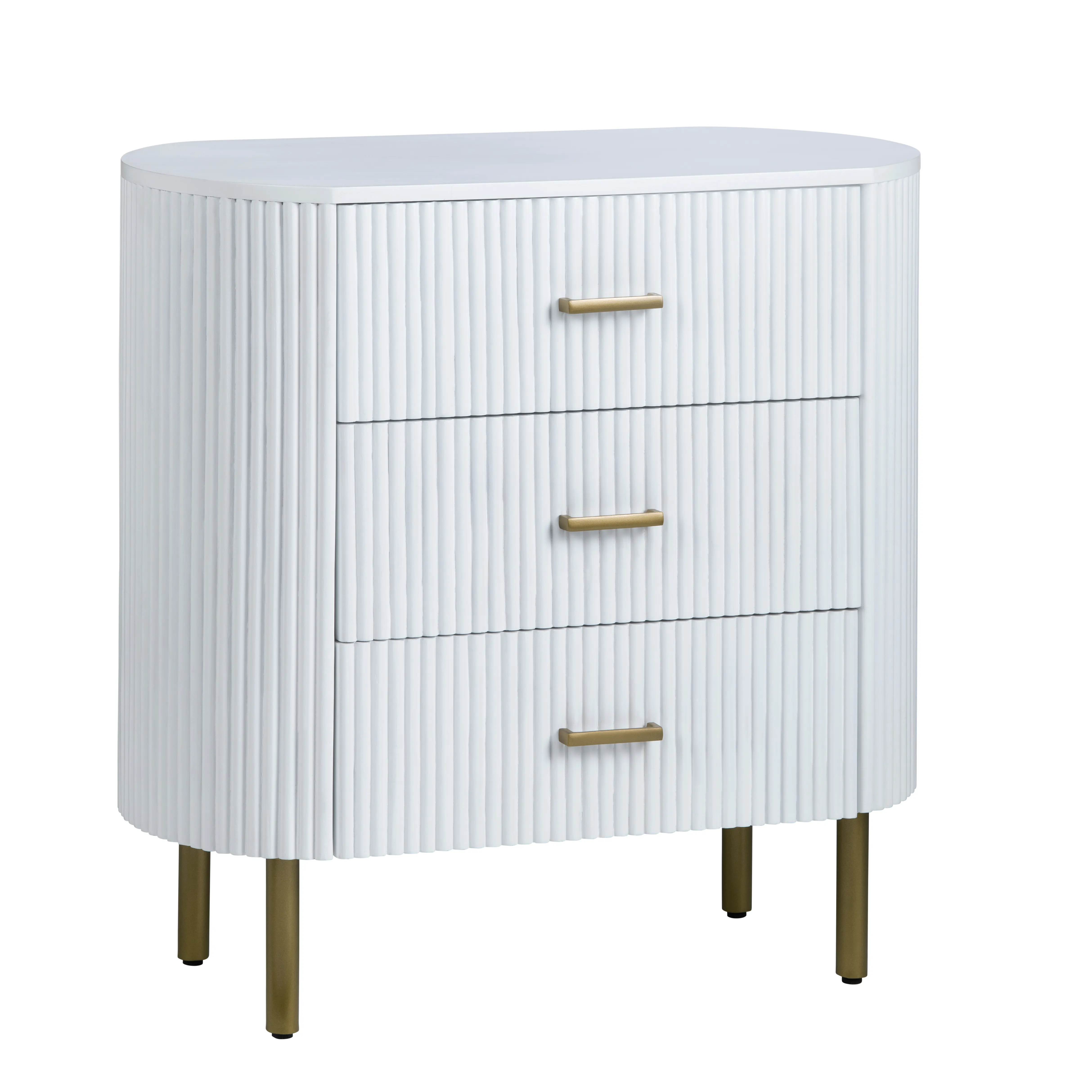 Crisp, bright and texture‑rich. Vertical fluting and soft‑oval corners give this matte‑white chest designer dimension, while slim brass hardware and legs deliver subtle shine. Three drawers corral clutter from foyer to guest room with effortless style.