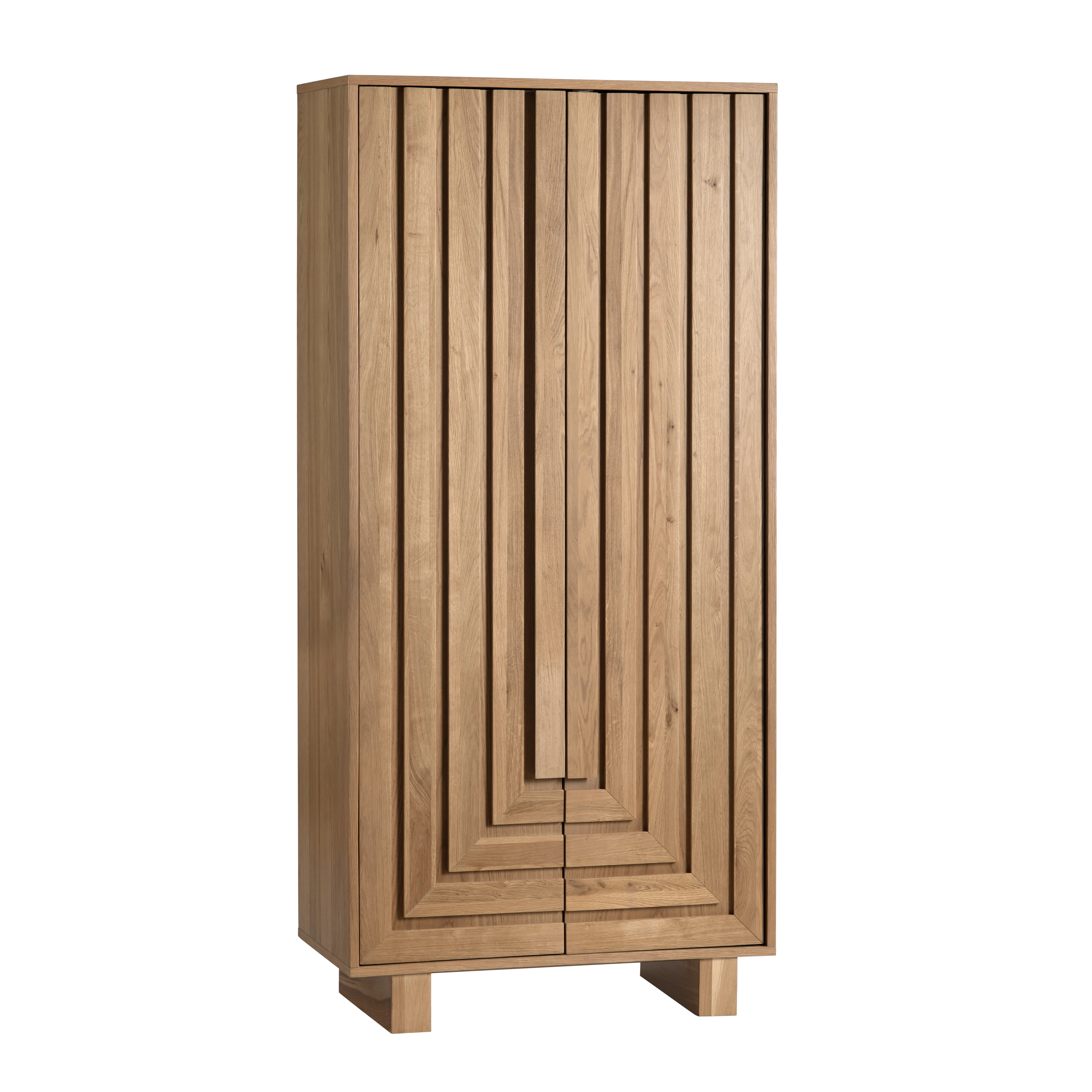 Crafted from solid oak wood with a natural stained finish, this rectangular cabinet exudes warmth and elegance. The two wooden doors feature an intricate geometric pattern and are fitted with upgraded European hinges and magnetic closures for a seamless look. Inside, seven adjustable shelves offer customizable storage. Supported by sturdy block feet, this cabinet arrives fully assembled, making it an instant statement piece in any space