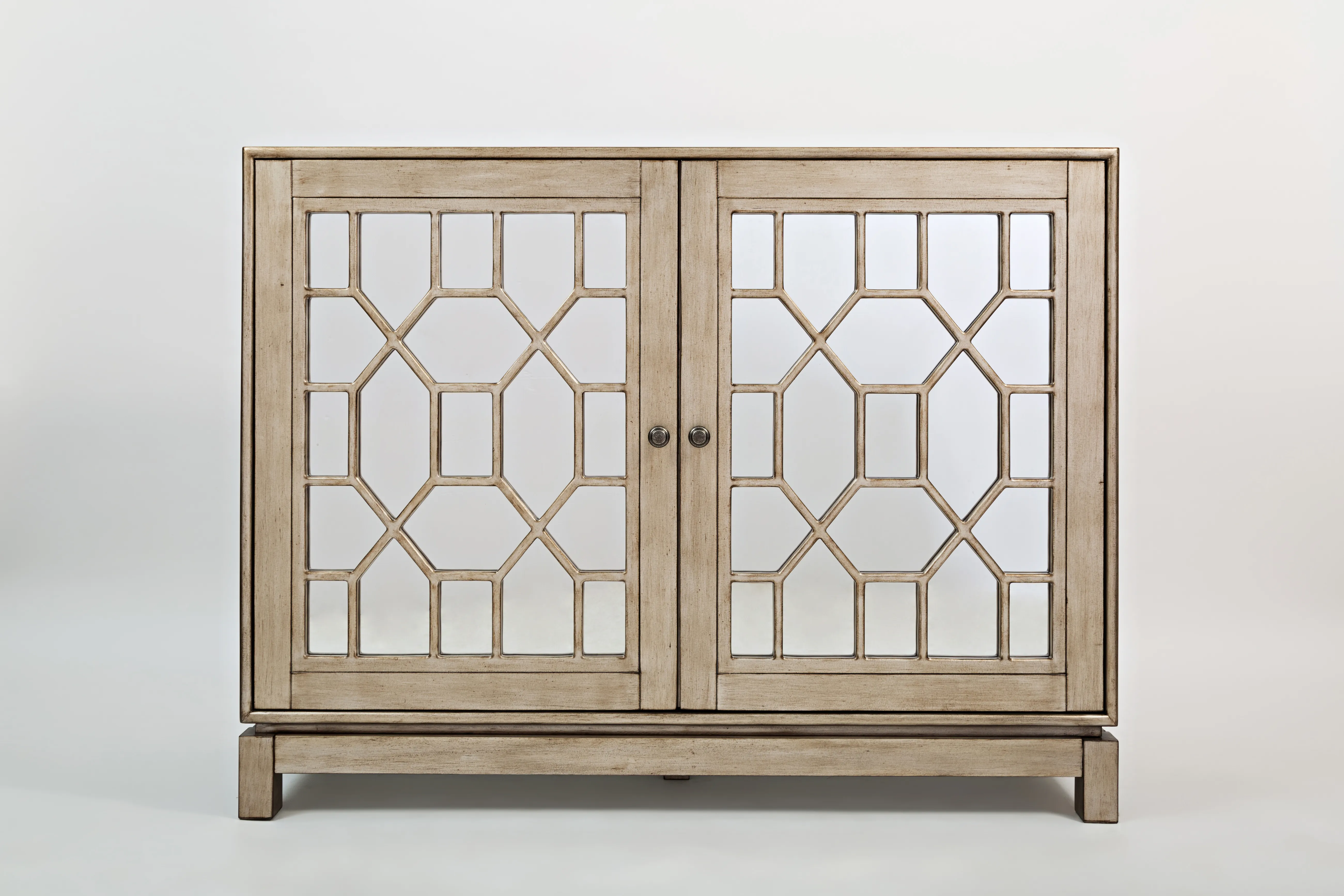 Make a bold statement with Jofran's Casa Bella Glam 50" Mirrored Console, a stunning piece that embodies vintage Hollywood elegance. This console features intricate molding over mirrored doors, creating a dramatic focal point in any room. The vintage silver finish adds a touch of glamour, while the two doors open to reveal ample interior storage, combining style with functionality. Ideal for use in a living room, entryway, or dining area, this console provides both a striking visual appeal and practical storage solutions.